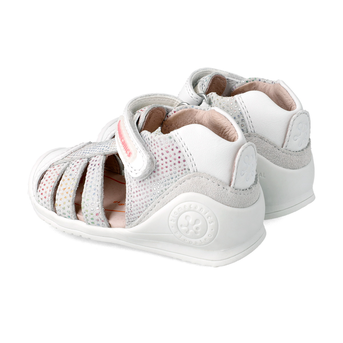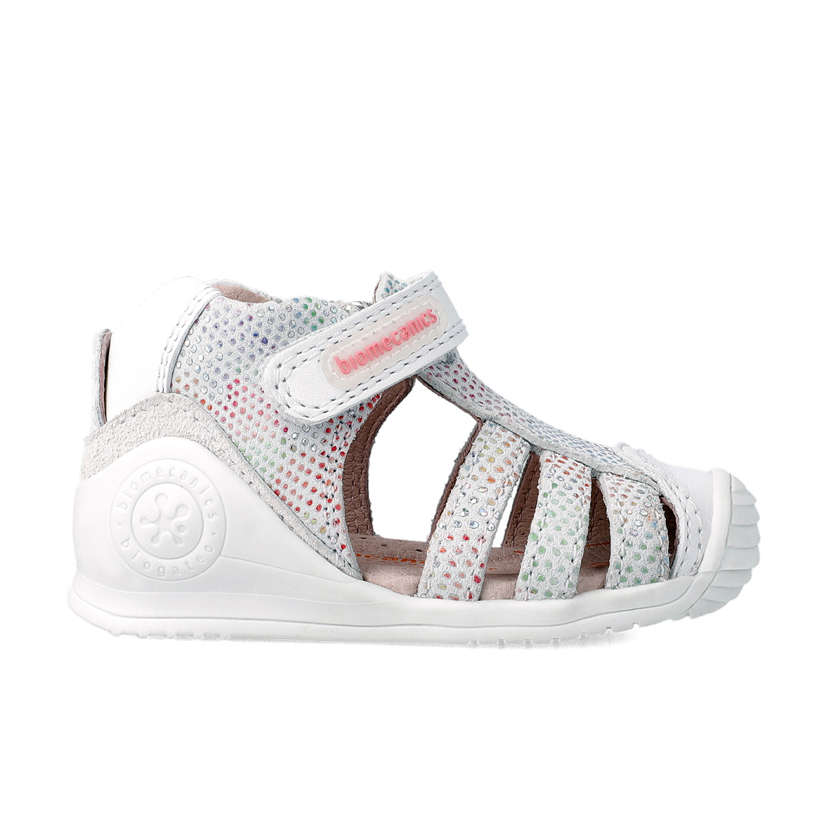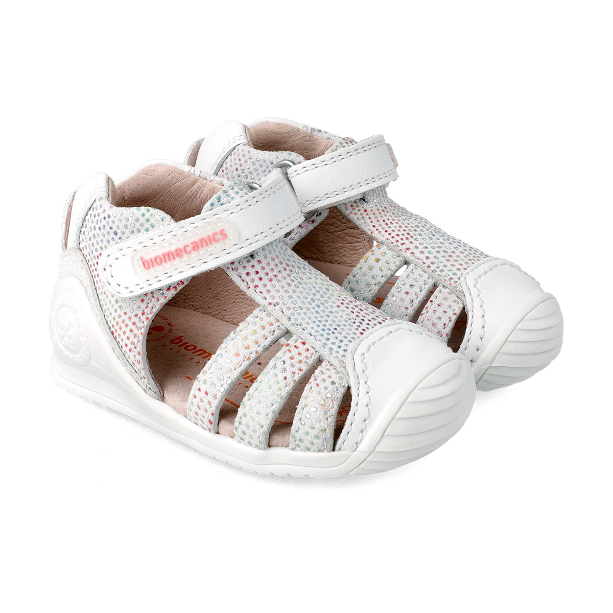 Dívčí bílé sandálky španělské značky BIOMECANICS. Svrchní materiál je vyroben z kůže. Zapínání na suchý zip na nártu. Uzavřená špička částečně chrání proti okopům. Podešev je vyrobená z kvalitního syntetického materiálu a je maximálně pružná a lehká. Navrženo ve spolupráci se španělskou asociací pediatrů.