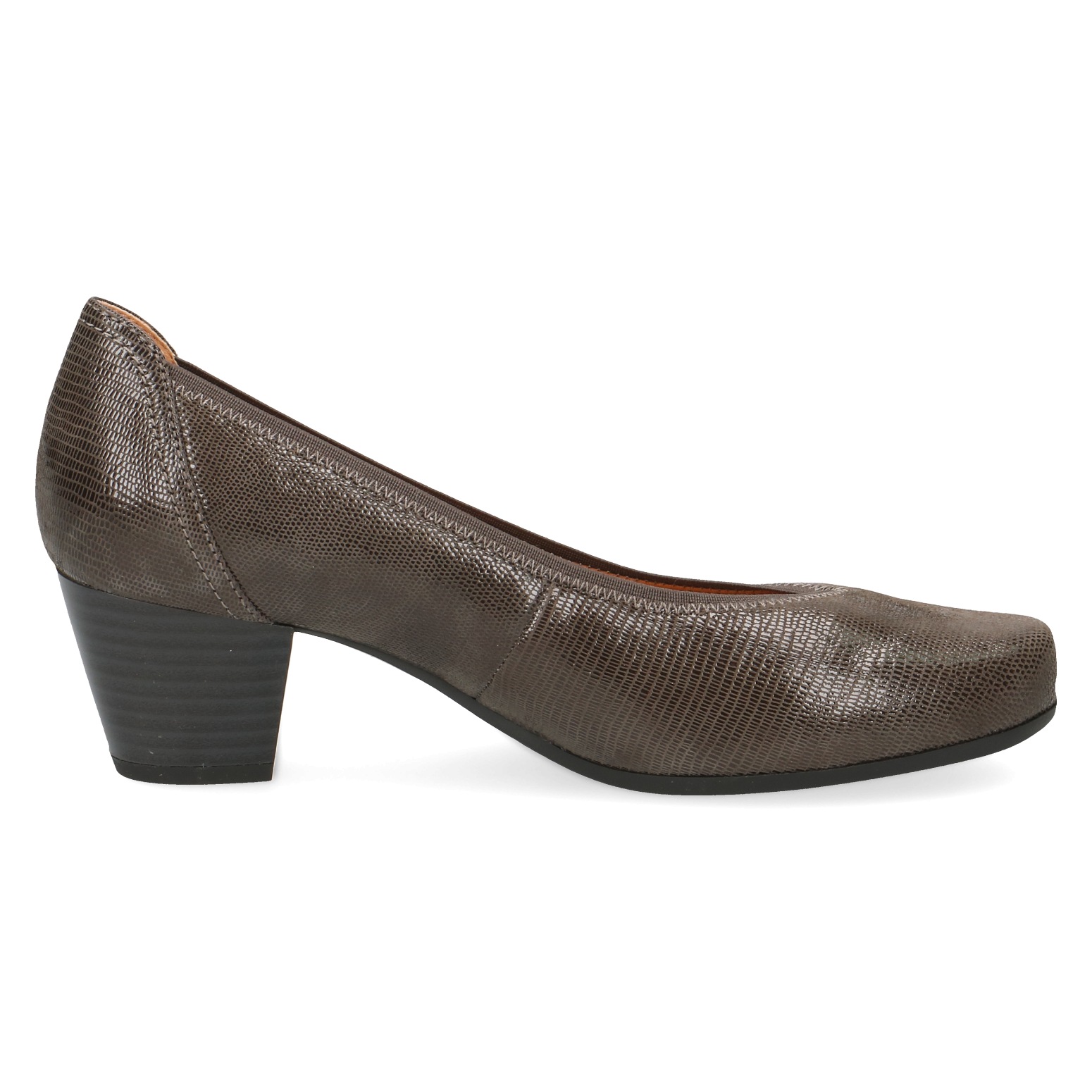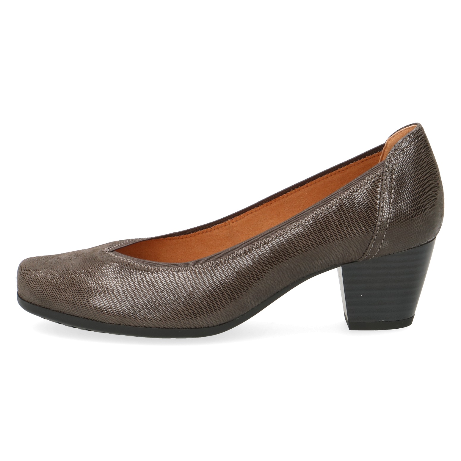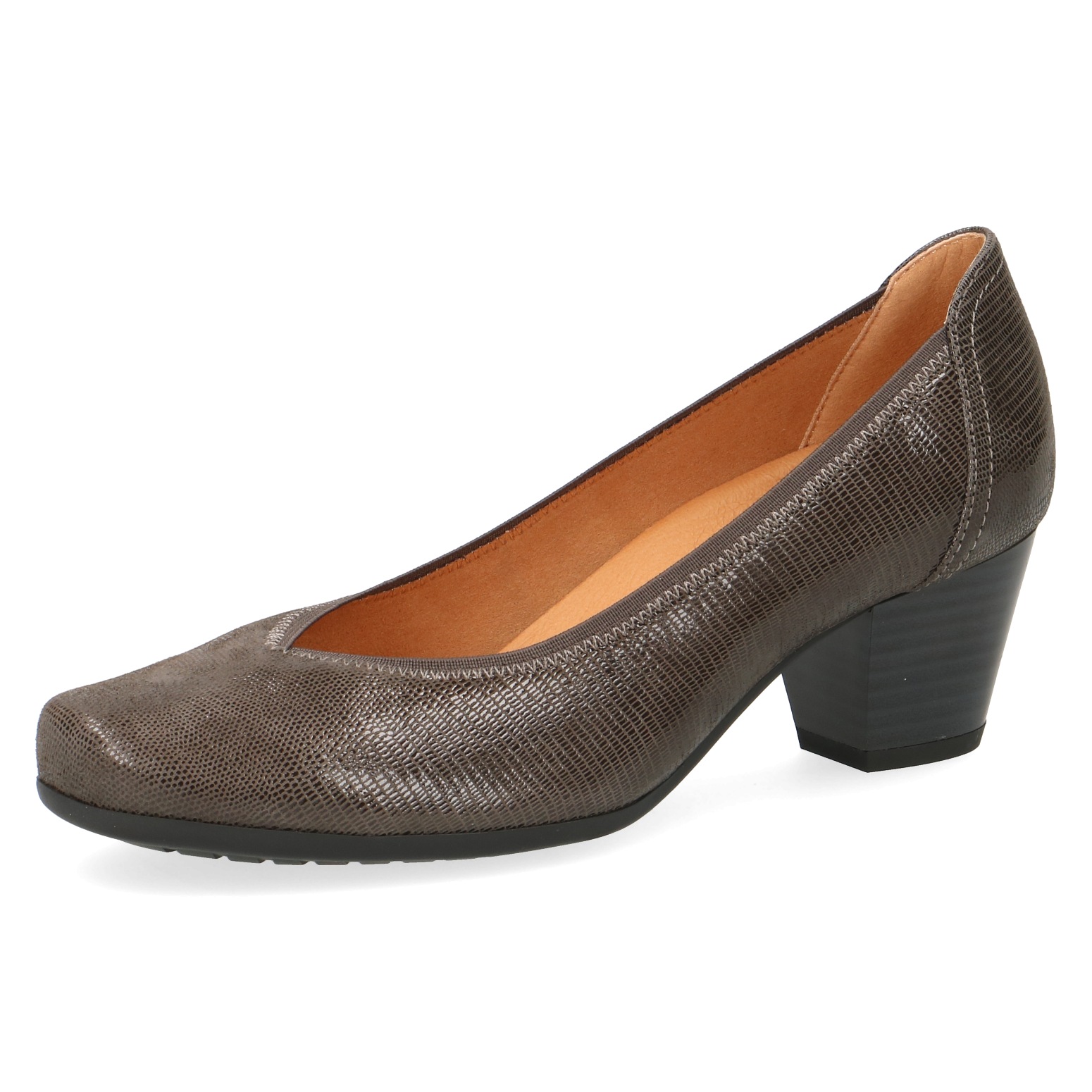 Elegantní dámské šedé lodičky z přírodní kůže. Svršek je vyroben z leštěné kůže - semiš a látky. Vnitřek obuvi tvoří textilní materiál, stélka je kožená. Podešev je vyrobena z kvalitního syntetického materiálu.