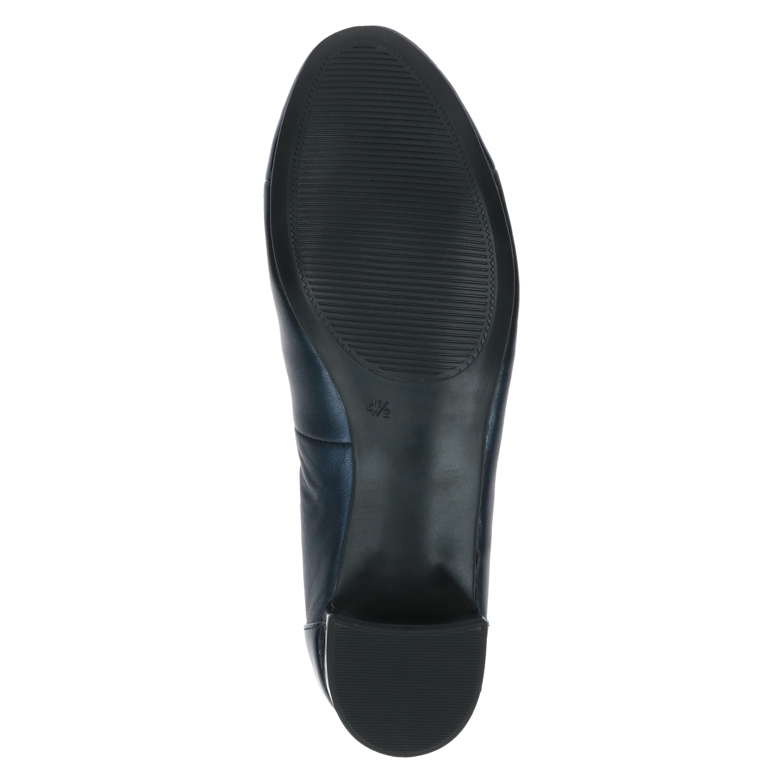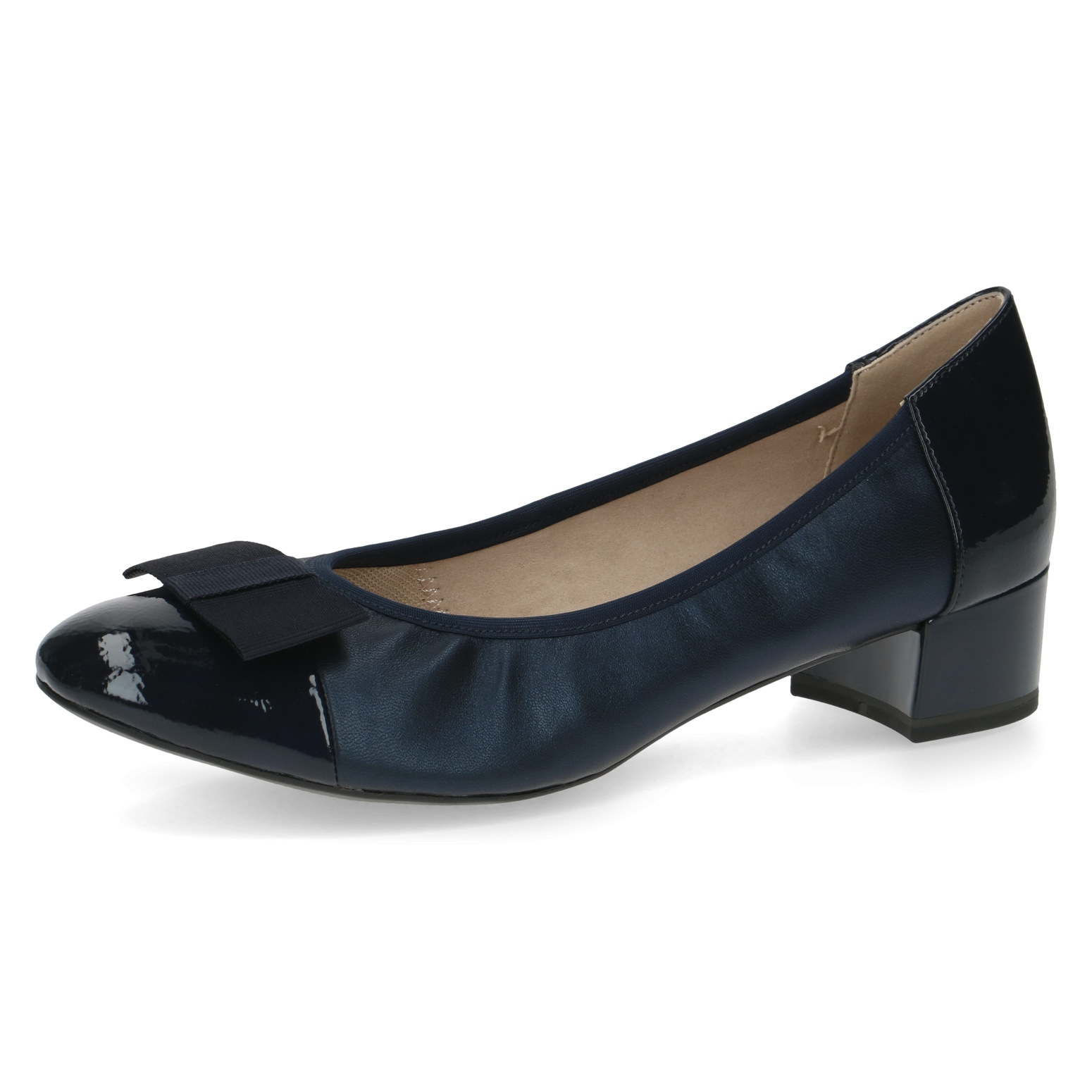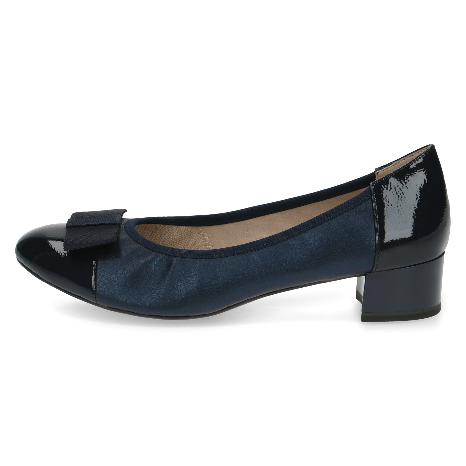 Dámské modré lodičky s lesklou špičkou a ozdobnou mašličkou. Vnitřní stélka je kožená. Obuv je stabilní díky nižšímu pohodlnému podpatku. Lepší odpružení paty uleví páteři a kloubům. Podešev je vyrobena z kvalitního syntetického materiálu.