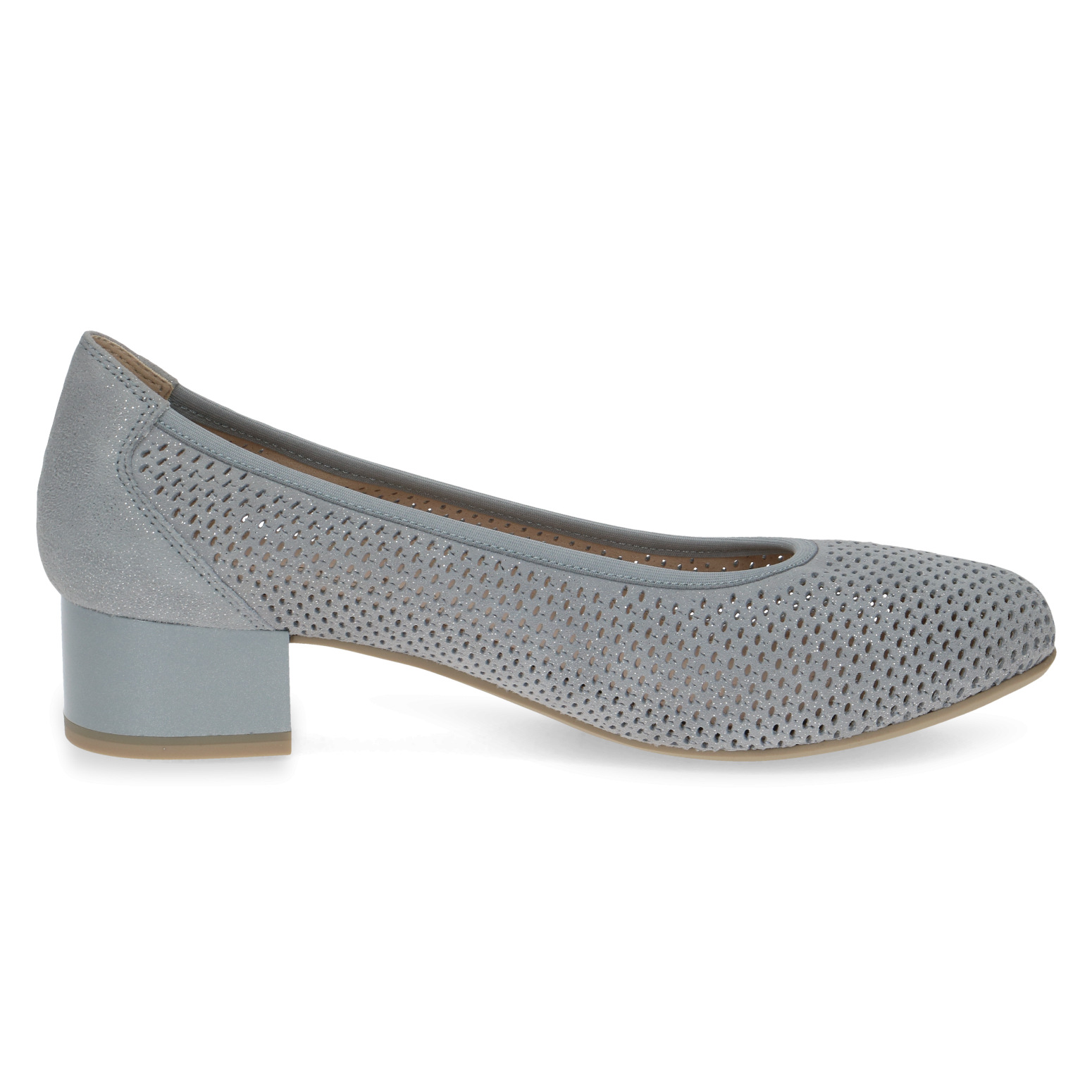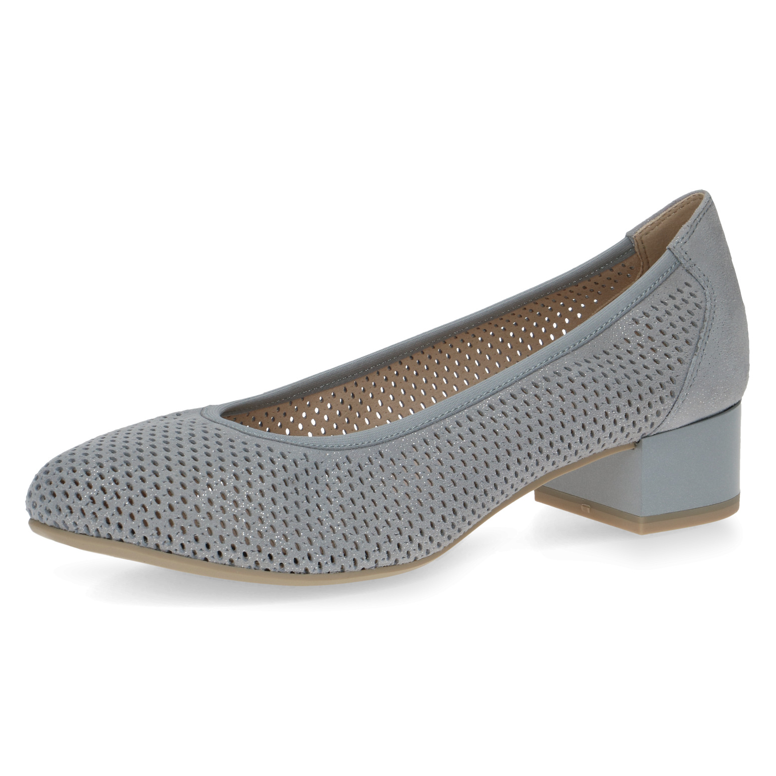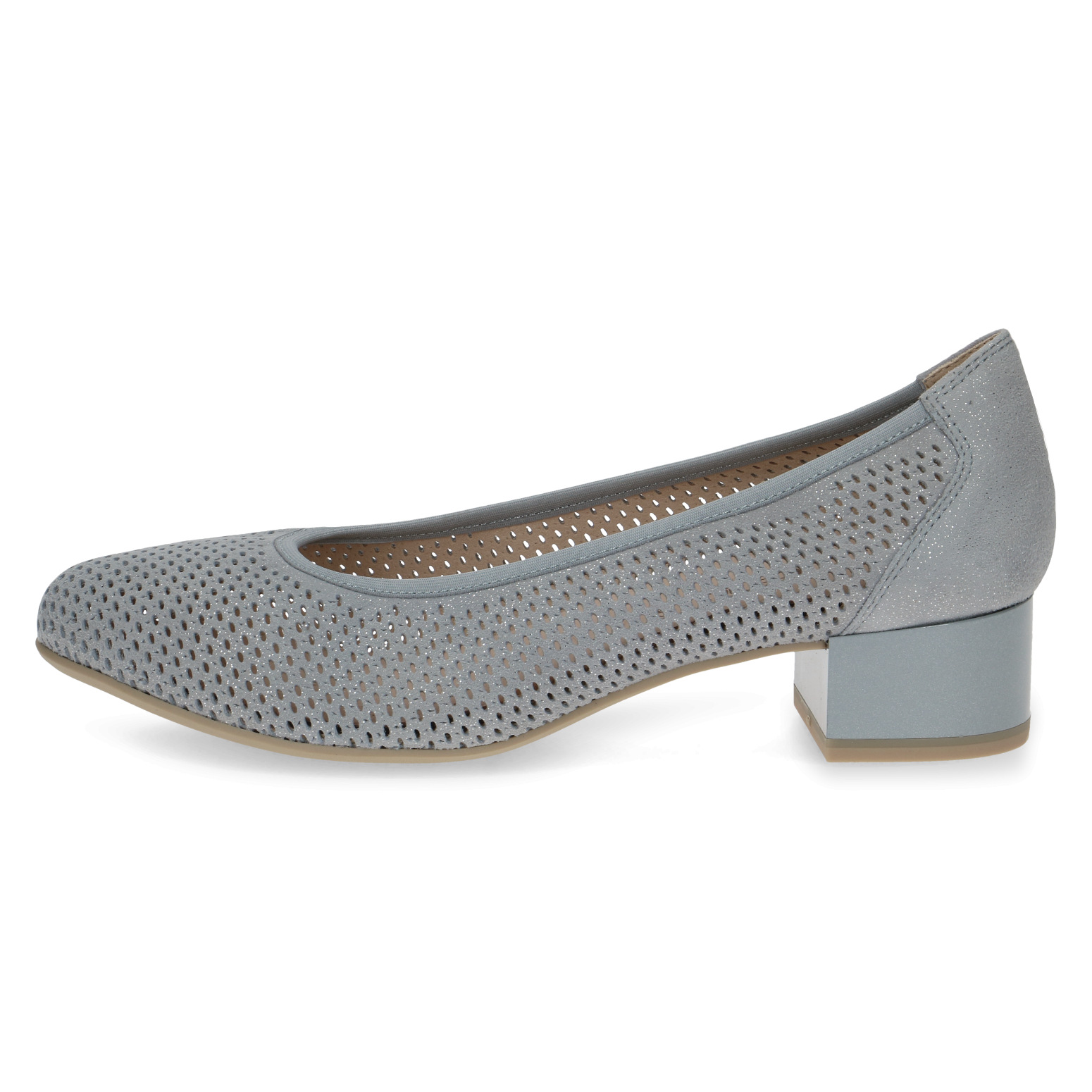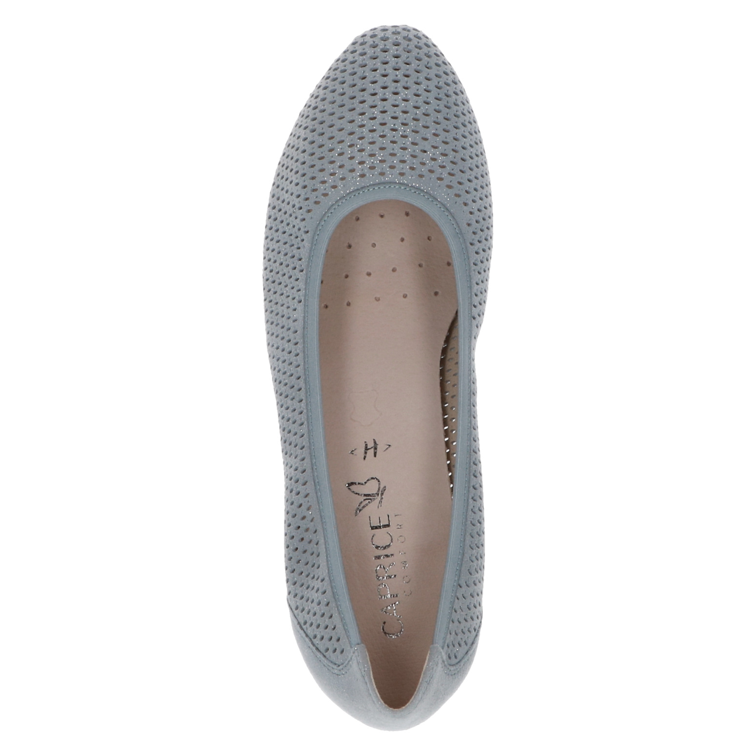 Dámské světle modré lodičky značky Caprice. Svrchní materiál tvoří kůže. Obuv je perforovaná. Kožená stélka Vám zajistí maximální pohodlí při chůzi. Širší podpatek zaručuje pohodlné nošení. Podešev je vyrobena z velmi kvalitního syntetického materiálu. Obuv je v šiři H - vhodná i pro širší chodidlo.