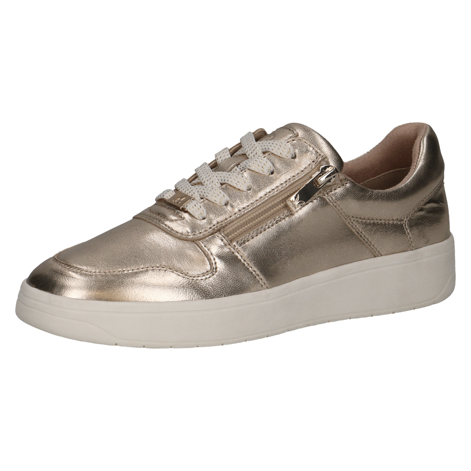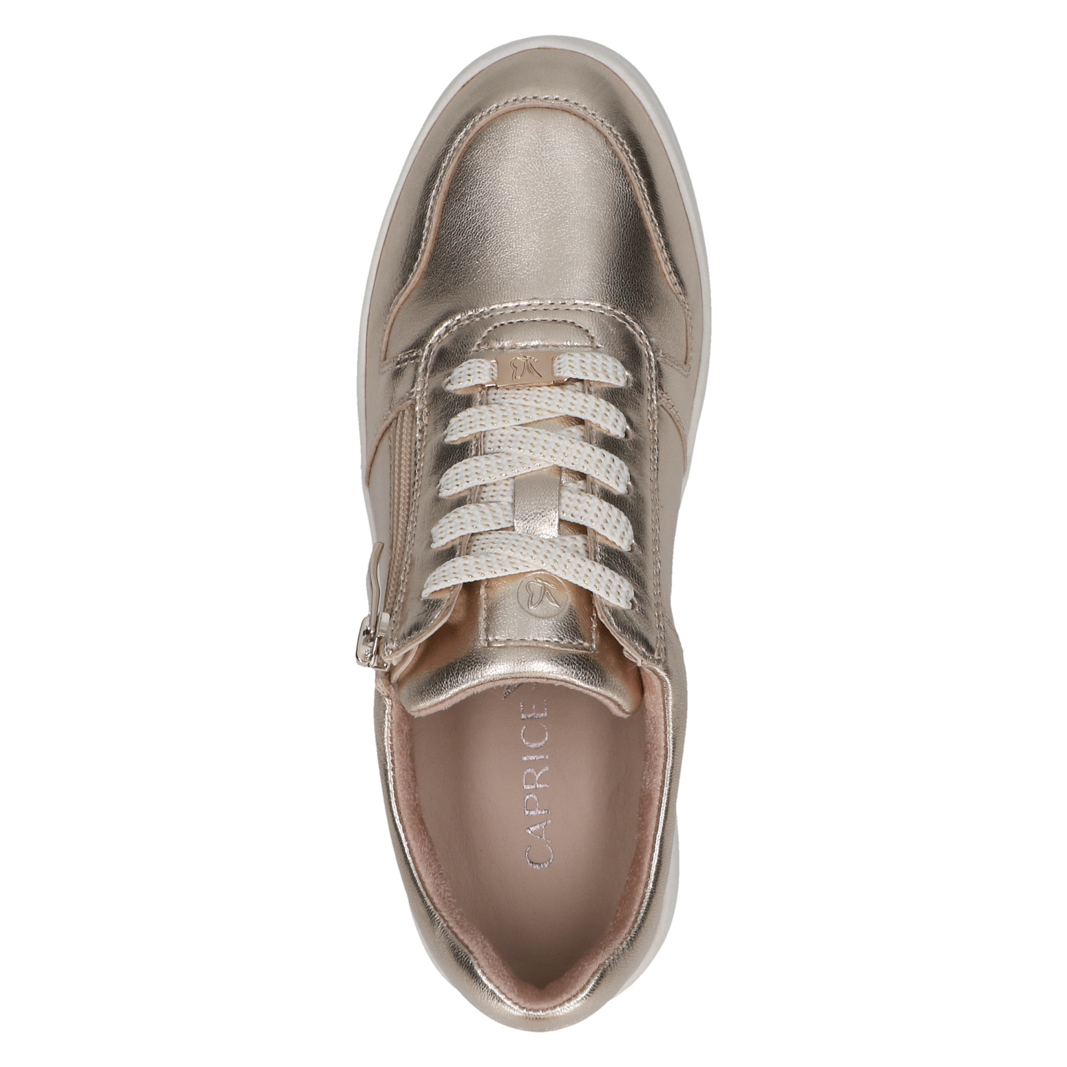 Dámské tenisky v lesklé zlaté barvě značky Caprice. Svrchním materiálem je kůže. Pro snadnější obouvání je u šněrování funkční zip. Vyjímatelná kožená stélka umožňuje její výměnu a zvyšuje tím pohodlí při nošení bot. Bota je uvnitř krásně měkká, zvyšuje se tím komfort při nošení.