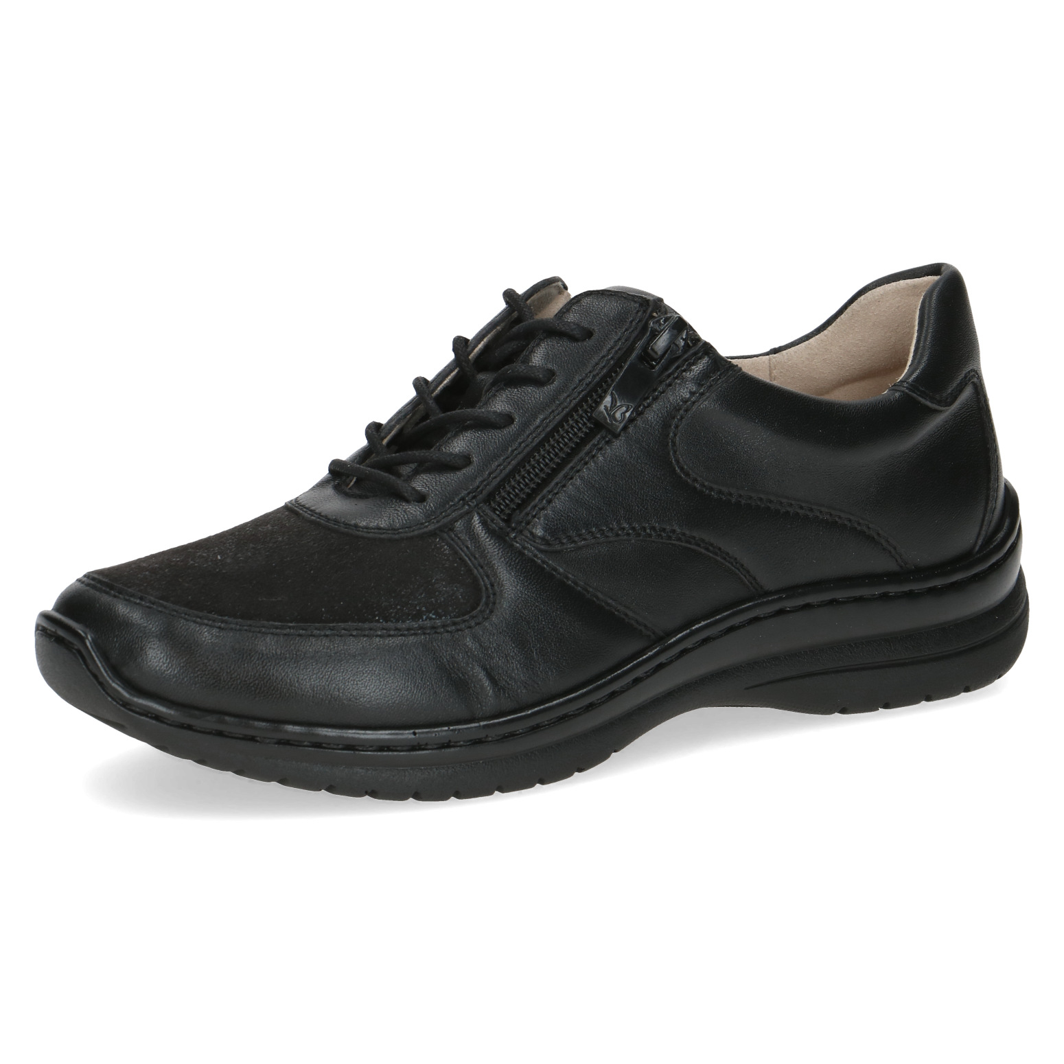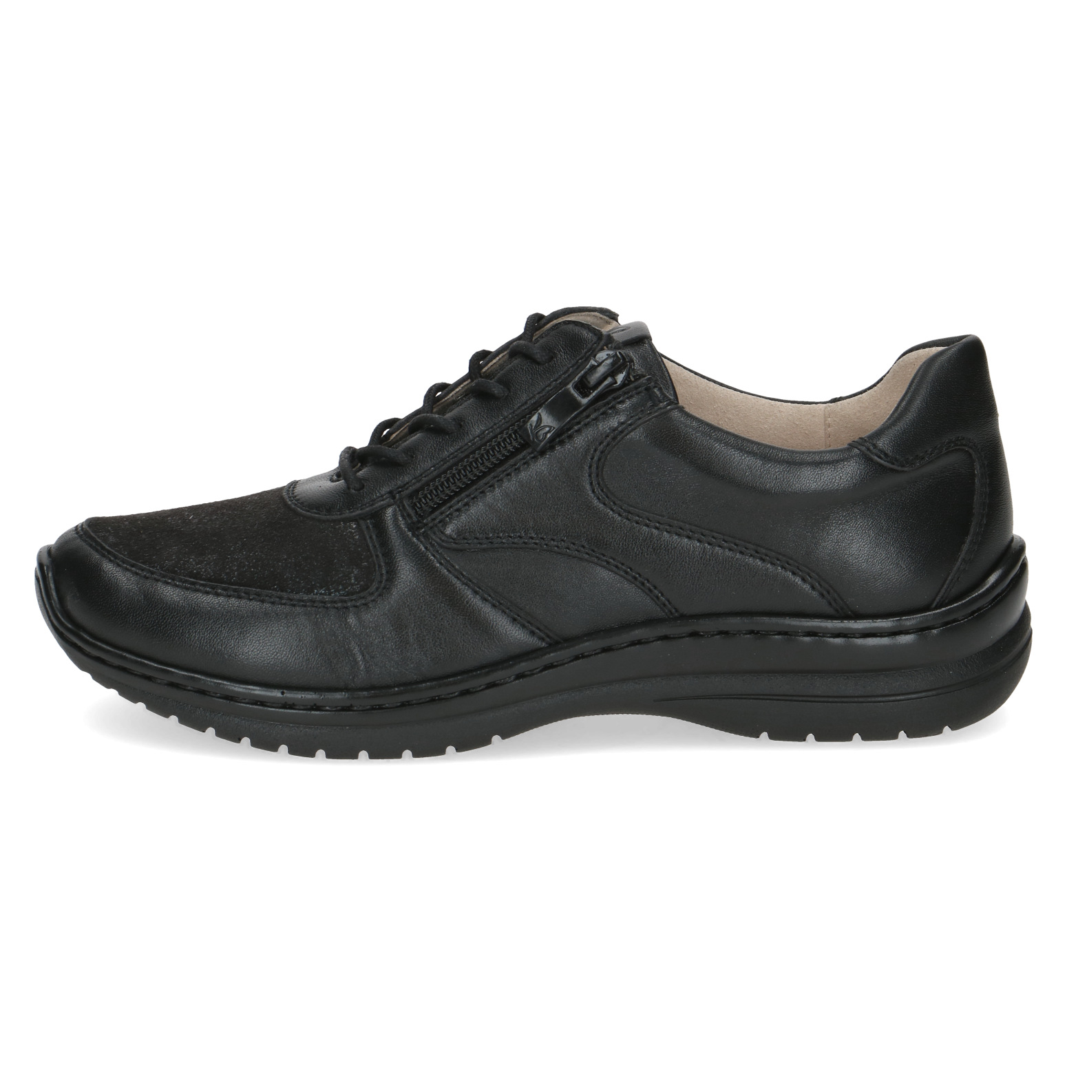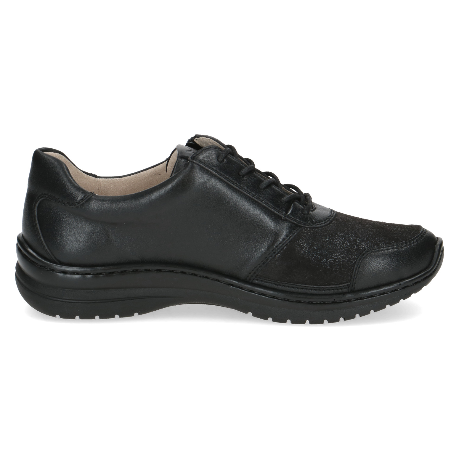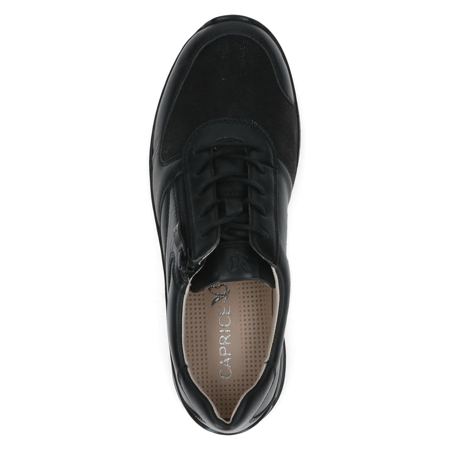 Dámské kožené šněrovací tenisky v černé barvě značky Caprice. Pro snadnější obouvání je u šněrování funkční zip. Vyjímatelná kožená stélka umožňuje její výměnu a zvyšuje tím pohodlí při nošení bot. Vzduchové bublinky umístěné zespod stélky tlumí nárazy při chůzi a zajišťují lepší odvětrávání boty. Boty jsou měkké a krásně ohebné.