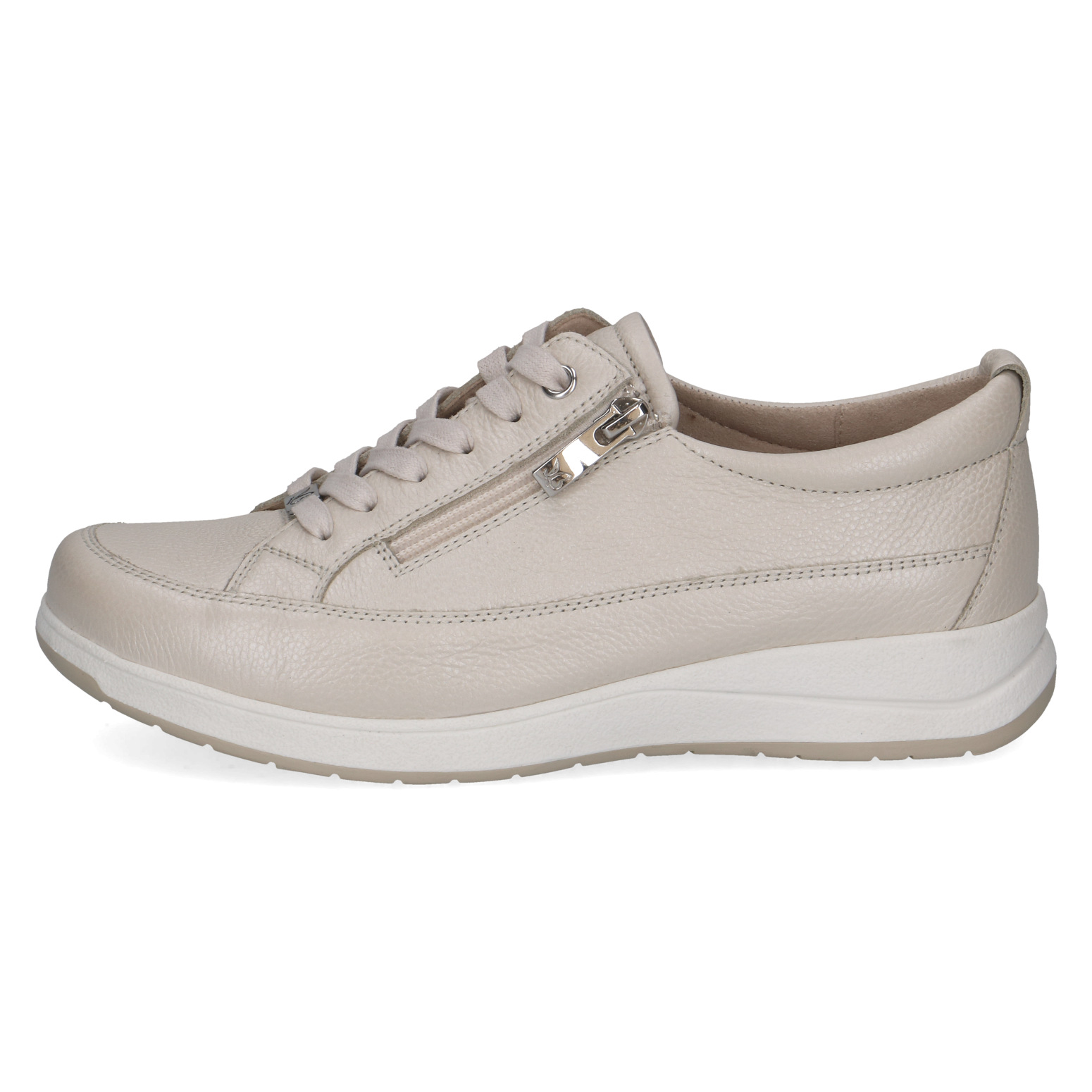 Dámské kožené šněrovací tenisky v perleťově - béžové barvě značky Caprice. Pro snadnější obouvání je u šněrování funkční zip. Šířka K (extra široká) a kulatá špička nabízí Vaši noze potřebný prostor. Vyjímatelná kožená stélka umožňuje její výměnu a zvyšuje tím pohodlí při nošení bot. Vzduchové bublinky umístěné zespod stélky tlumí nárazy při chůzi a zajišťují lepší odvětrávání boty. Boty jsou měkké a krásně ohebné.