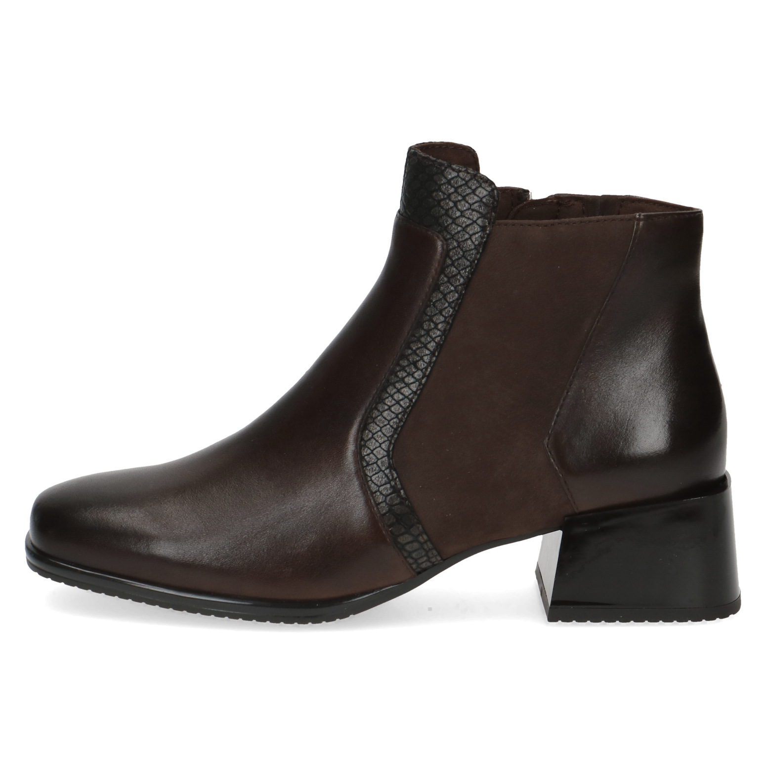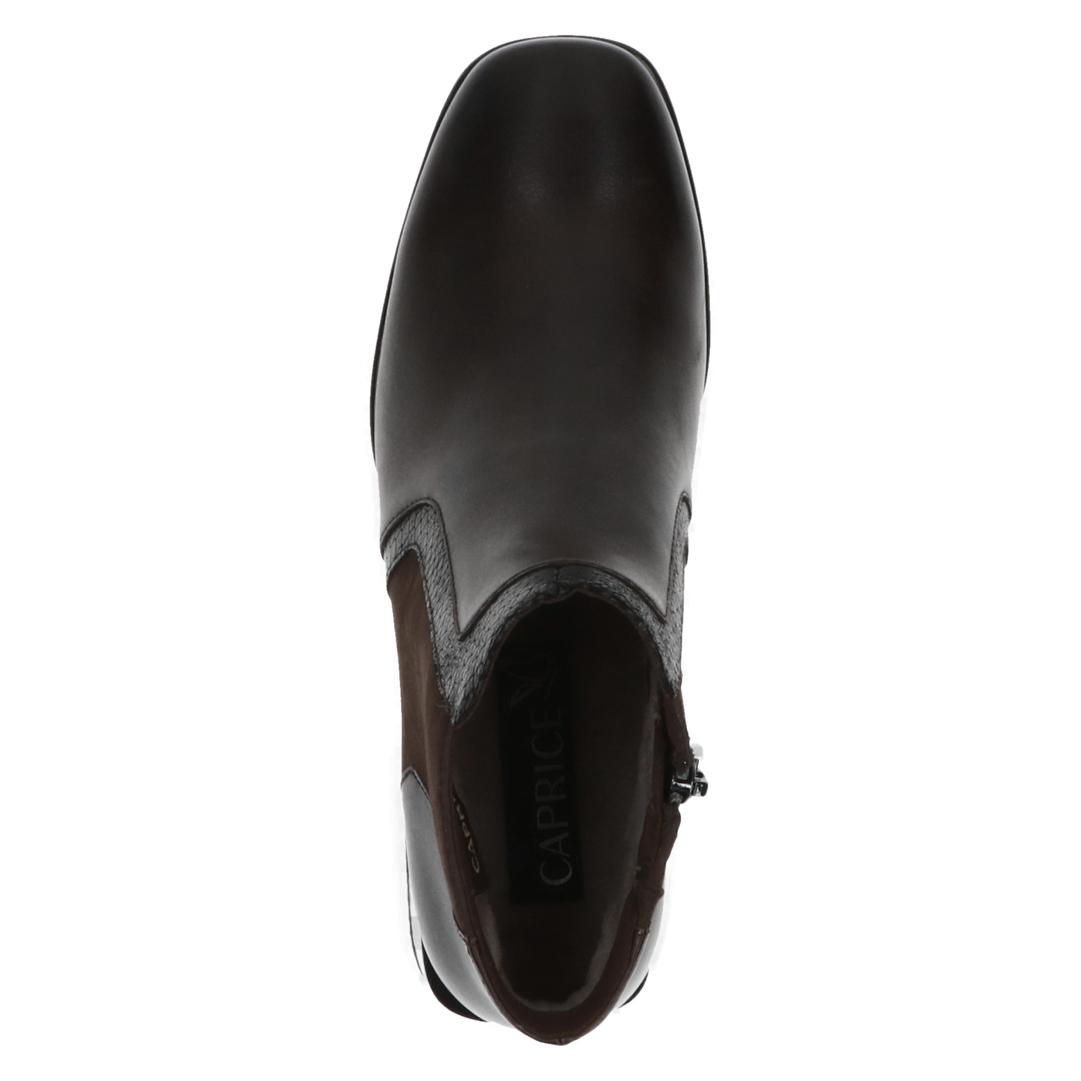 Dámská kotníková obuv v hnědé barvě značky Caprice. Svršek obuvi je vyroben z kůže. Uvnitř lehce zateplené hřejivou textilní podšívkou. Obuv se snadno nazouvá díky bočnímu zipu.