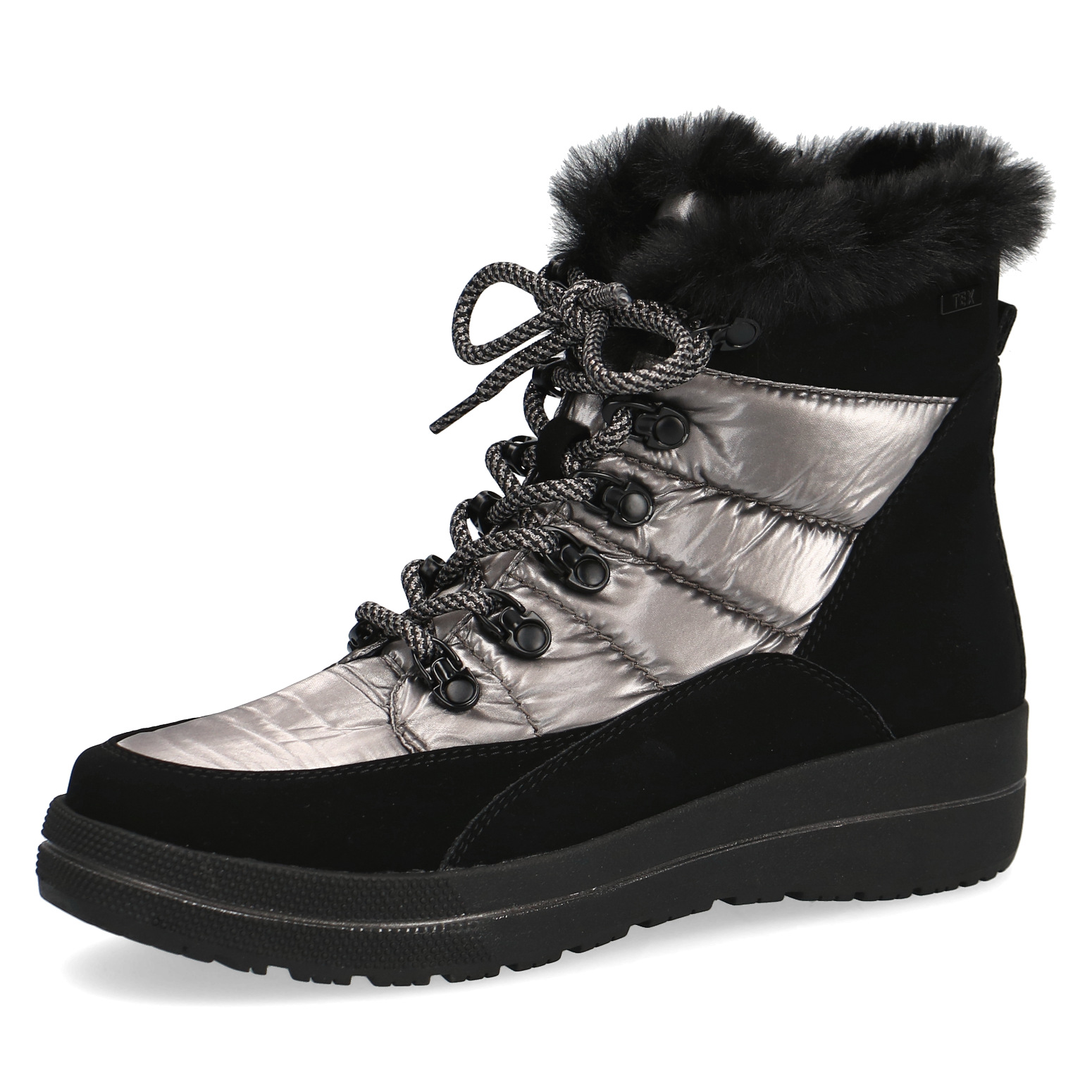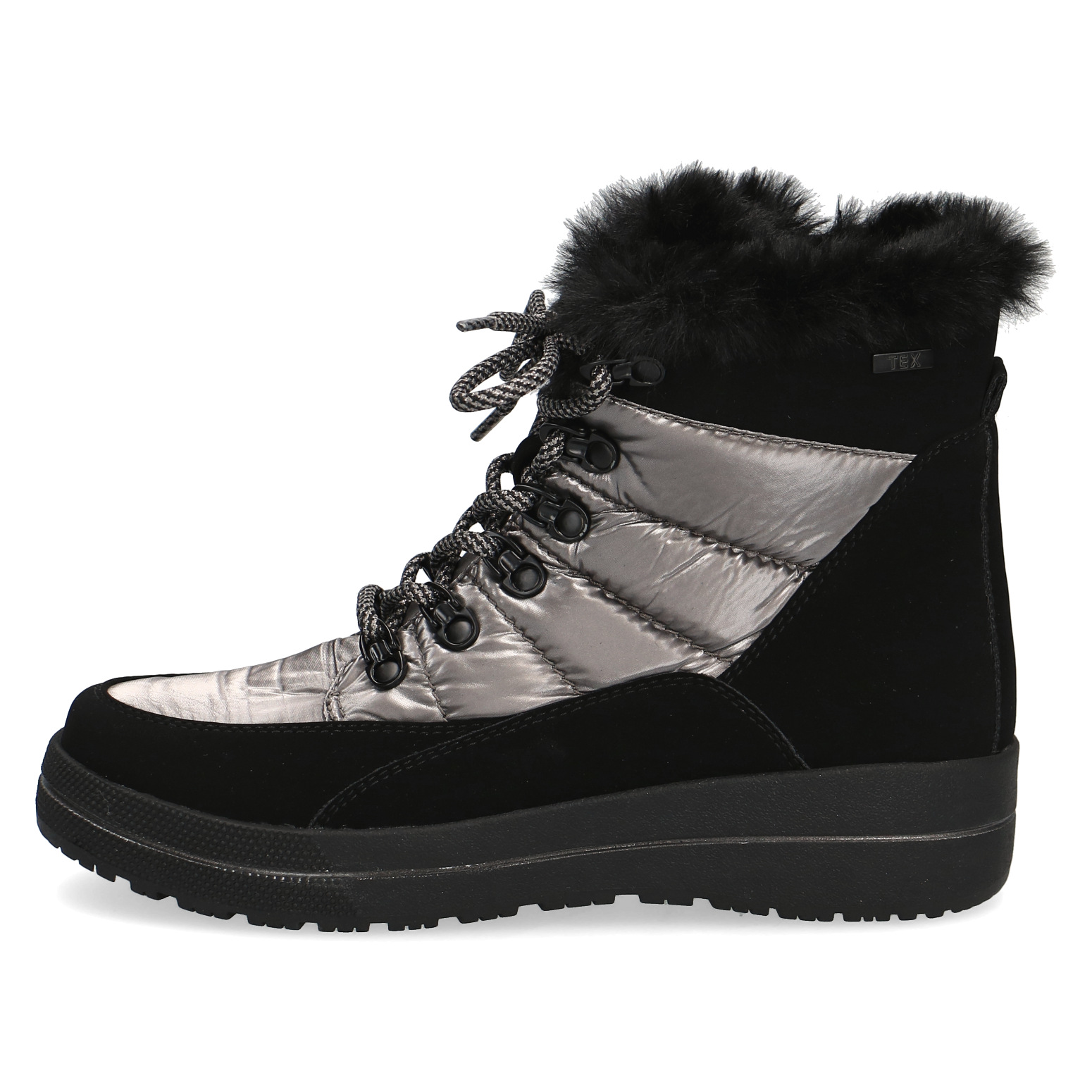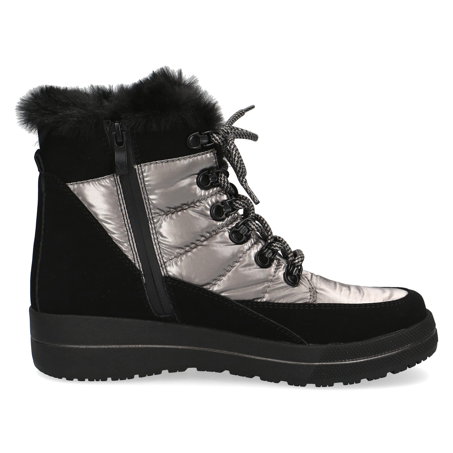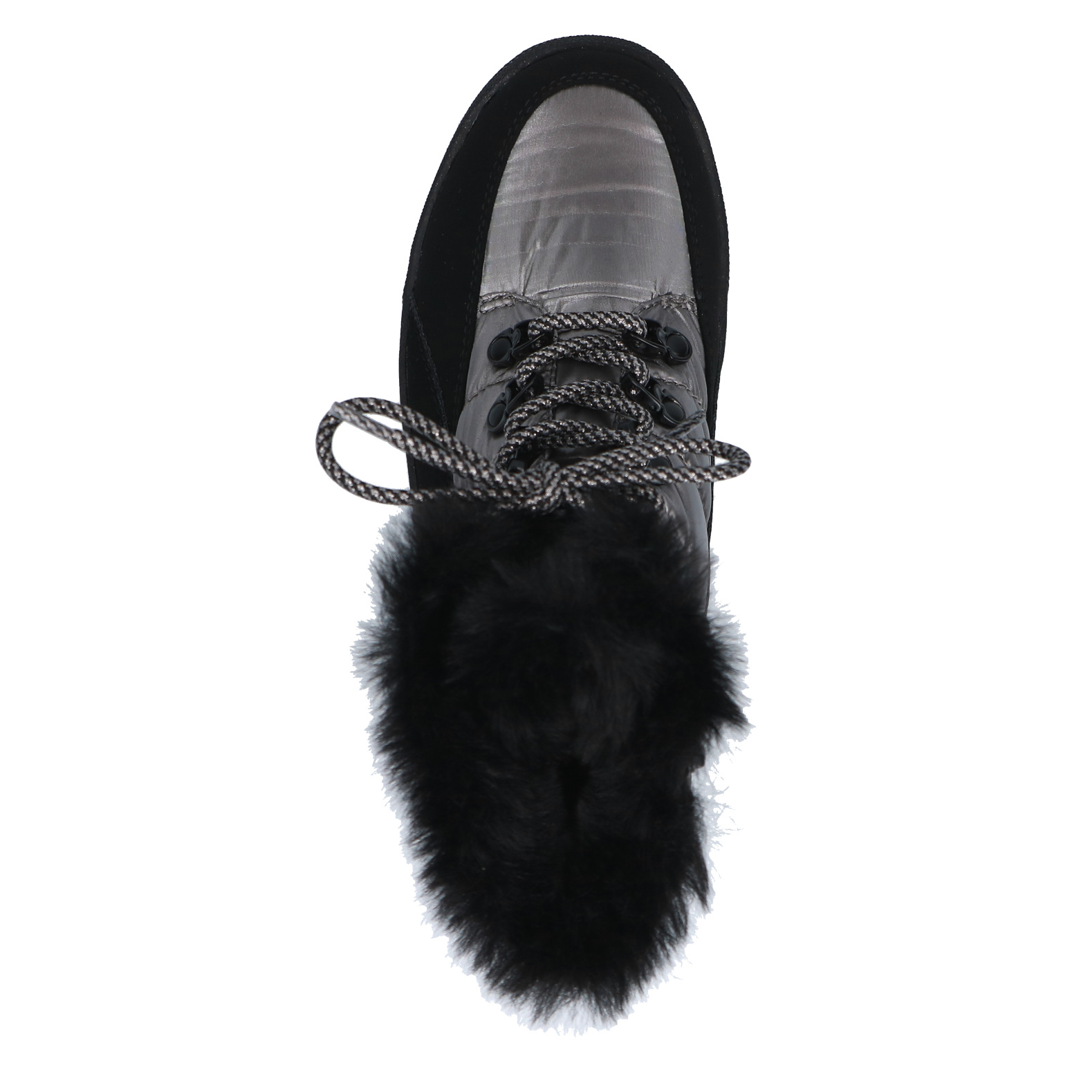 Dámské šedé sněhule ze syntetiky, jsou vyteplené kožíškem a mají vodoodpudivou membránu. Šněrování a zip na boku boty usnadňují obutí a přizpůsobení obuvi. Díky vyměkčené stélce, jsou pohodlné při došlapu. Vyjímatelná stélka umožňuje její výměnu a zvyšuje tím pohodlí při nošení bot. Vzduchové bublinky umístěné zespod stélky tlumí nárazy při chůzi a zajišťují lepší odvětrávání boty. Silná gumová podrážka izoluje a chrání před mrazem.