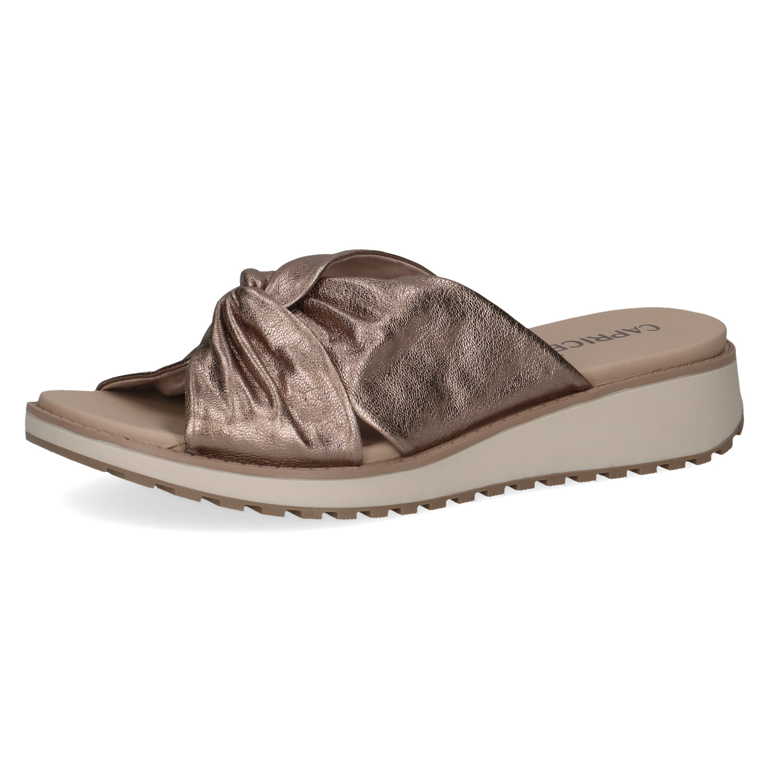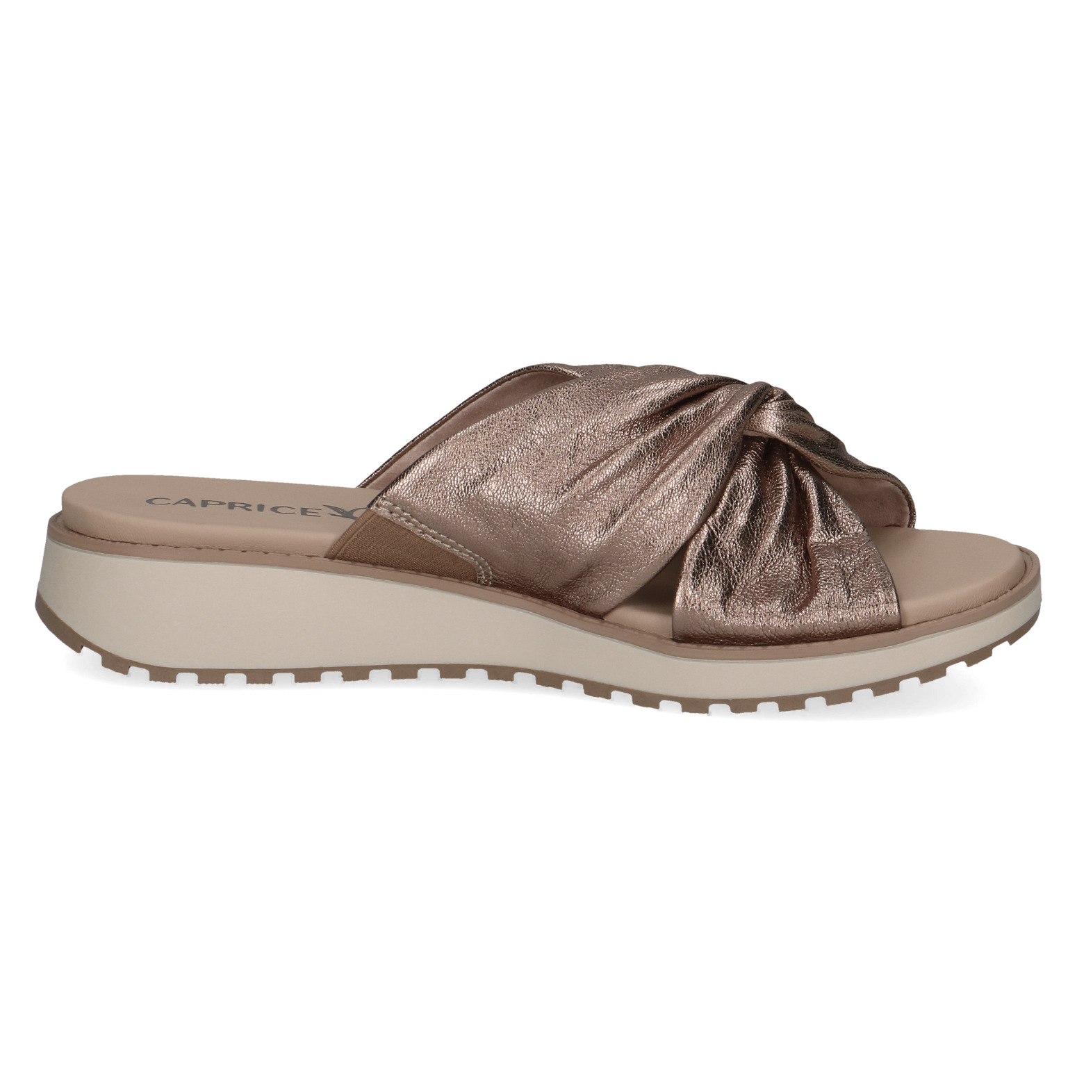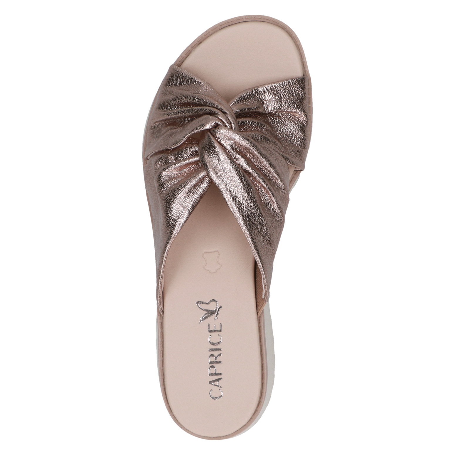 Dámské pantofle na klínku ve zlaté barvě, která dodavá obuvi eleganci a šmrnc. Svršek obuvi je vyroben z kůže. Vnitřní stélka je kožená. Obuv vhodná ke kalhotům i k sukni.