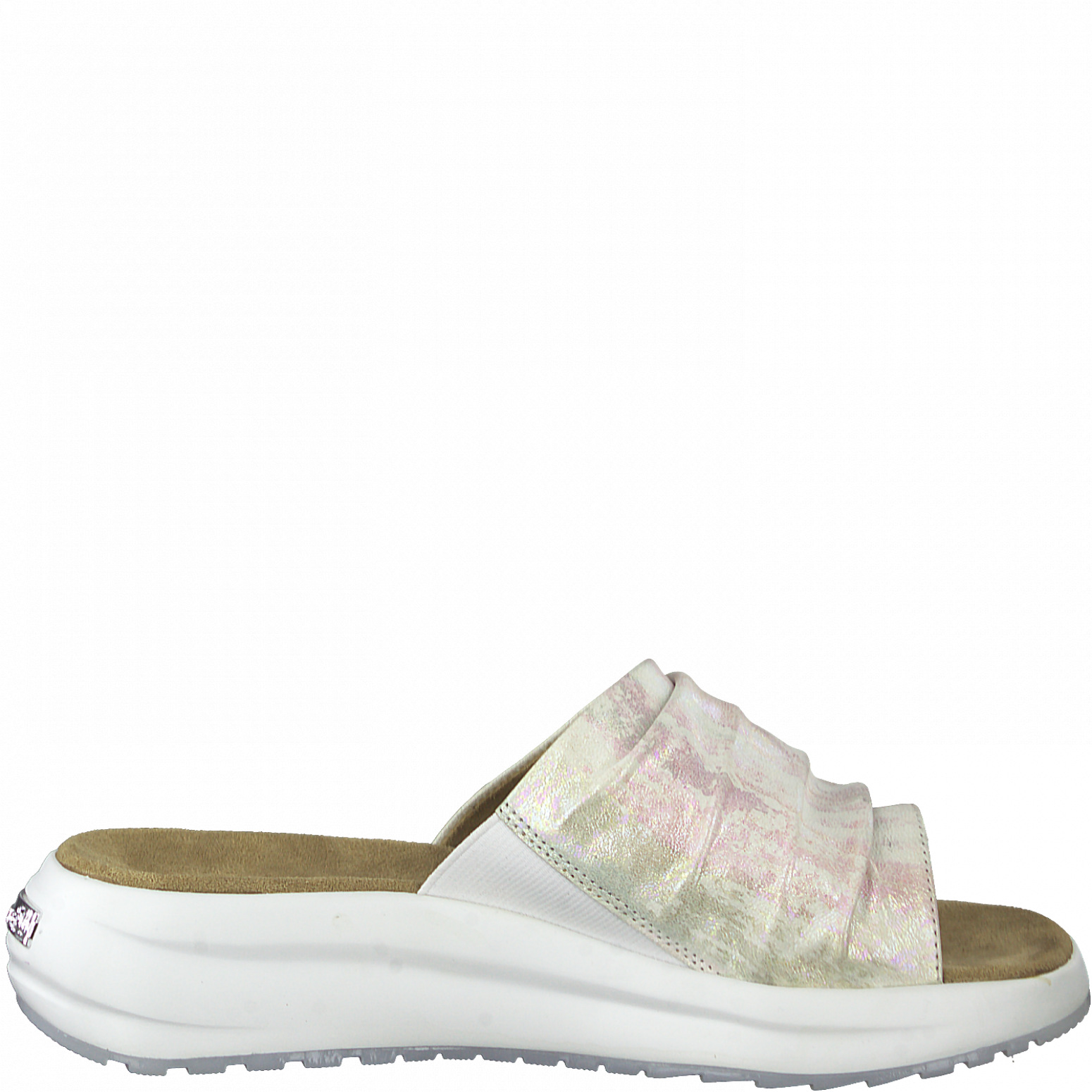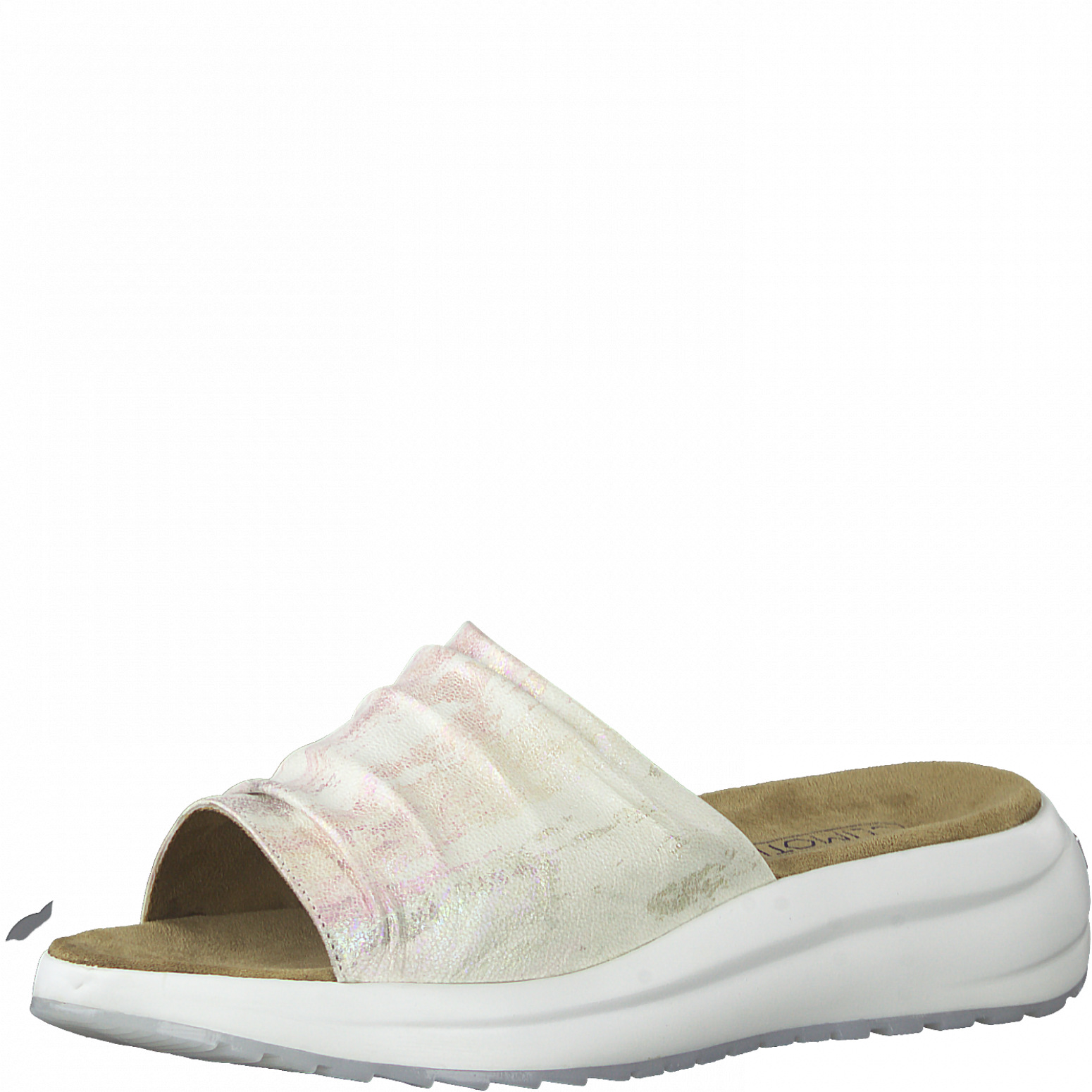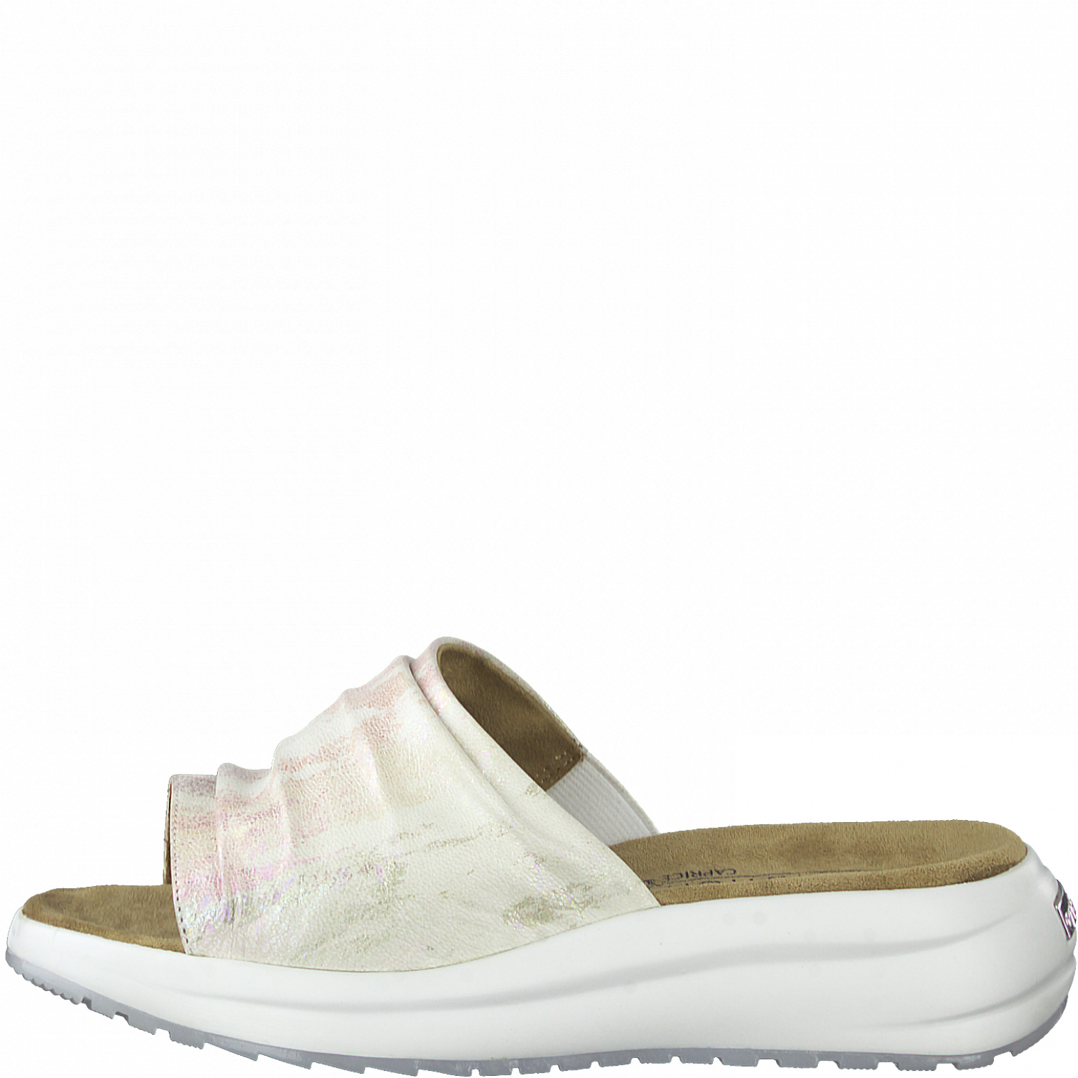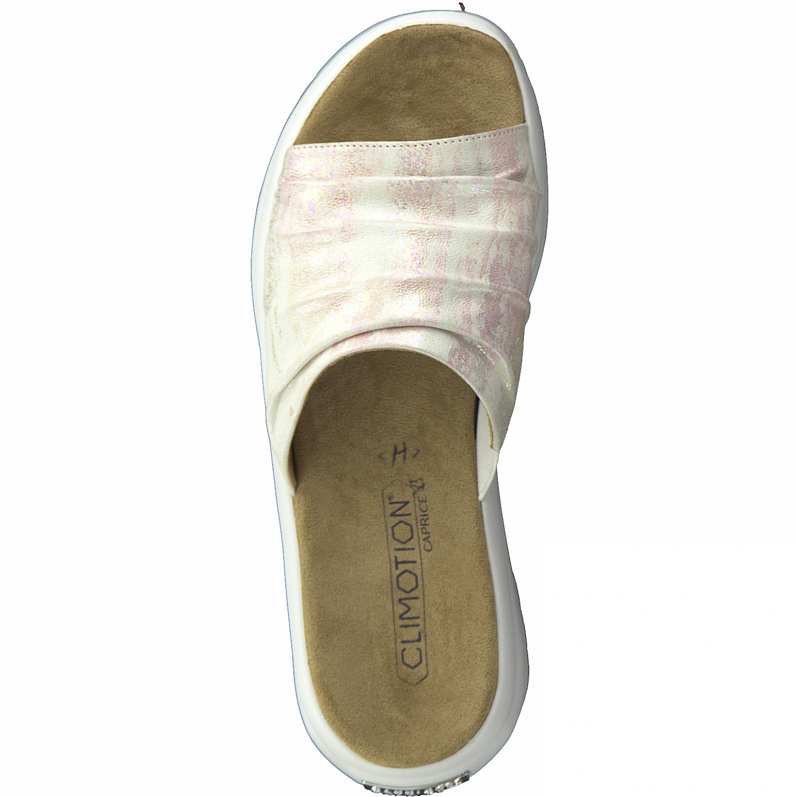Dámské lesklé pantofle Caprice. Obuv je v šíři H - vhodné na širší chodidlo. Svršek obuvi je vyroben z kůže. Měkká a elastická stélka CLIMOTION poskytuje patřičnou měkkost došlapu. Kombinace materiálu a struktury s vloženými vzduchovými kanály umožňuje celoplošné a trvalé odvětrání. Díky paměťové technologii se podešev ergonomicky přizpůsobuje tvaru nohy. .