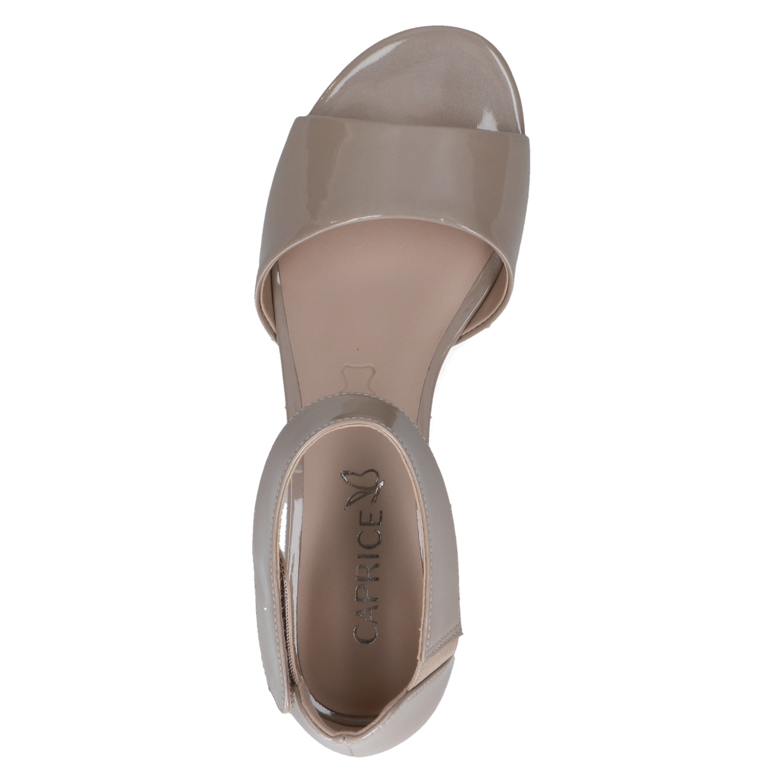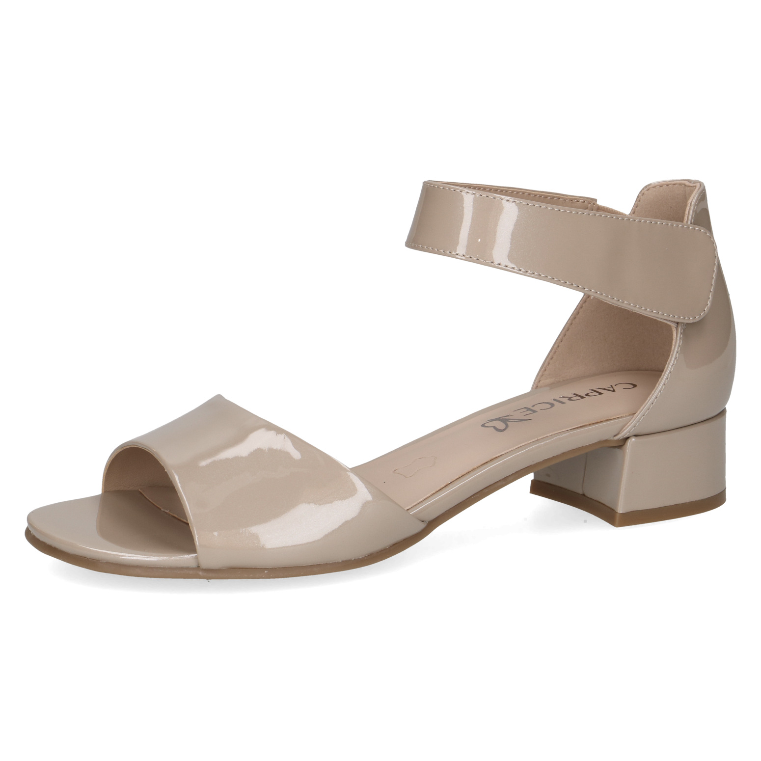 Dámské béžové sandály značky Caprice. Svrchním materiálem je lesklá kůže. Zapínání kolem kotníku je na suchý zip. Obuv je stabilní díky širšímu pohodlnému podpatku. Podešev je vyrobená z kvalitního syntetického materiálu.
