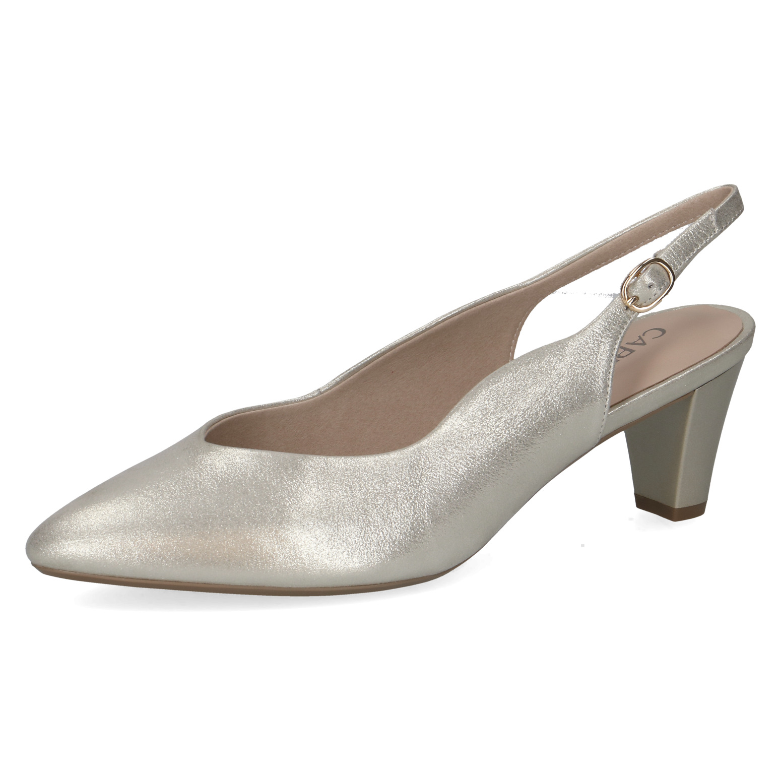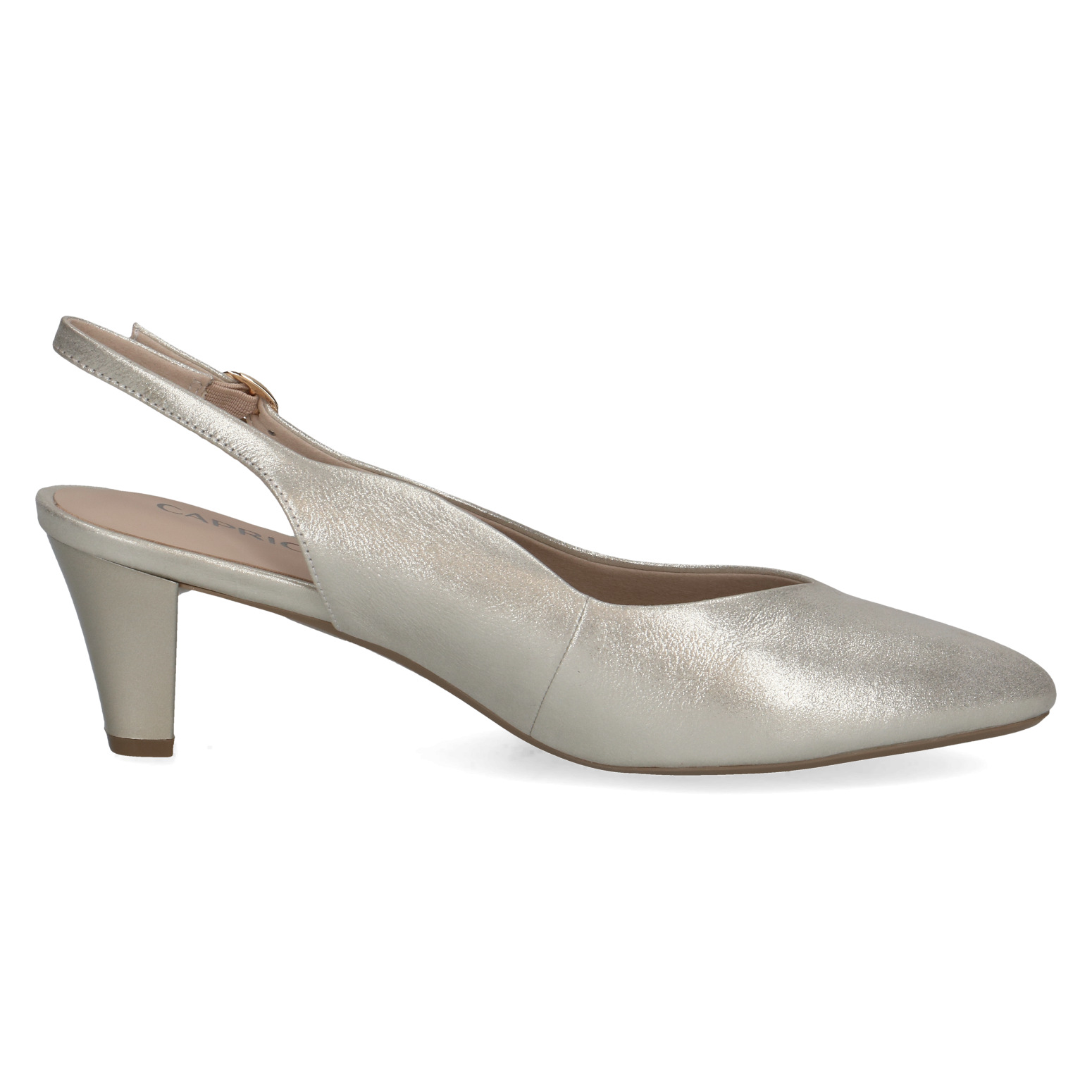 Dámské lodičky s jemným leskem v barvě šampaň značky Caprice. Svrchním materiálem je kůže. Obuv je pohodlná díky vyměkčené stélce a střední výšce podpatku.