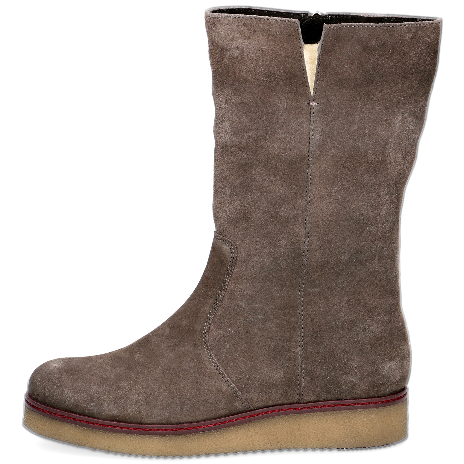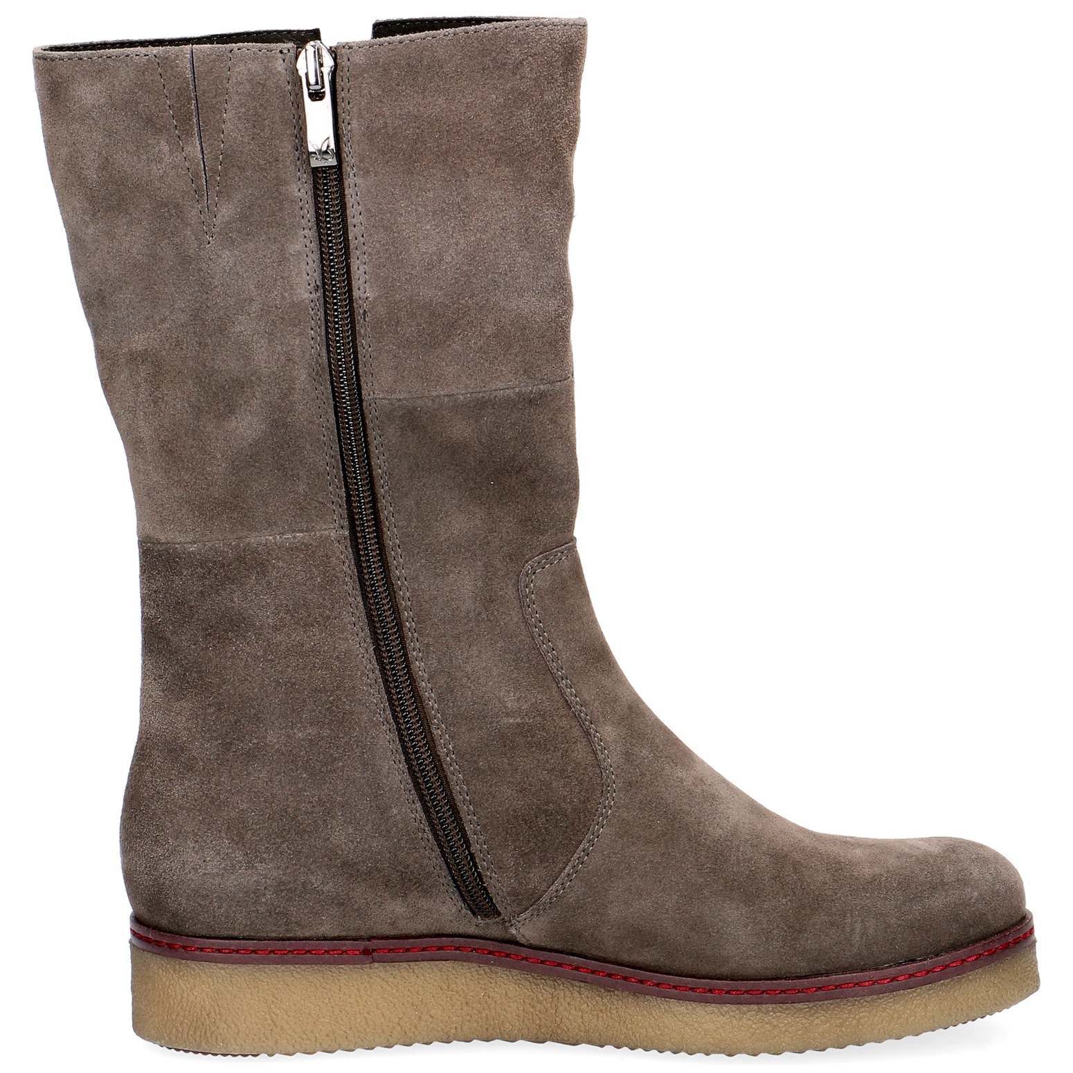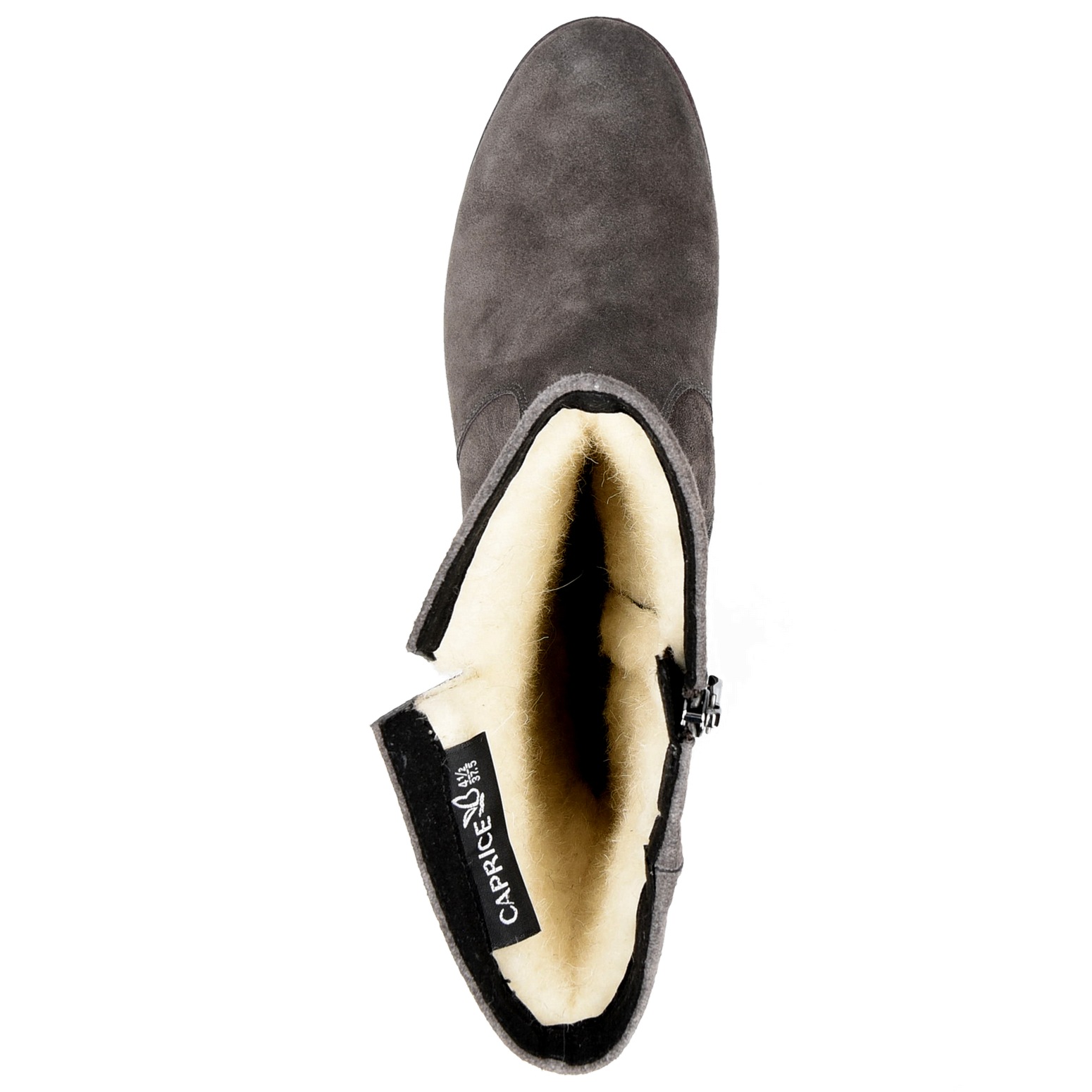 Dámské šedé kožené semišové kozačky jsou ultralehké. Stélka je změkčená vzduchovými polštářky. Podpatek tlumí nárazy a otřesy při chůzi. Pohodlná hřejivá obuv do zimních měsíců.
