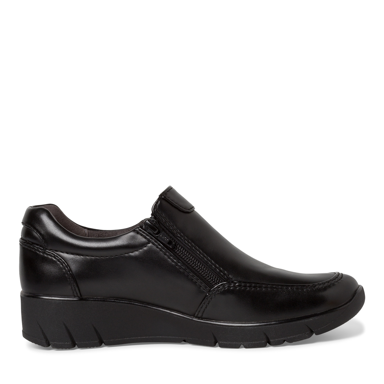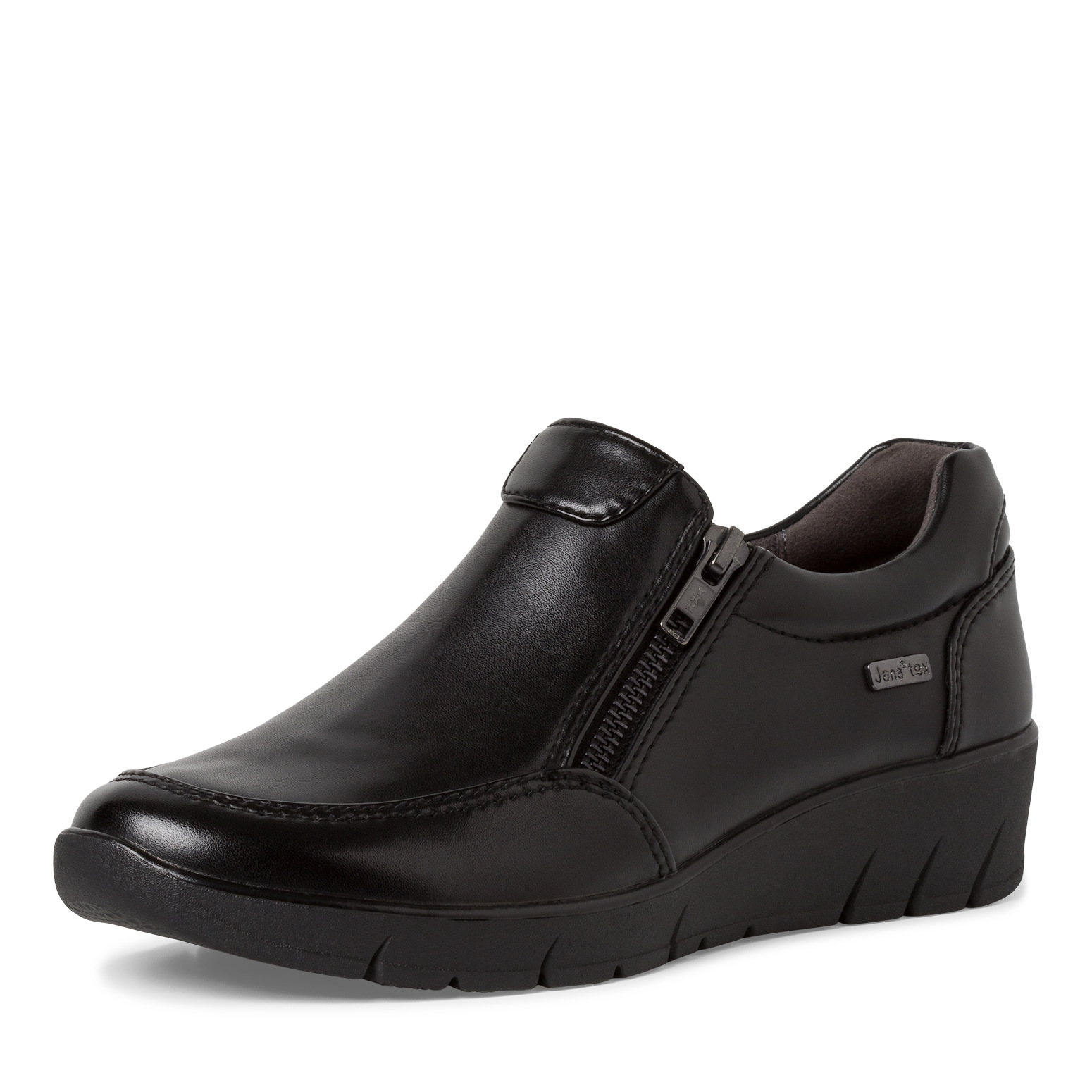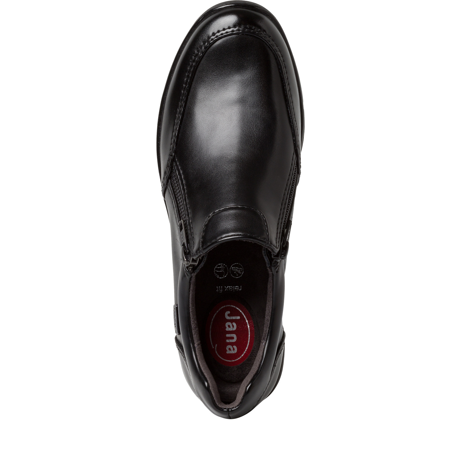 Dámské černé polobotky značky Jana. Svrchním materiálem je syntetika. Z boku obuvi dva funkční zipy pro snadnější obouvání. Obuv je v šíři H - vhodná i pro širší chodidlo.