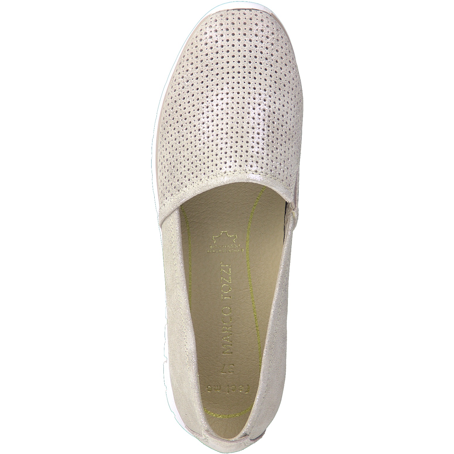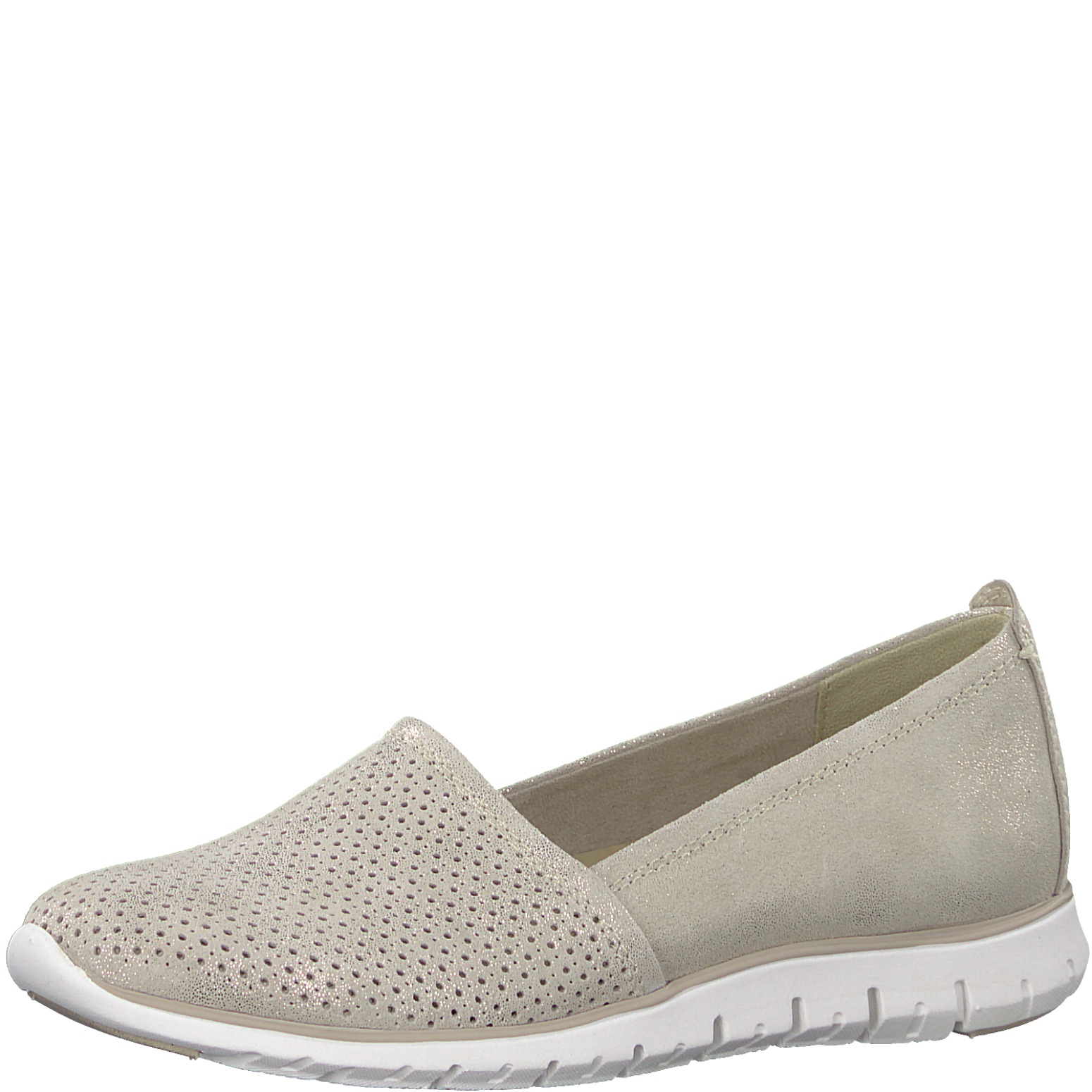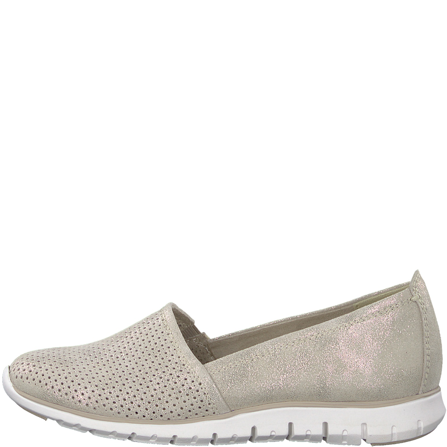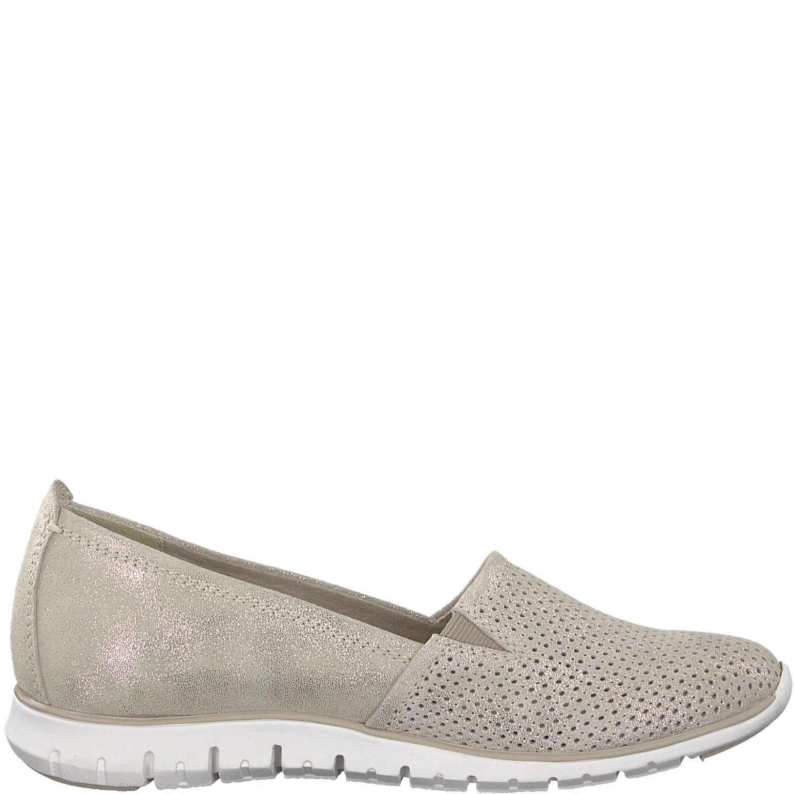Módní dámské béžové mokasíny mají kožený svršek. Svršek je v módním metalickém vzhledu s perforováním přední části, které zajistí dobrou prodyšnost a klima nohou. Optimální pohodlí při chůzi zajišťuje kožená stélka. Podešev je tvořena syntetikou, podšívka textil/syntetika, stélka ekokůže.