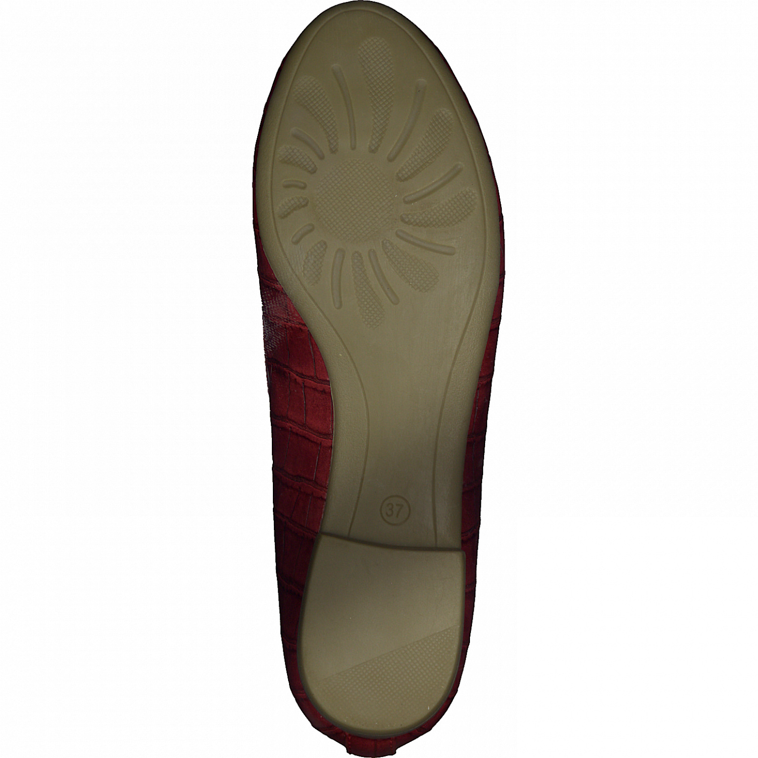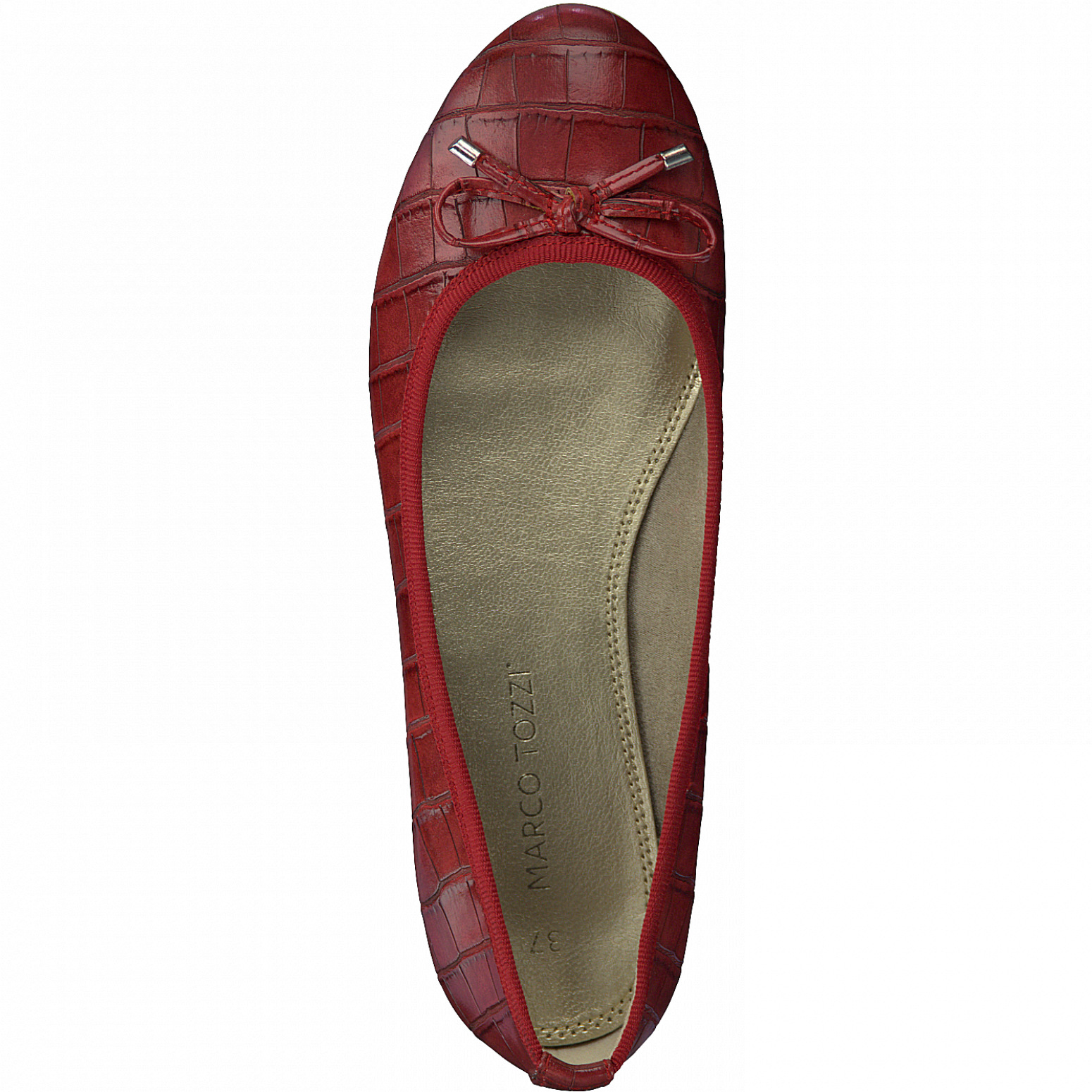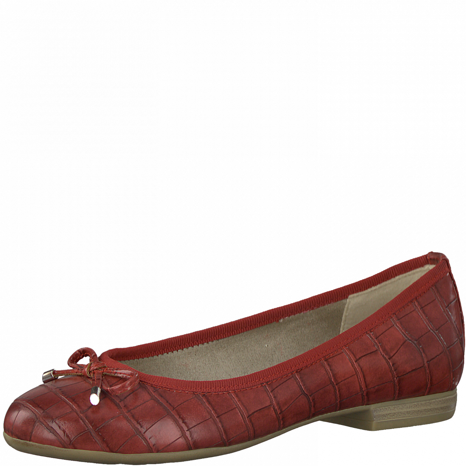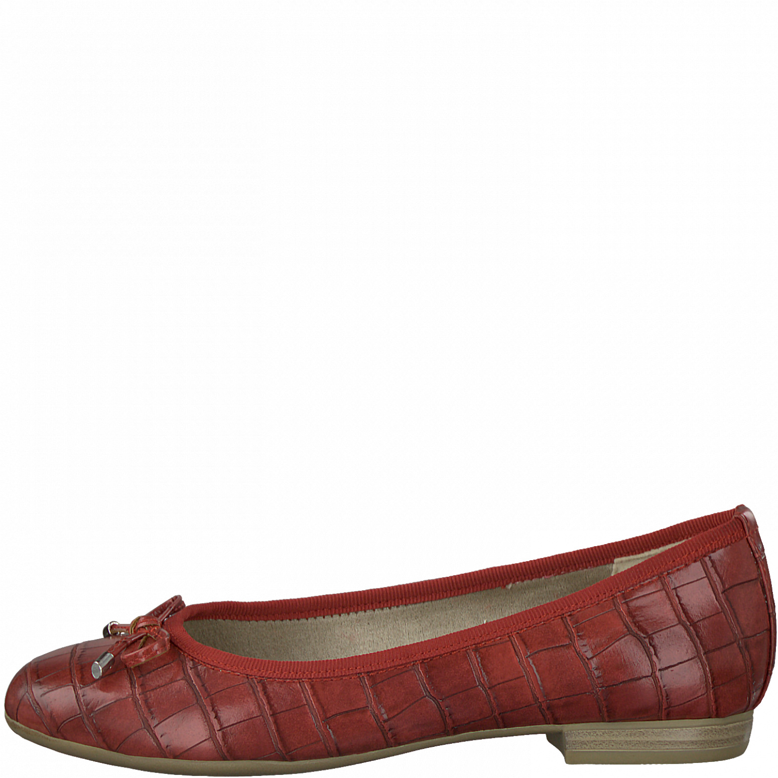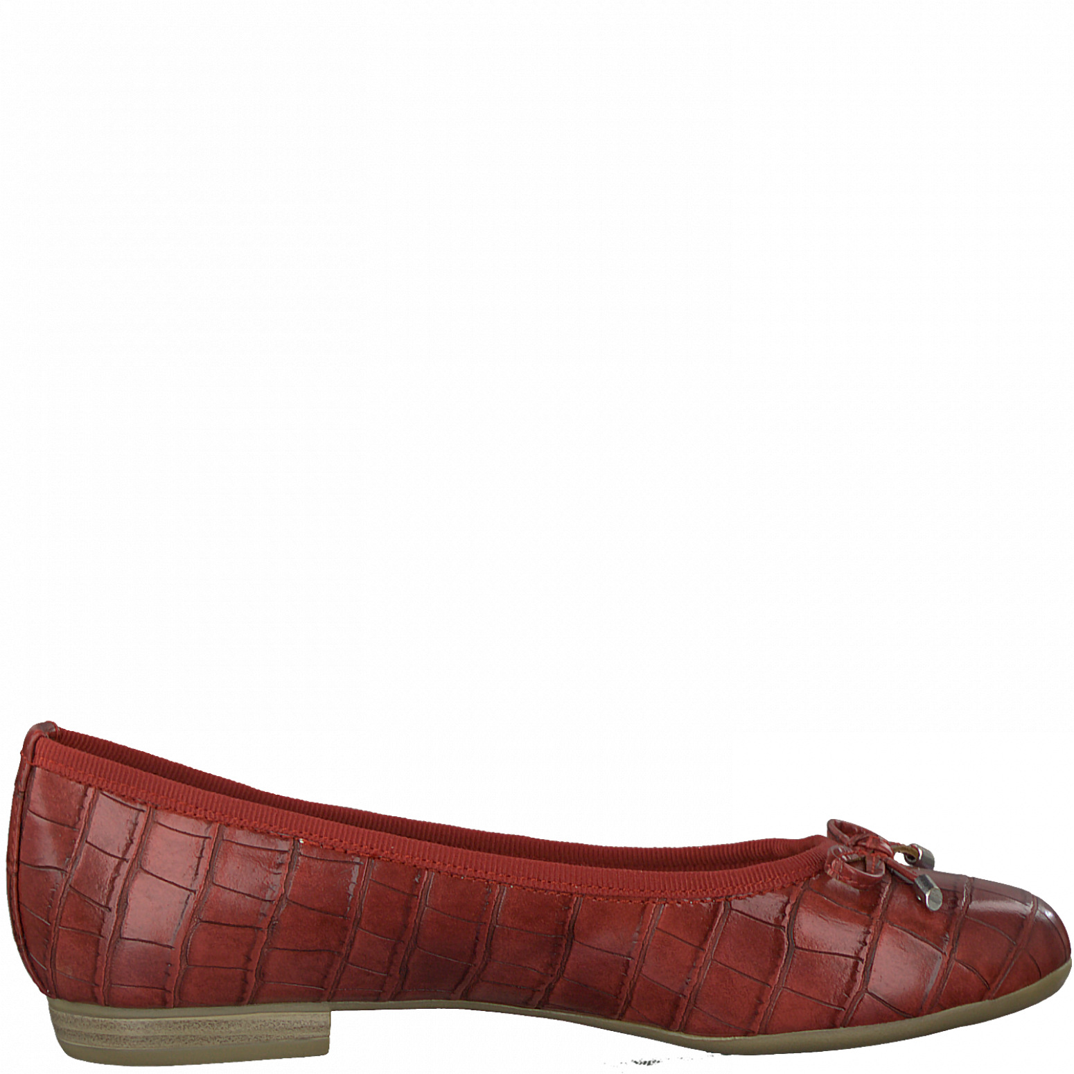 Dámské vycházkové červené baleríny na menším podpatku s kulatou špičkou. Baleríny jsou zdobené mašličkou. Svršek obuvi je vyroben ze syntetické kůže. Vhodná obuv na procházku, pochůzky městem či do práce.