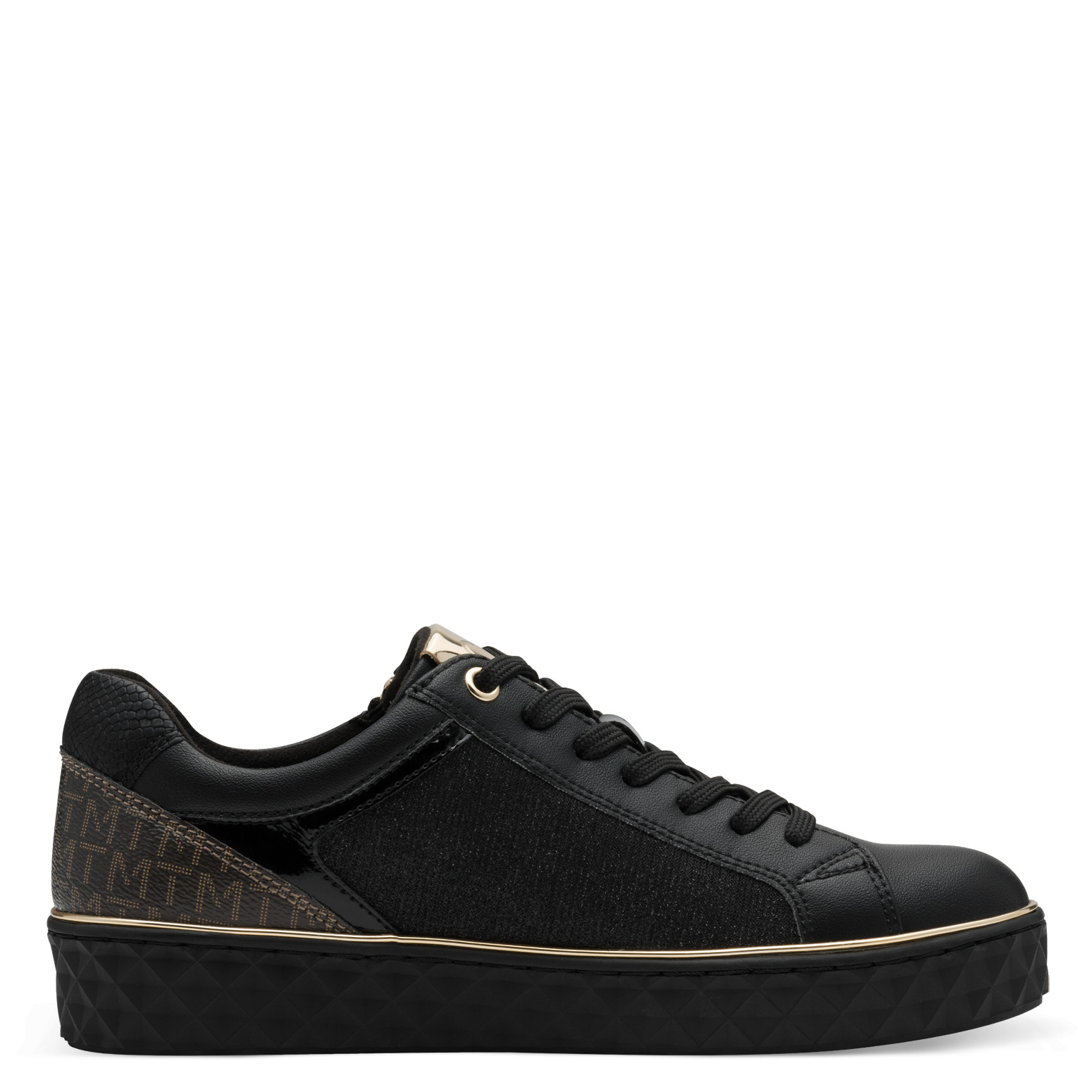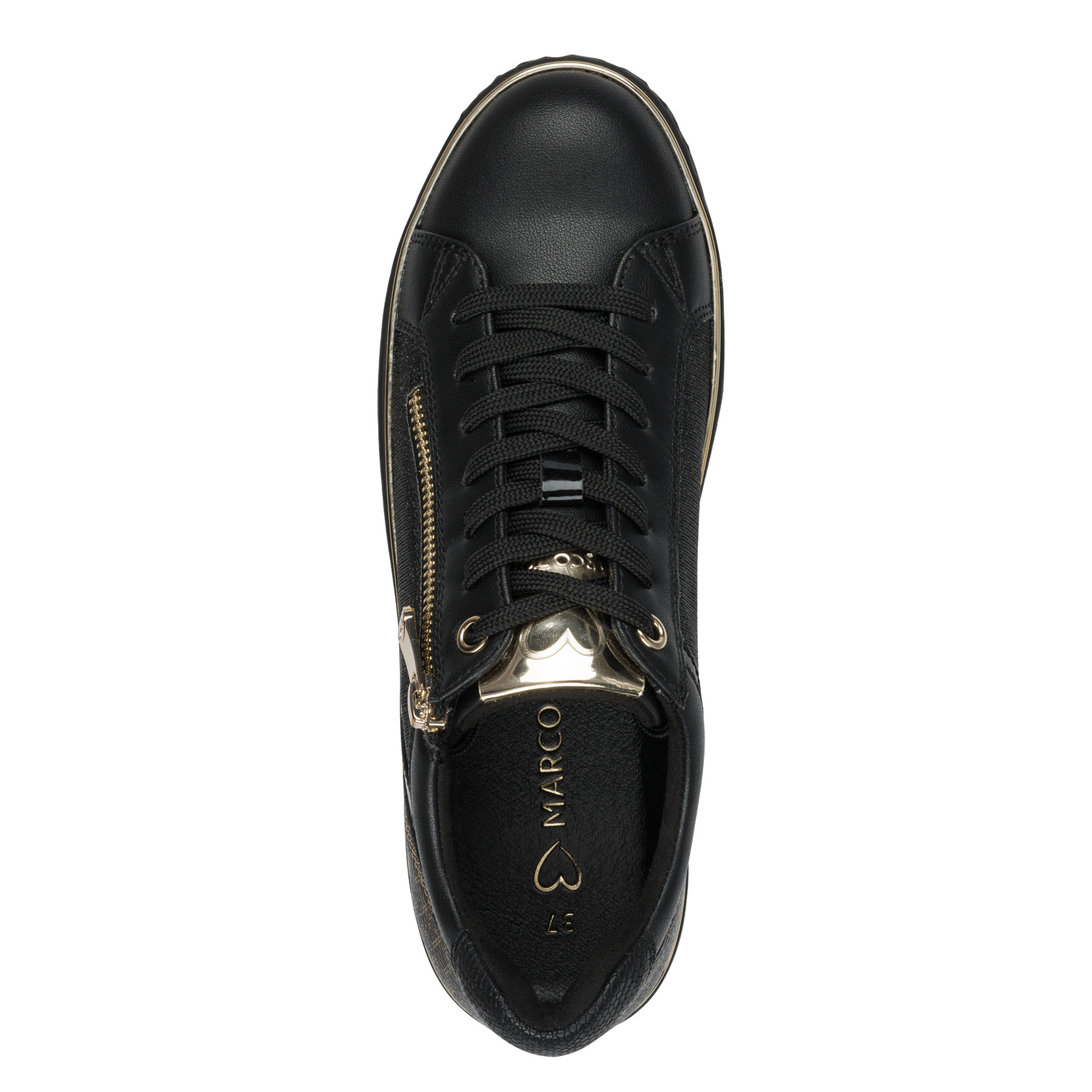 Dámské třpytivé černé šněrovací tenisky značky Marco Tozzi. Svrchním materiálem je syntetika. Z boku obuvi zip pro snadnější obouvání. Vnitřní stélka je vyjímatelná. Vhodná obuv ke každodennímu nošení.