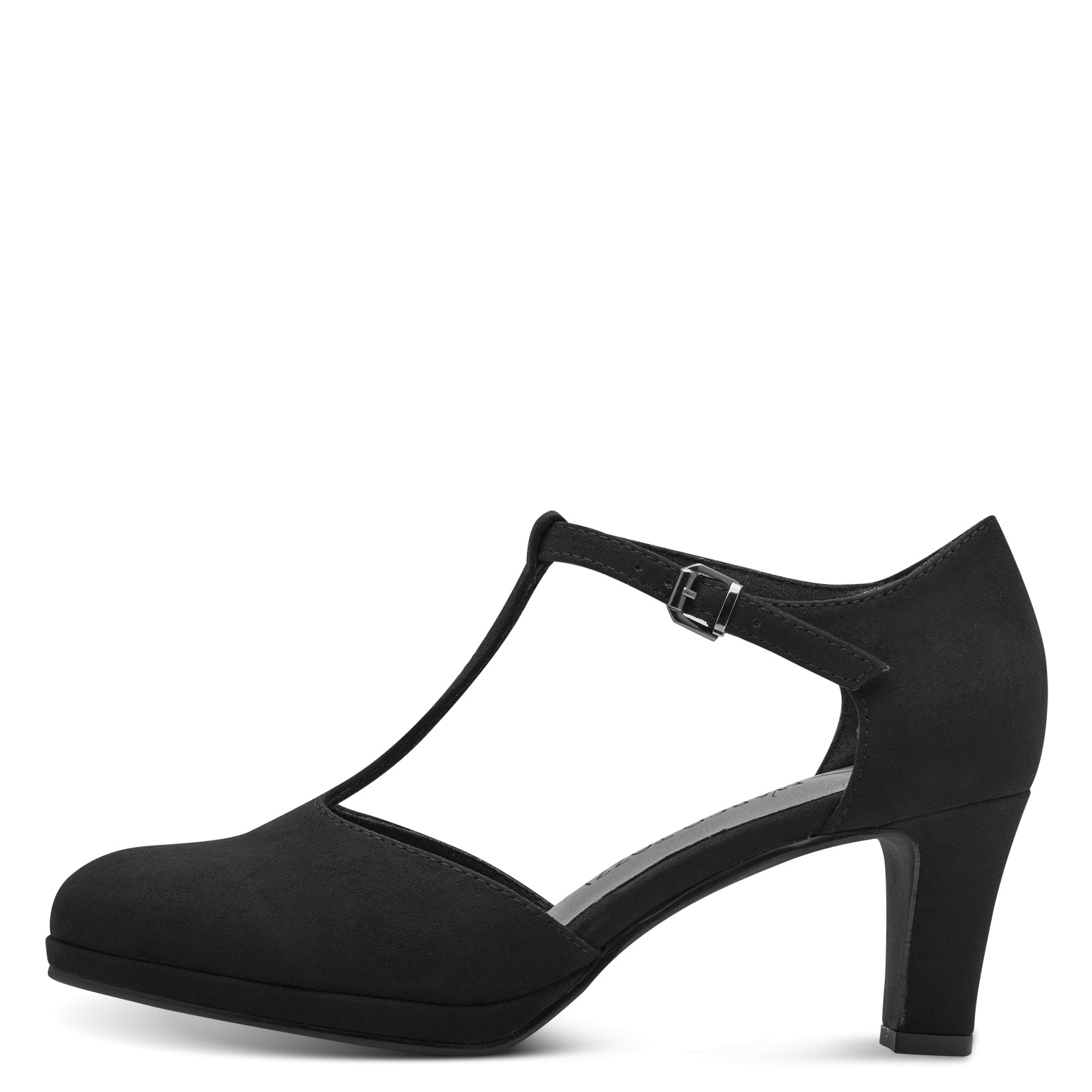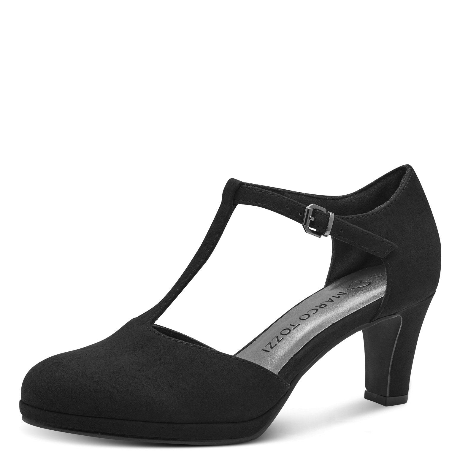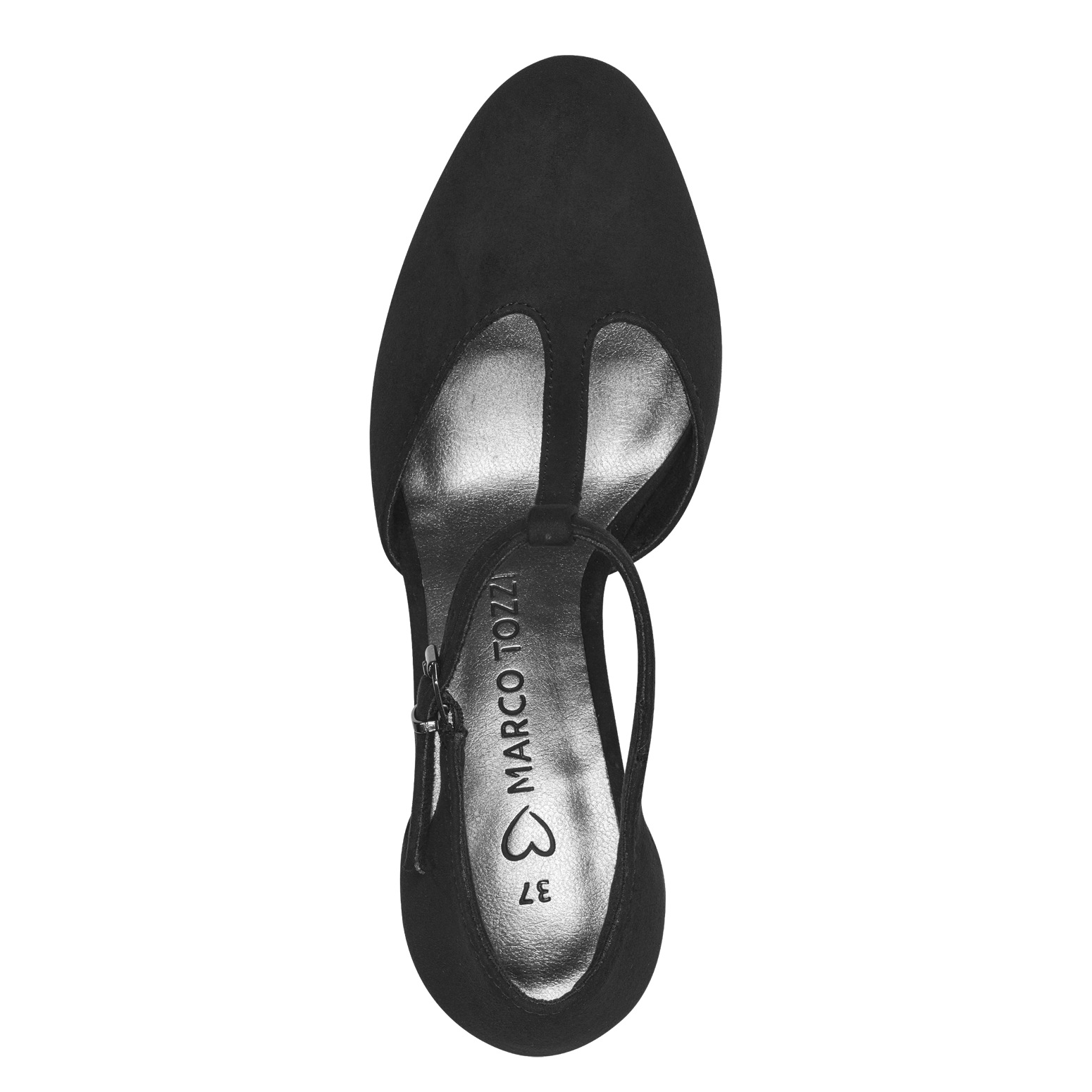 Dámské černé lodičky na podpatku značky Marco Tozzi. Svršek je vyroben z pevné textilie. Lodičky mají zapínání kolem kotníku na kovovou sponku opatřenou gumičkou.