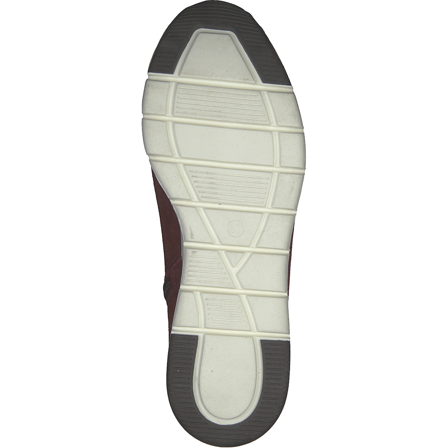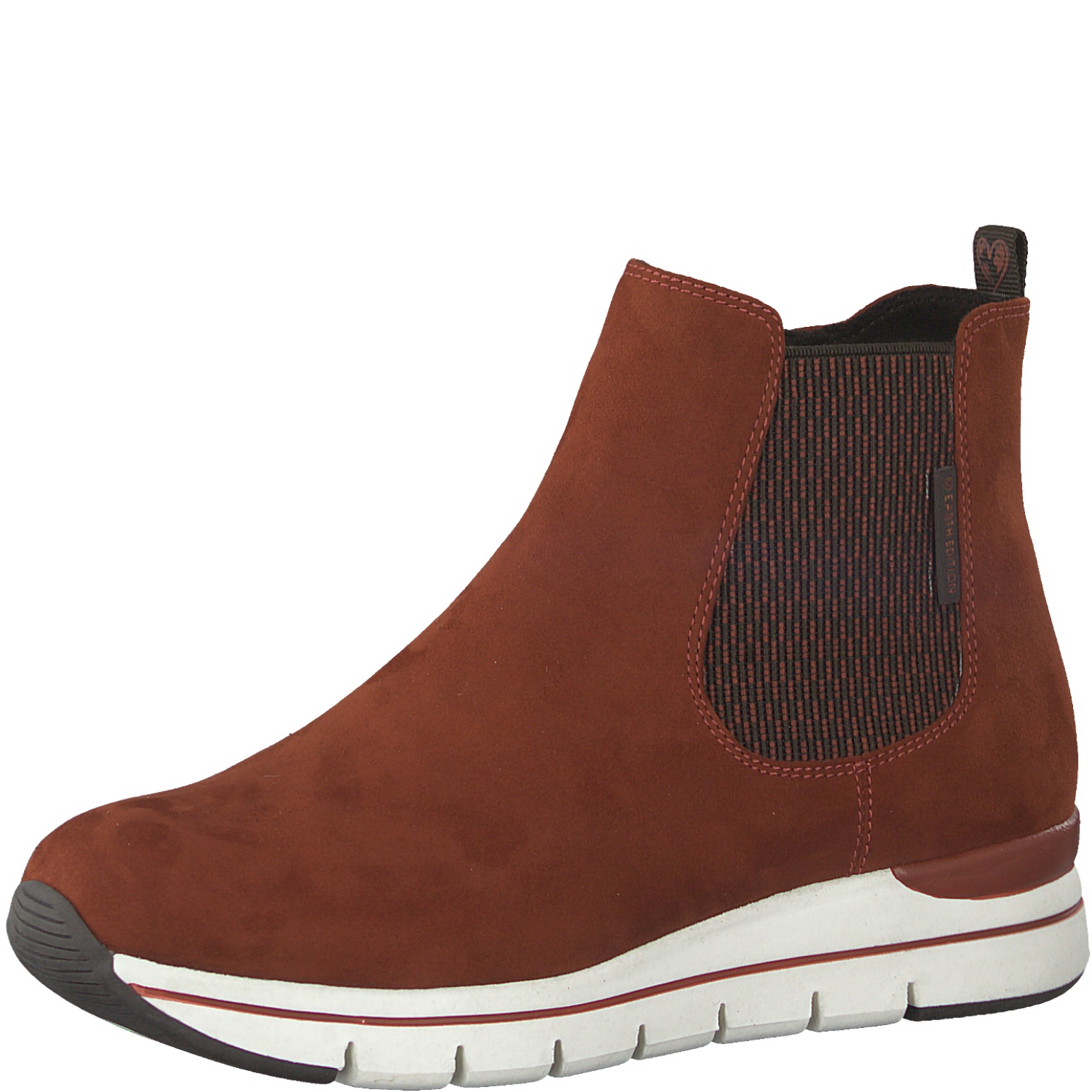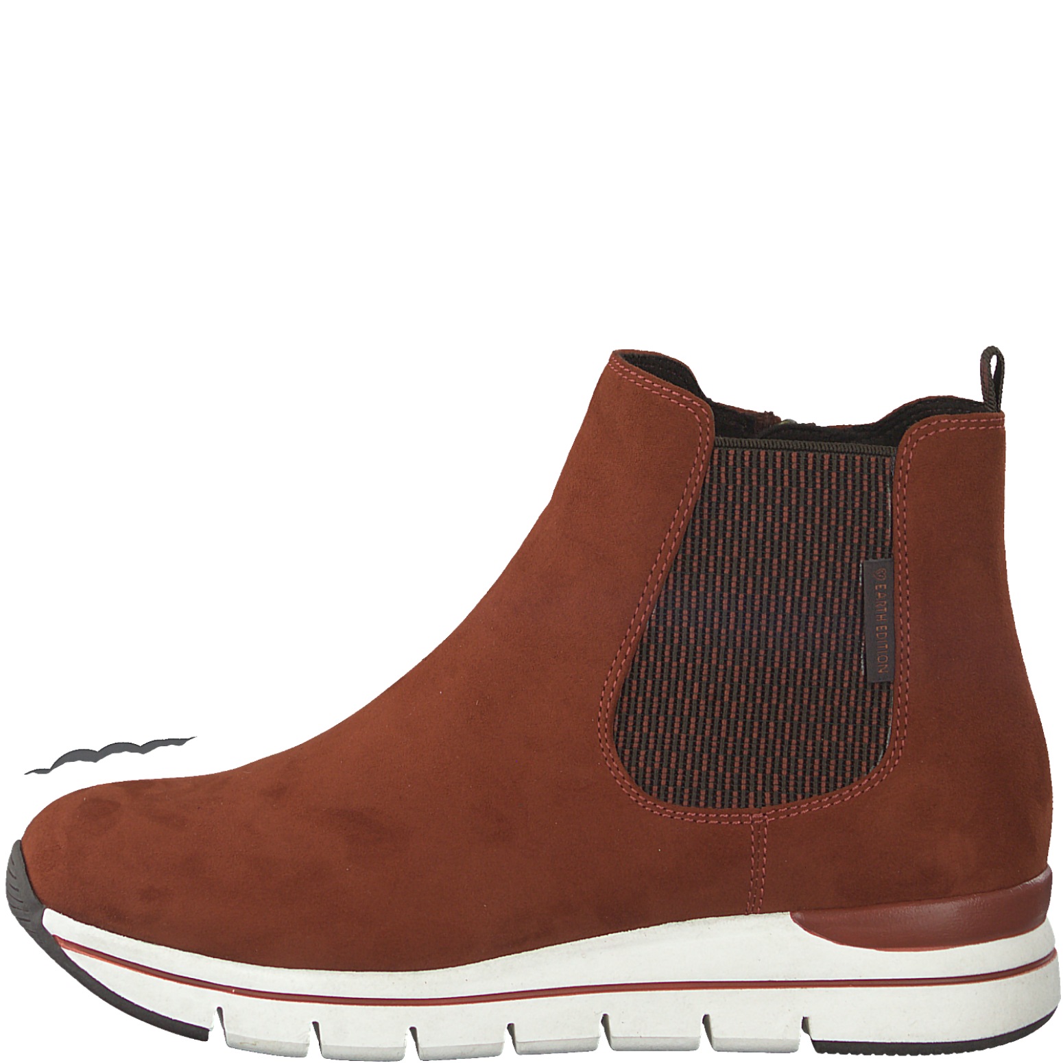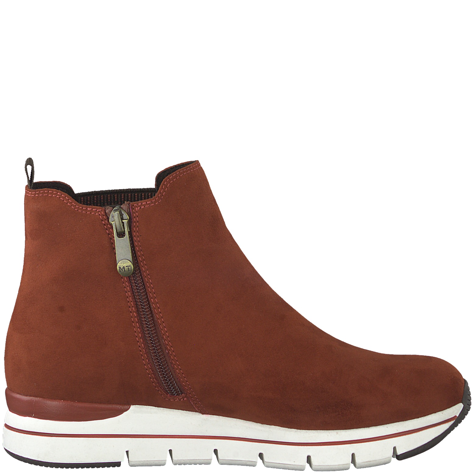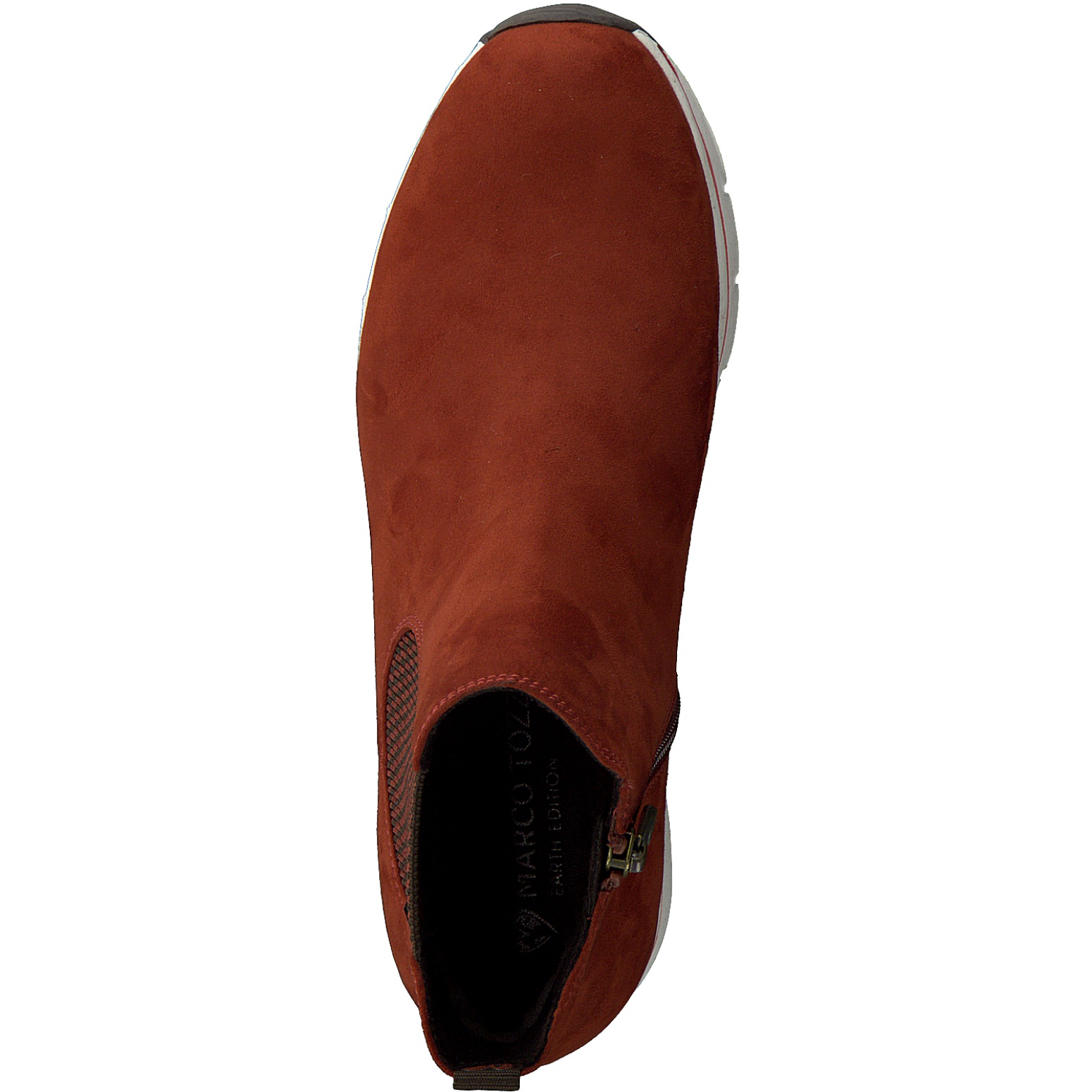 Dámské kotníkové boty Marco Tozzi na bílé platformě oranžovo-červené barvy. Dají se snadno nazouvat díky bočnímu zipu. Uvnitř zateplené jemným fleecem. Výroba obuvi šetrná k životnímu prostředí.