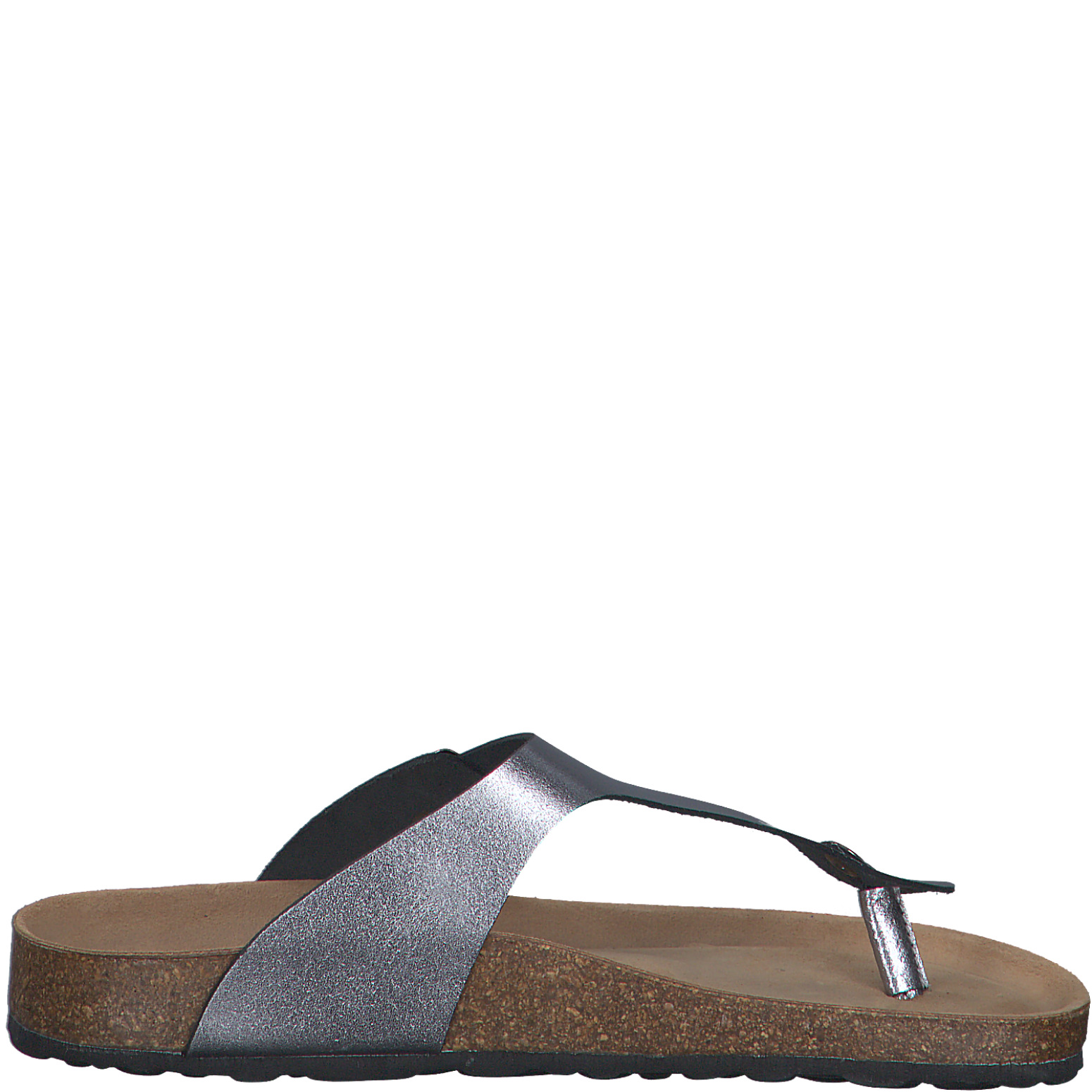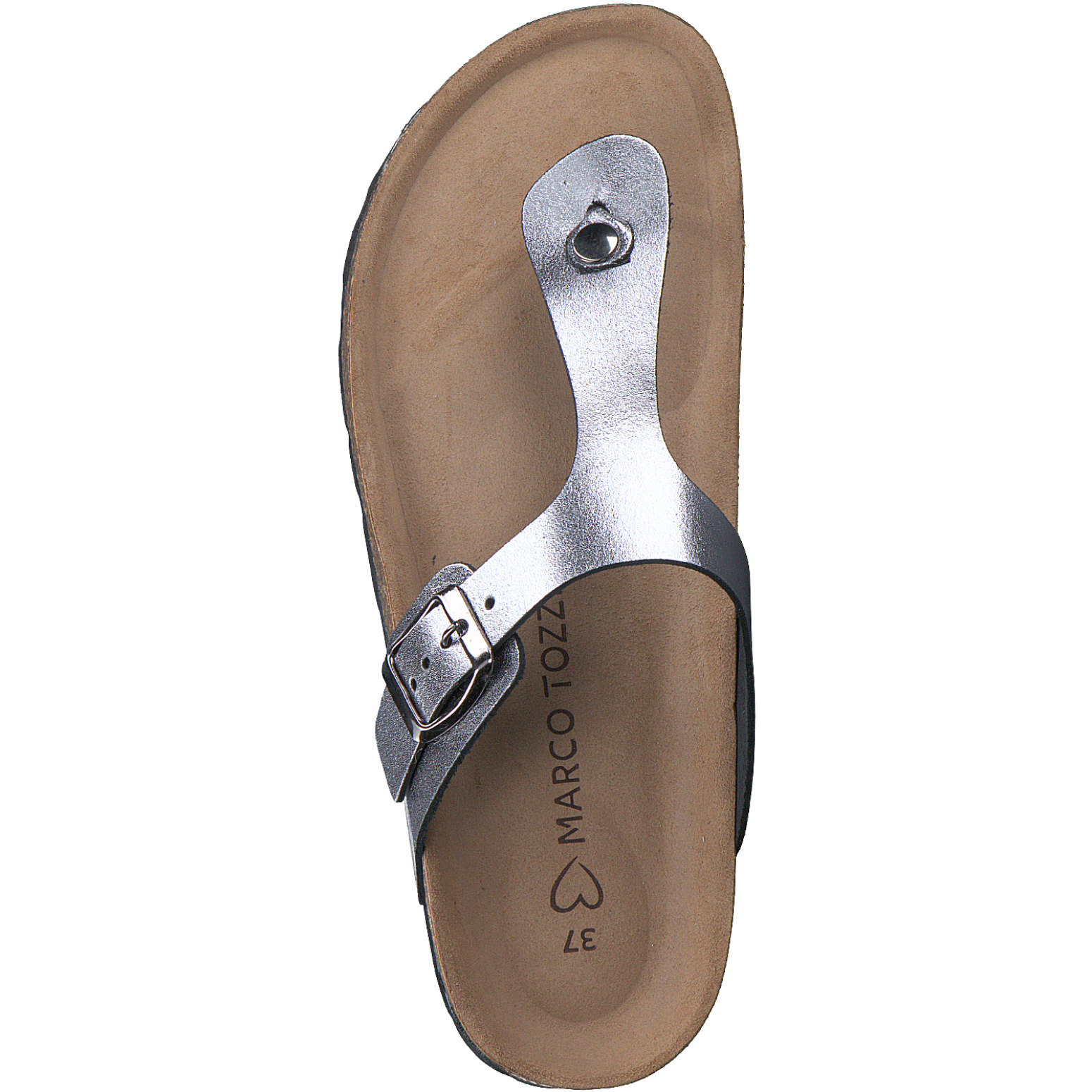 Dámské tmavě šedé lesklé žabky značky Marco Tozzi. Svrchním materiálem je kůže. Obuv lze přezkou upravit na požadovanou šířku. Pohodlná obuv pro letní dny.