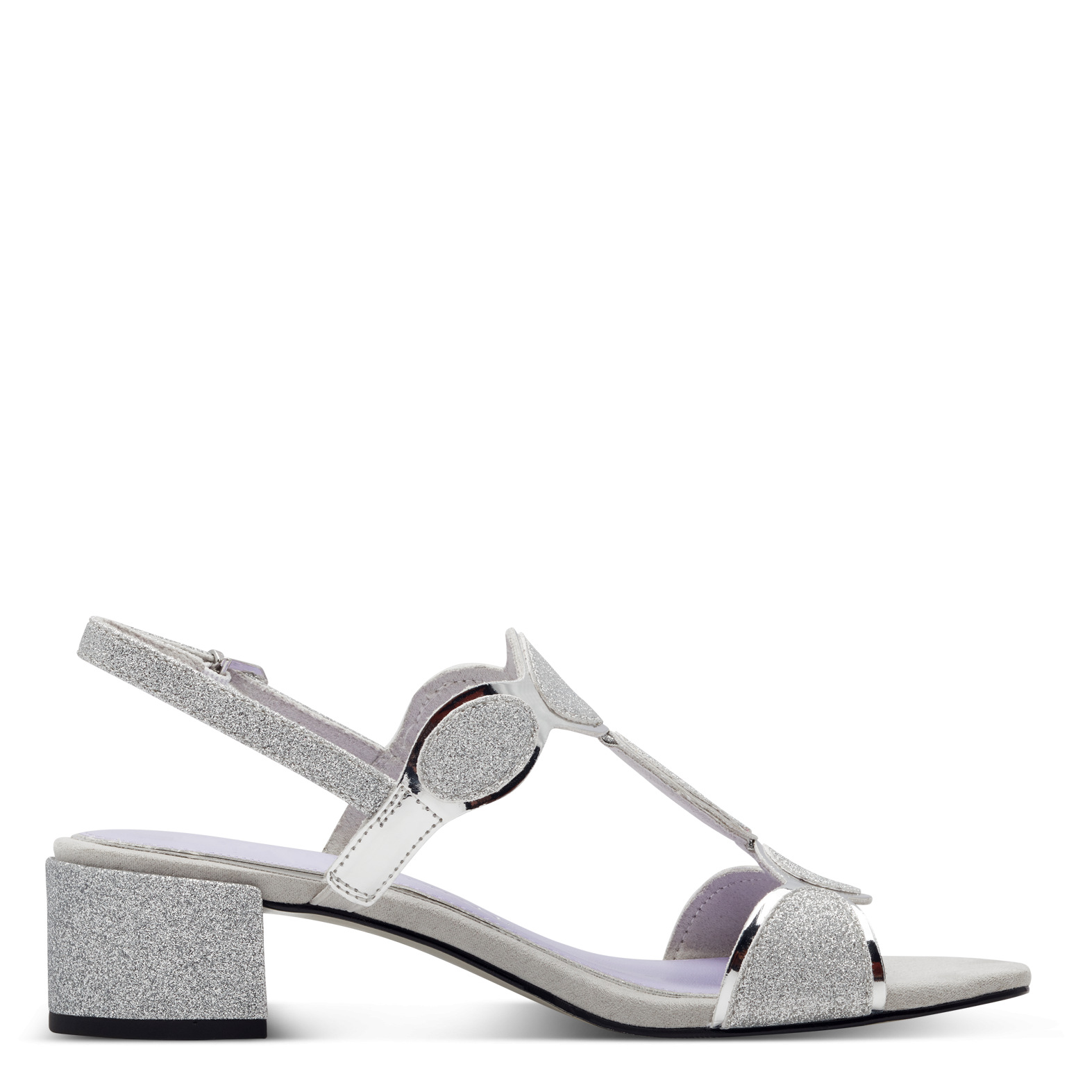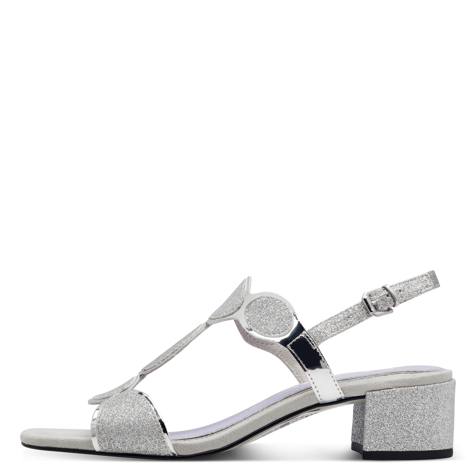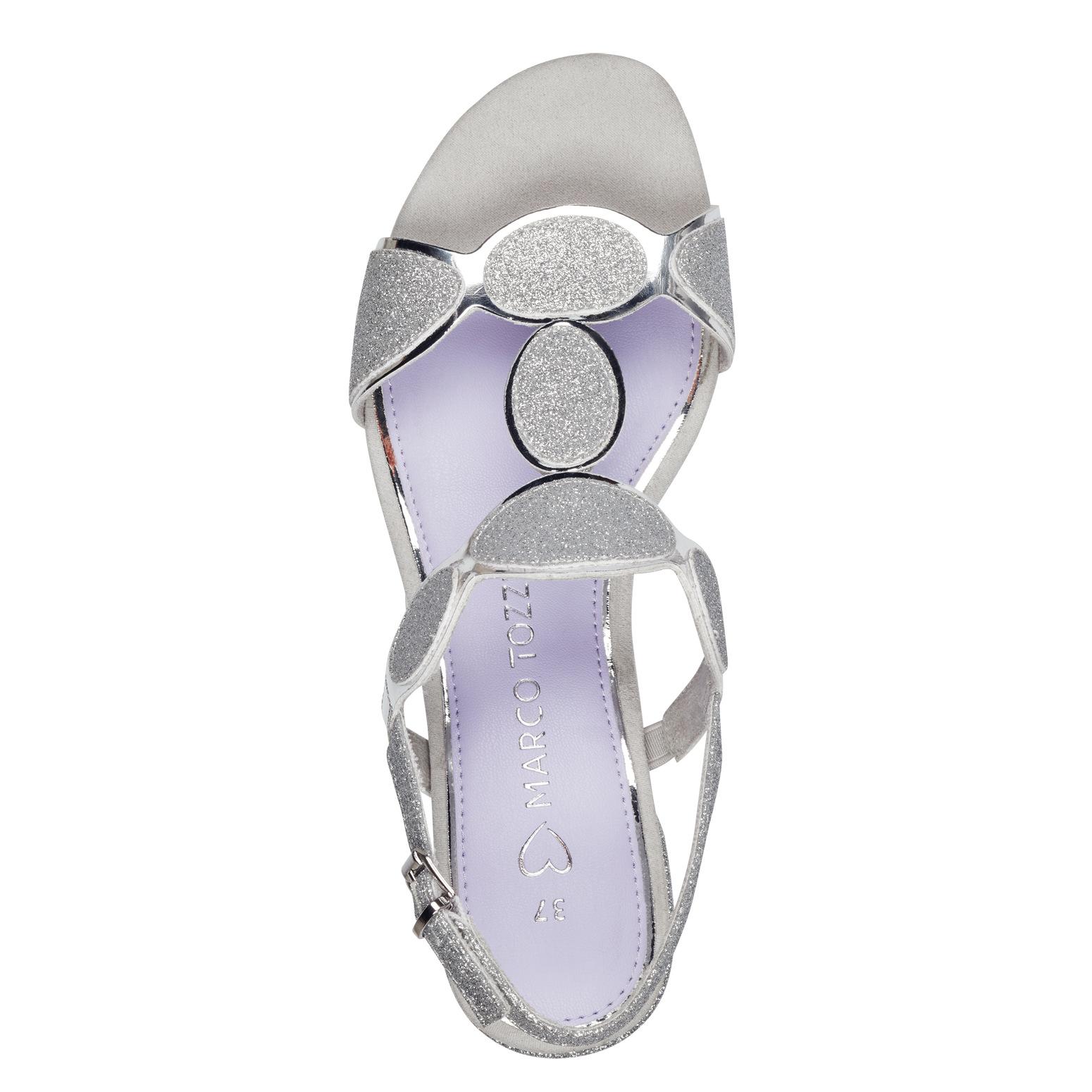 Elagenatní stříbrné sandály značky Marco Tozzi. Svrchním materiálem je kombinace syntetiky a textilu. Vyměkčená nášlapná stélka je syntetická. Obuv je stabilní díky širšímu pohodlnému podpatku. Podešev je vyrobená z kvalitního syntetického materiálu.
