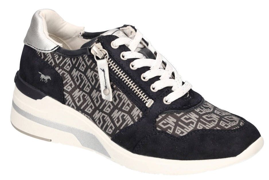 Dámské modré tenisky na klínku od značky Mustang. Pro snadnější obouvání je u šněrování funkční zip. Tenisky jsou vyrobeny ze syntetického materiálu. Vhodná obuv na procházky, do města i do práce.