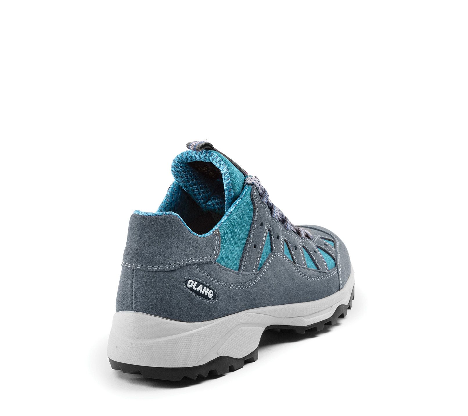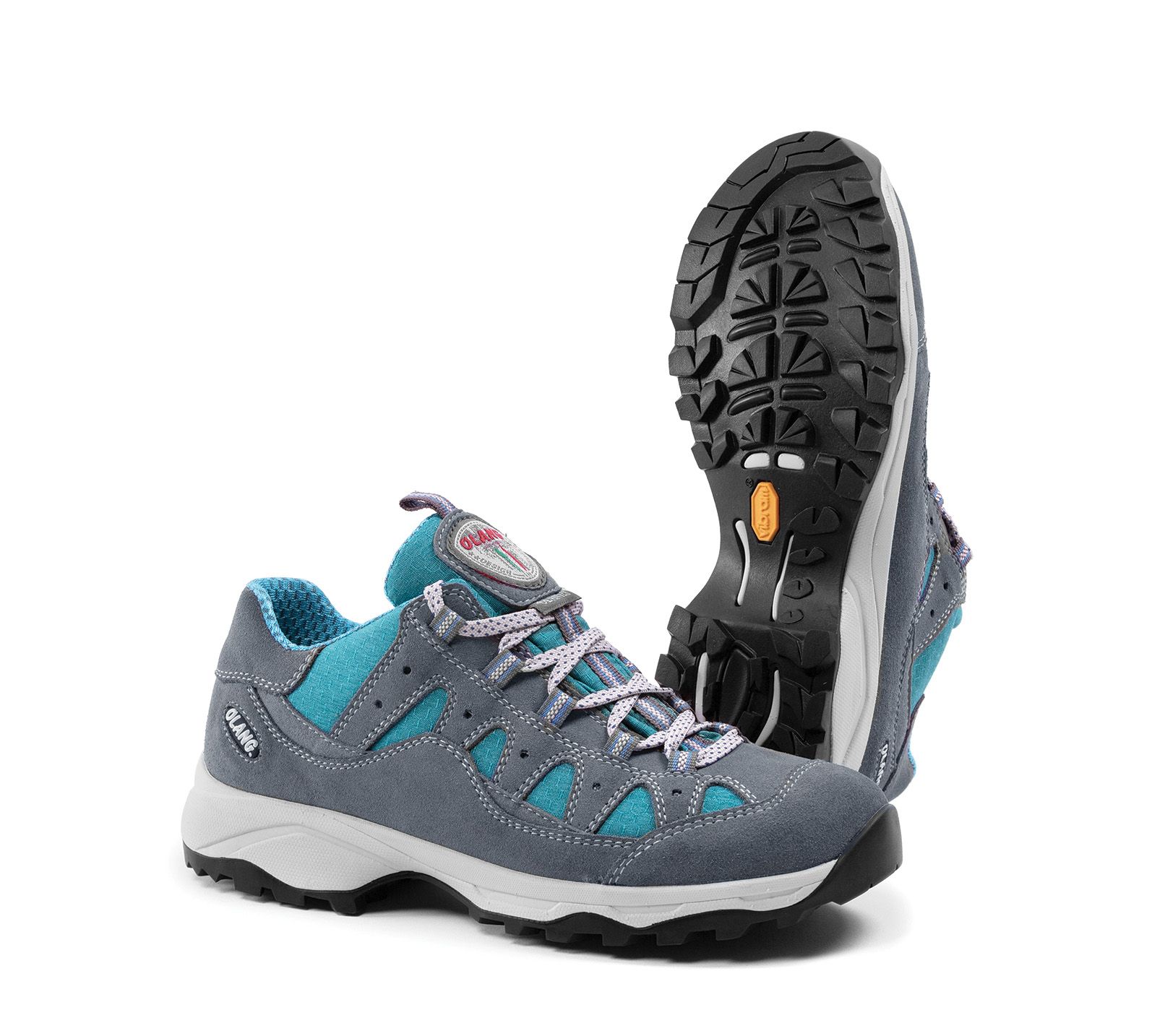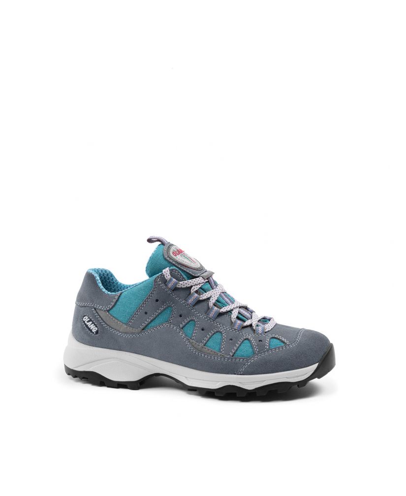 Dámská kožená trekingová obuv Olang v šedé barvě. Komfort zajišťuje měkká vyjímatelná stélka. Obuv je vybavená membránou Olantex a podešví Vibram. Podešev s protiskluzovým dezénem tlumí nárazy při došlapu a celkově zvyšuje komfort.