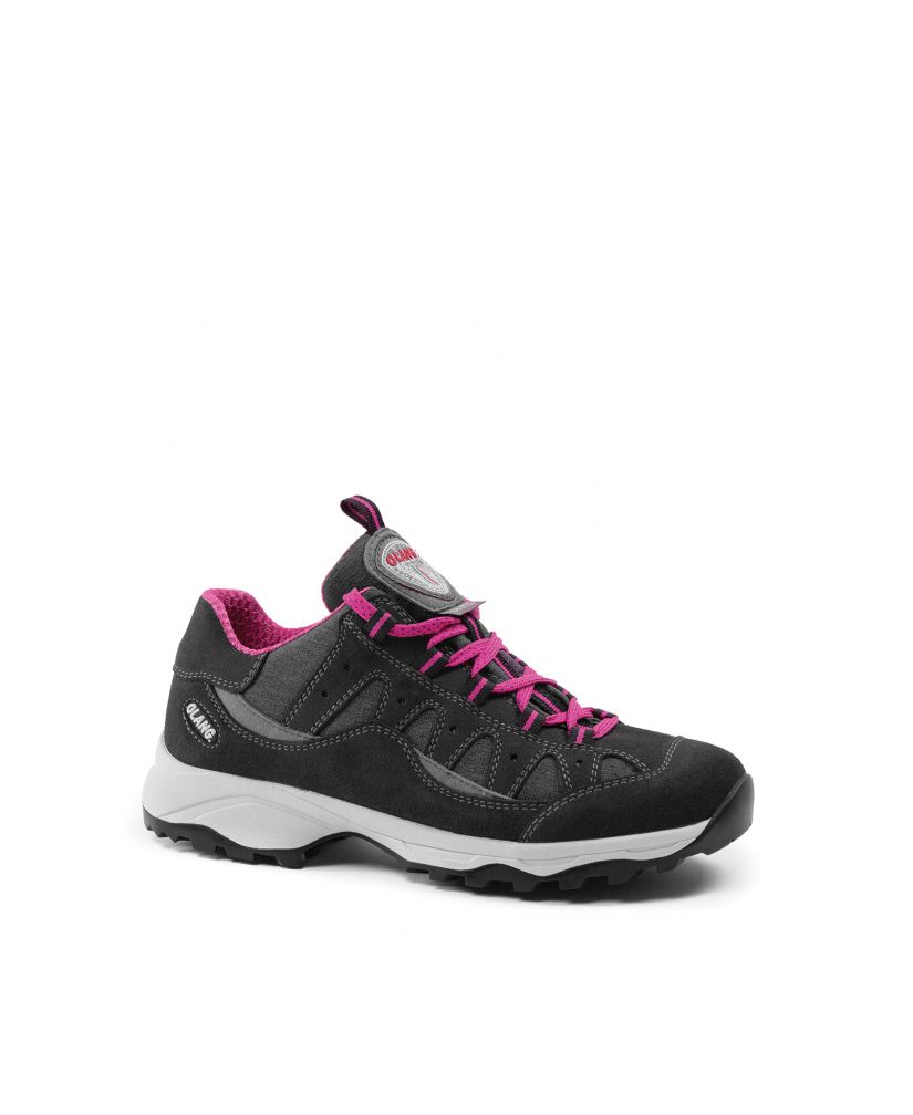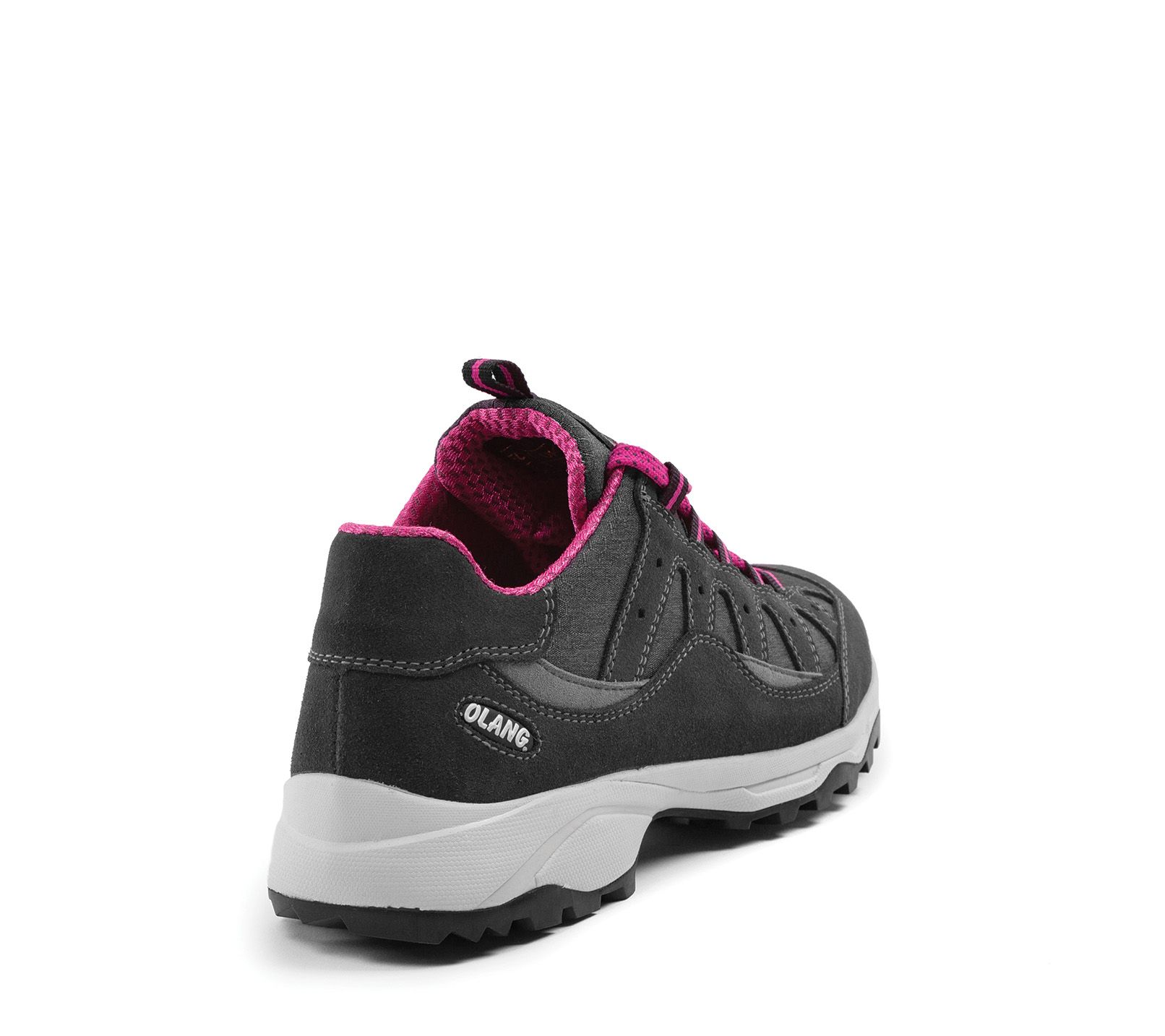 Dámská kožená trekingová obuv Olang v šedé barvě. Komfort zajišťuje měkká vyjímatelná stélka. Obuv je vybavená membránou Olantex a podešví Vibram. Podešev s protiskluzovým dezénem tlumí nárazy při došlapu a celkově zvyšuje komfort.