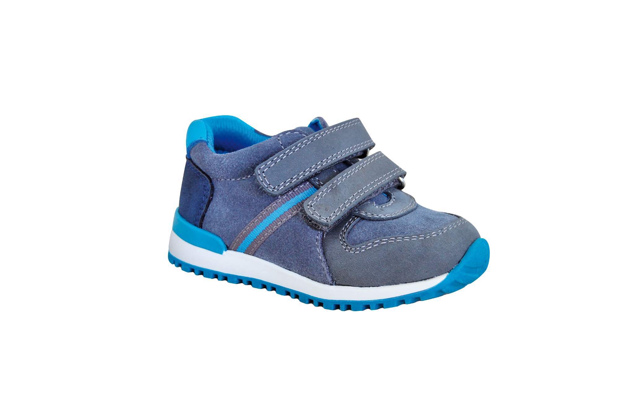 Chlapecká celoroční obuv modré barvy, se zapínáním na dva suché zipy, je vhodná pro každodenní nošení. Obuv má nepatrně zvýšenou špičku, příjemnou stélku a svršek vyrobený ze semišové kůže. Pohodlná ohebná podešev kopíruje dětské chodidlo.