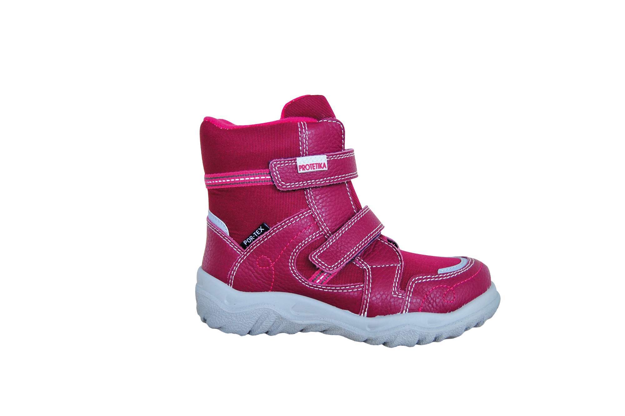 Dívčí zimní obuv růžové barvy, má zapínání na suchý zip. Boty jsou zatepleny hřejivým kožíškem, mají měkčenou podešev se vzorkem. Díky membráně PRO-TEX jsou nepromokavé a prodyšné. Obuv má zvýšenou špičku, pevný opatek a anatomicky tvarovanou stélku s podporou klenby. Zdravotní nezávadnost je samozřejmostí.