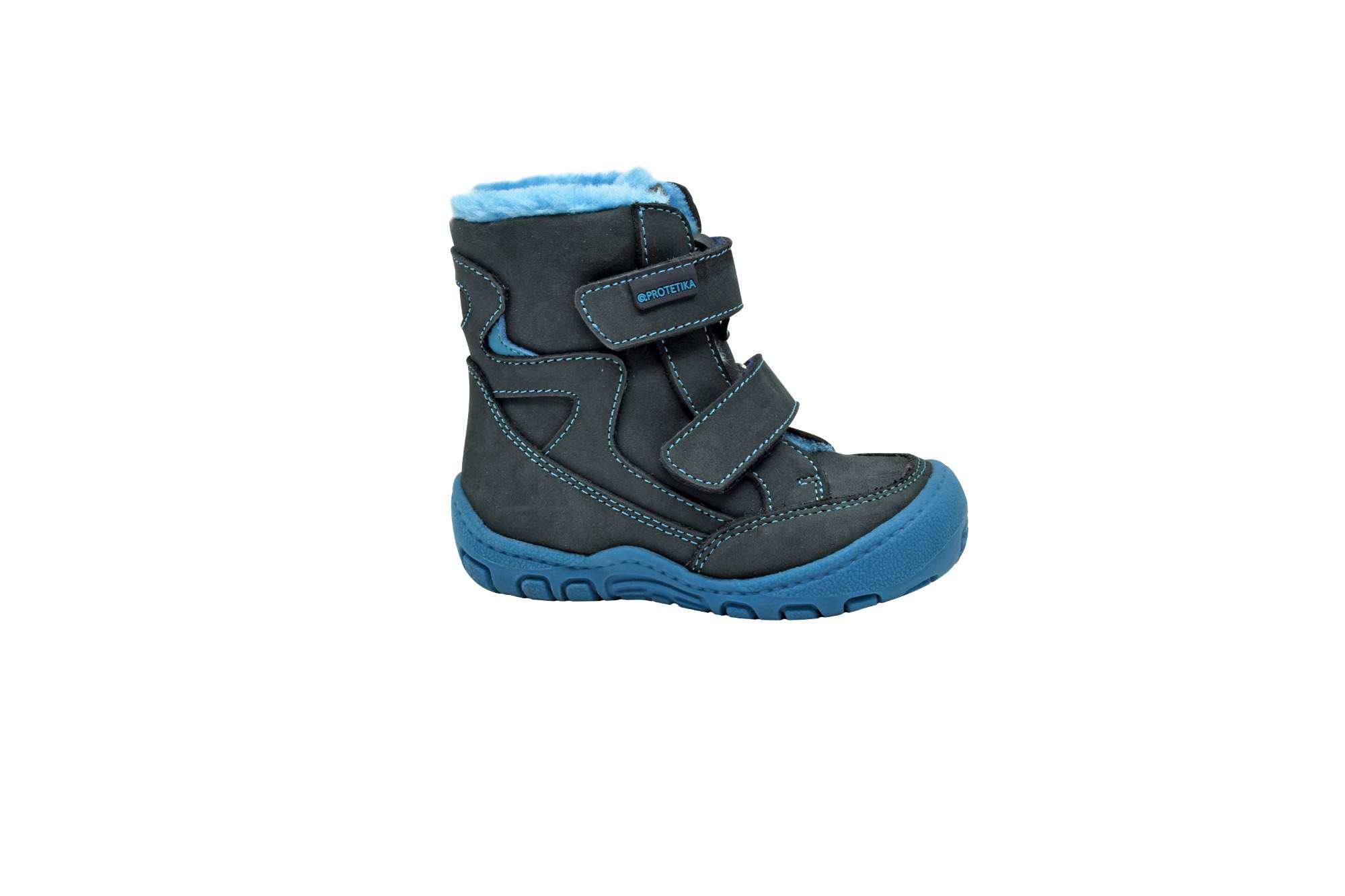 Dětská zimní obuv značky Protetika se zapínáním na dva suché zipy. Vnitřní část je zateplená kožíškem. Boty mají vyjímatelnou flísovou stélku s podporou klenby. Obuv má pevný opatek a pogumovanou špici.