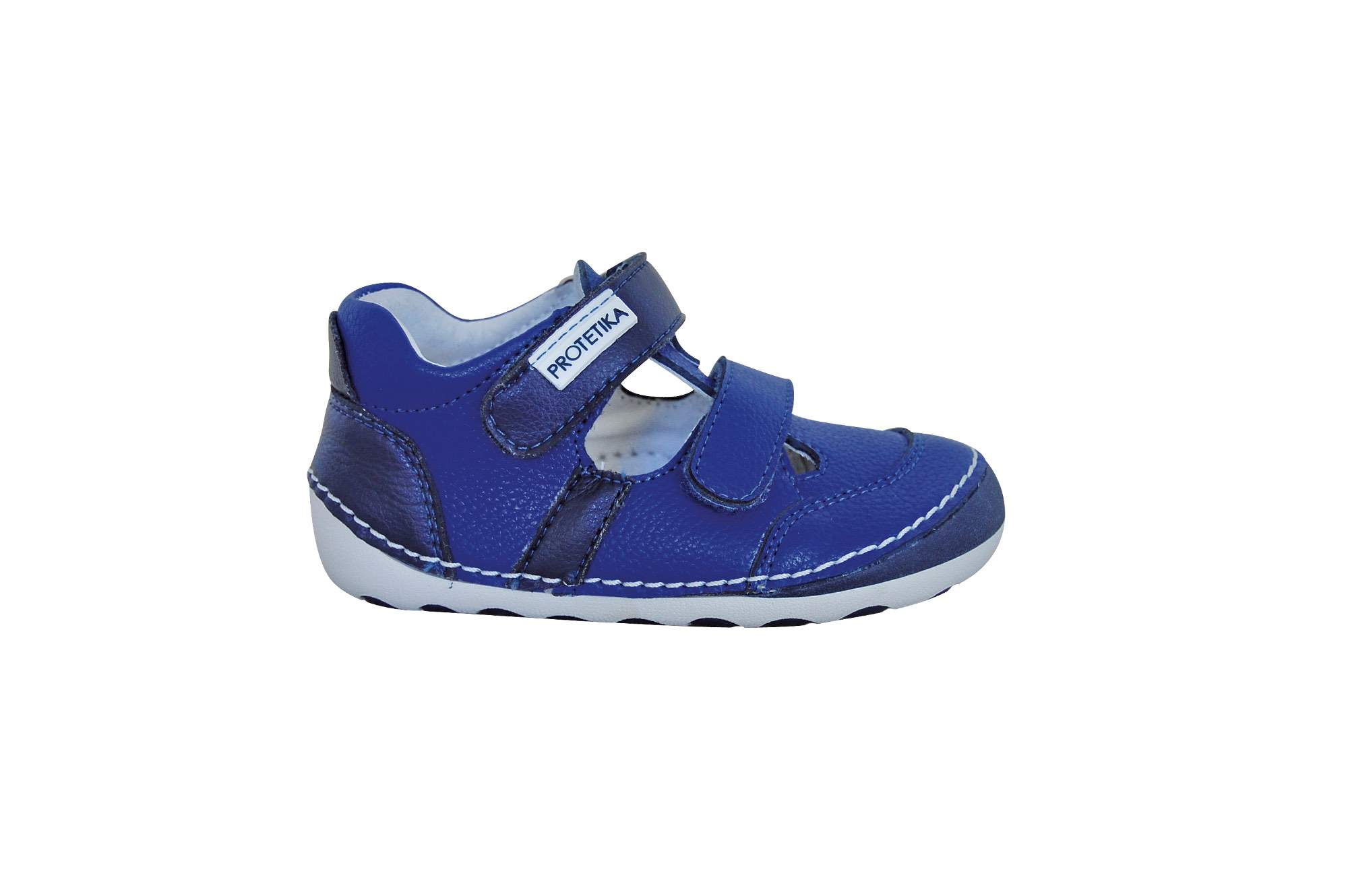 Chlapecká celokožená barefootová obuv modré barvy má zapínání na suchý zip. Svršek obuvi je přišitý a podlepený k podešvi. Vyjímatelná kožená stélka je bez podpory klenby. Špička je tvarovaná tak, aby poskytovala dostatek prostoru pro prsty. Obuv je maximálně měkká a flexibilní, nemá žádný opatek.