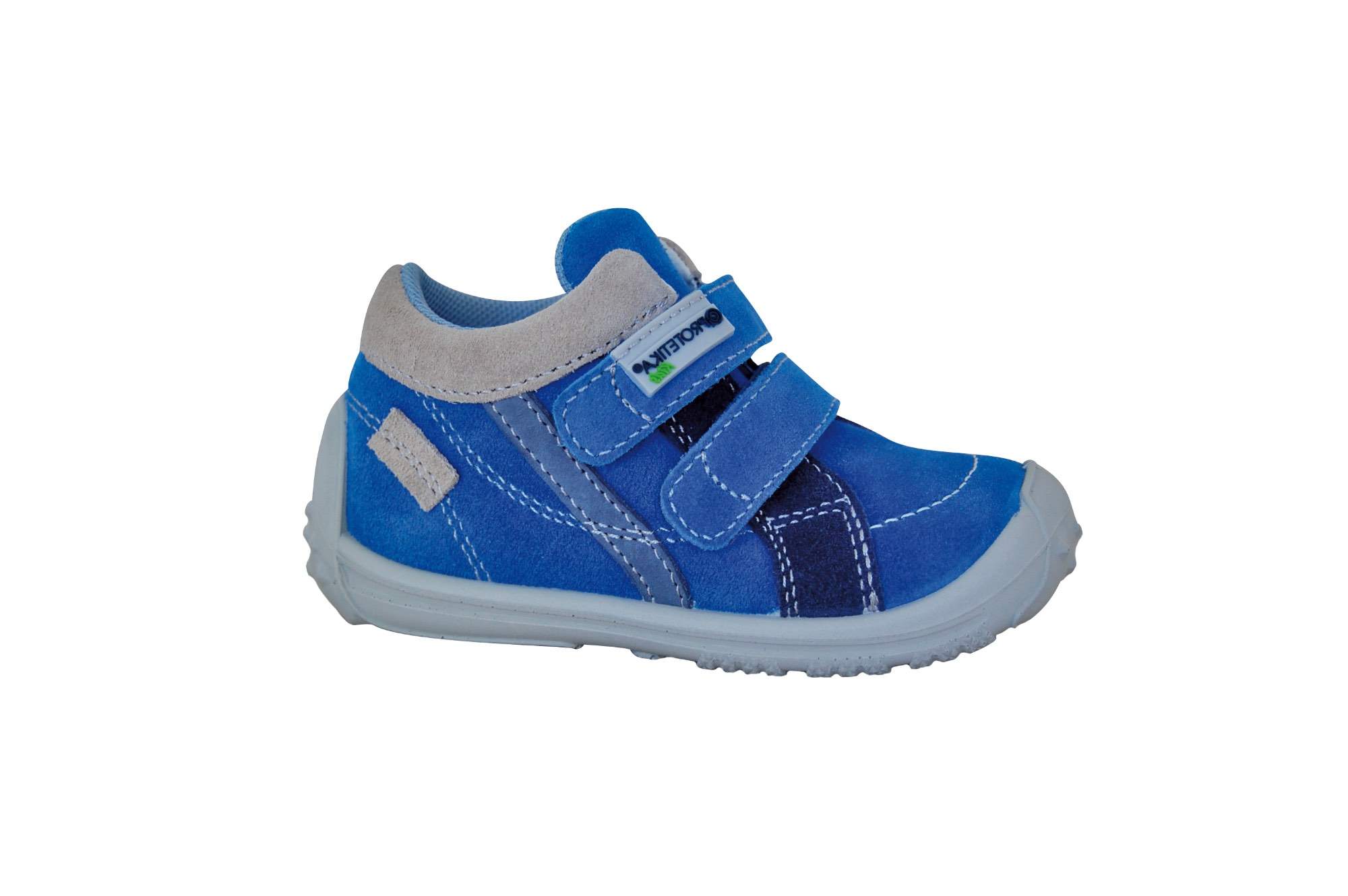 Chlapecká kožená obuv modré barvy má zapínání na suchý zip. Boty se mohou pochlubit vyjímatelnou koženou stélkou. Vysoce flexibilní podešev není lepená, ale jedná se o přímý nástřik. Obuv je nepromokavá a současně prodyšná. Má zvýšenou špičku chránící proti okopu. Zdravotní nezávadnost je samozřejmostí.