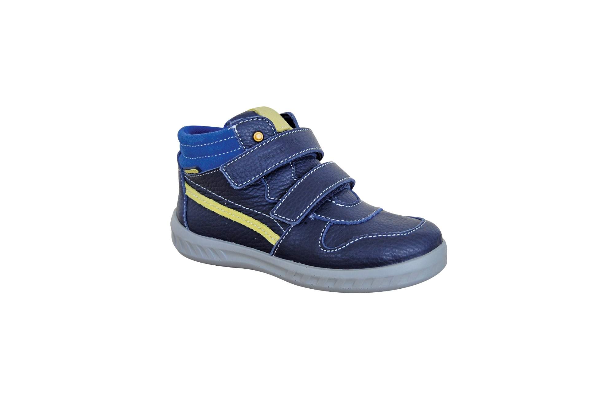 Chlapecká kotníčková kožená obuv modré barvy. Je vyrobená z hladké kůže. Obuv je lehká a krásně ohebná. Vnitřní stélka je vyjímatelná a anatomicky tvarovaná. Zapínání na dva suché zipy. Obuv s membránou PRO-tex.