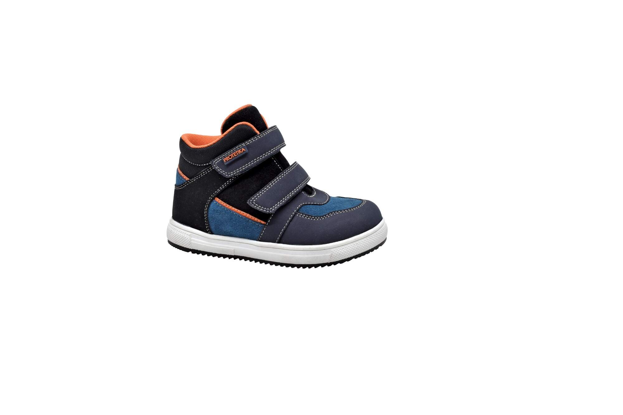 Dětská celoroční kotníčková obuv značky Protetika. Svršek je tvořen kombinací broušené kůže a hladké lícové kůže. Stélka je kožená, vyjímatelná a anatomicky tvarovaná. Zapínání je na dva suché zipy.