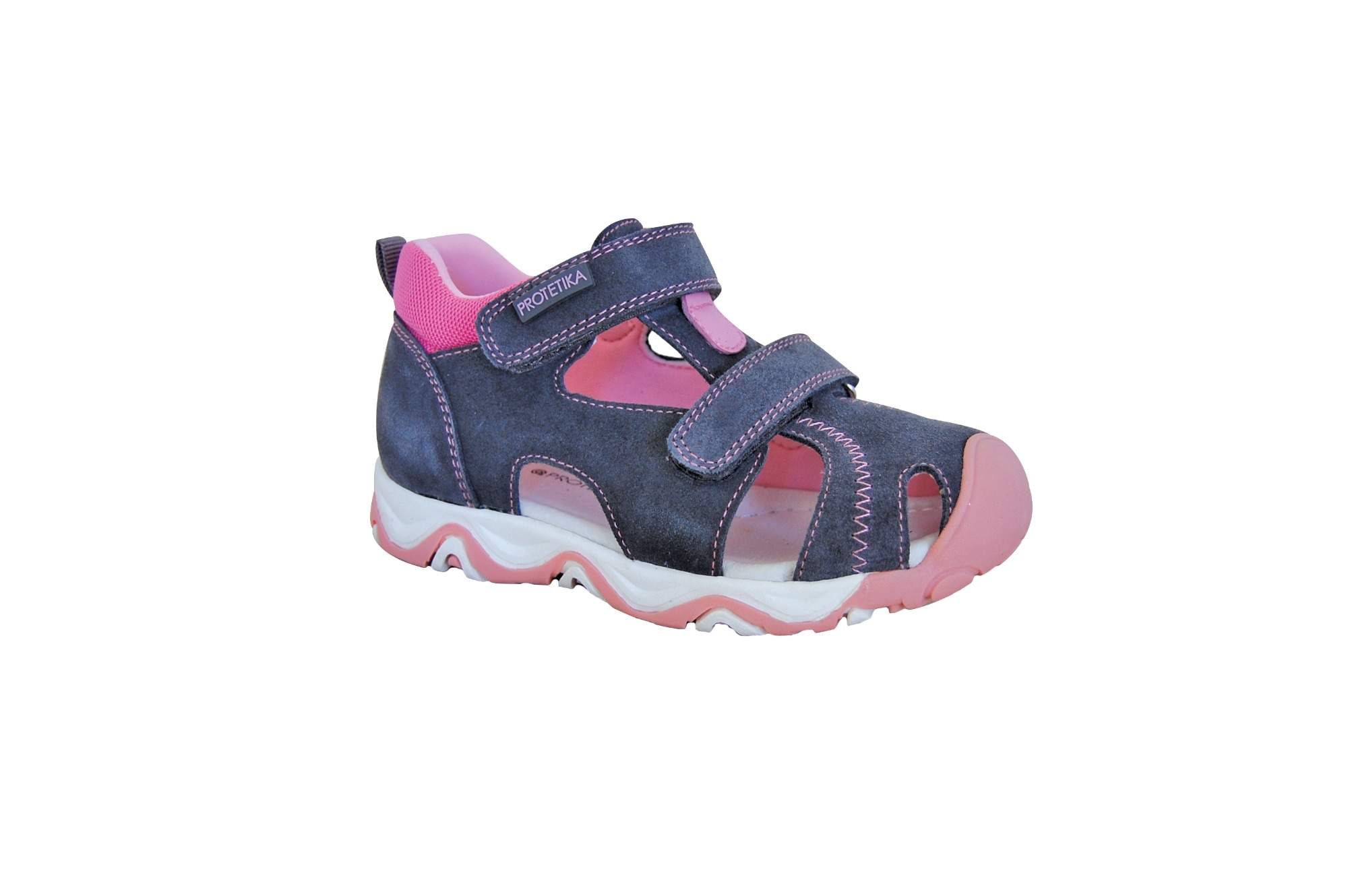 Dívčí kožené letní sandálky Protetika. Zapínání na dva suché zipy. Obuv má uzavřenou špičku a pevný opatek. Vnitřní stélka je kožená, tvarovaná. Praktické přetažení gumy přes špičku chraní obuv před odíráním.