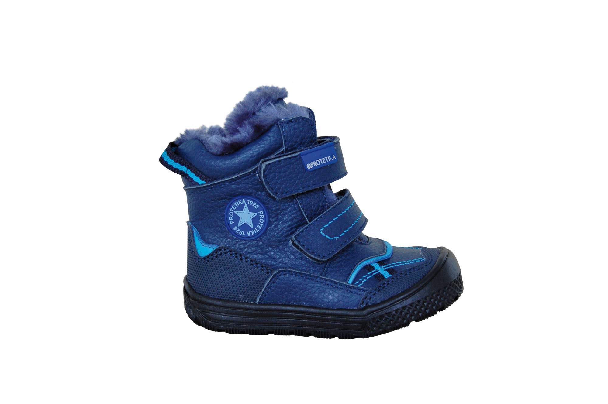 Chlapecká zimní obuv modré barvy, má zapínání na suchý zip, zpevněnou patu a zvýšenou špičku. Svrchní část je vyrobena z přírodní kůže, uvnitř jsou boty zatepleny hřejivým kožíškem. Zdravotní nezávadnost je samozřejmostí.