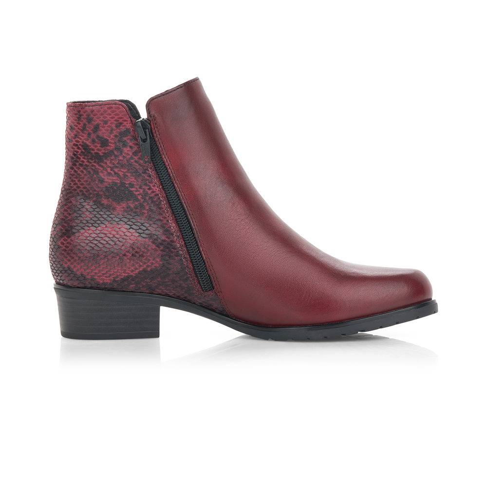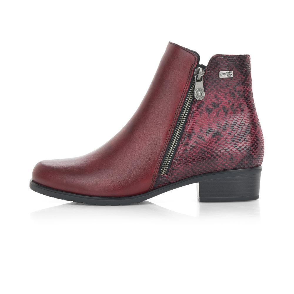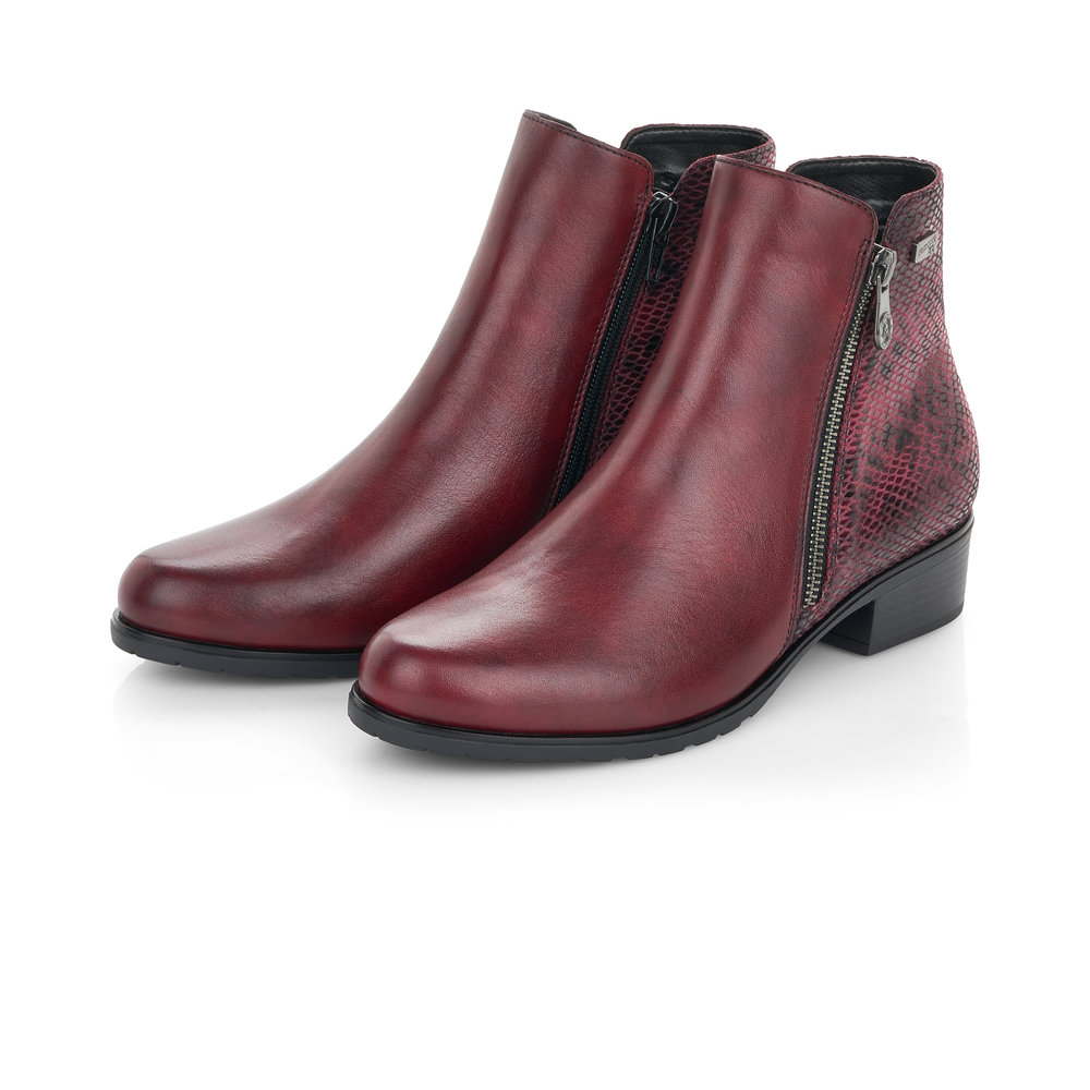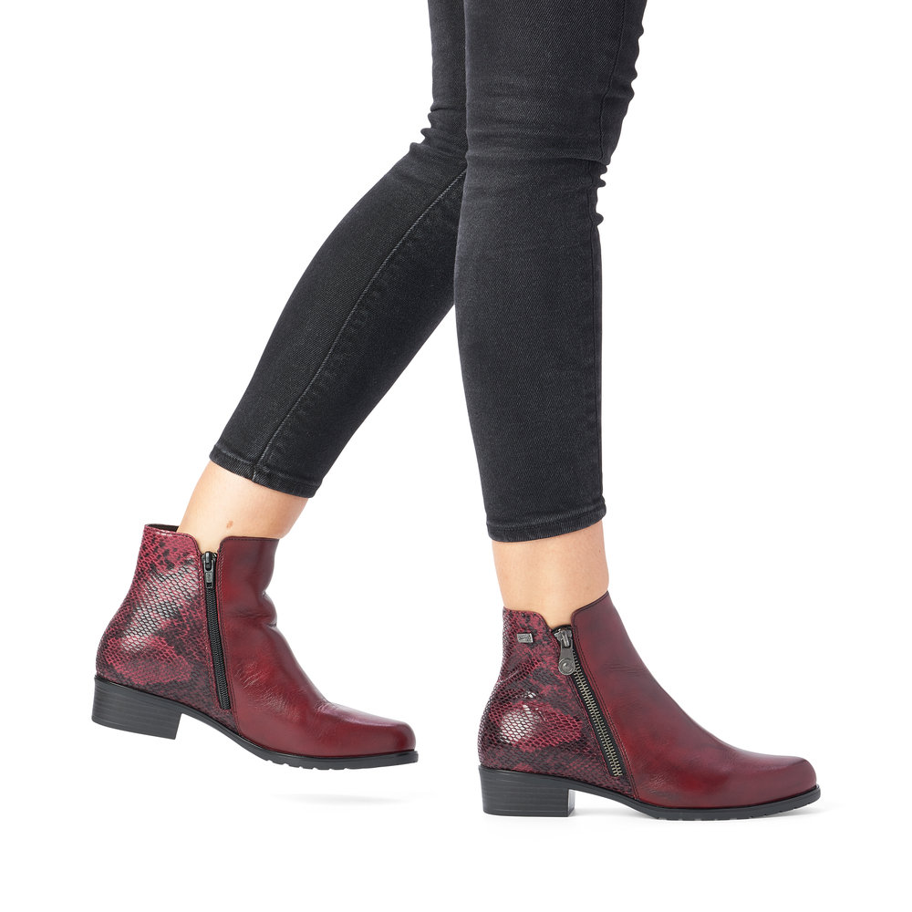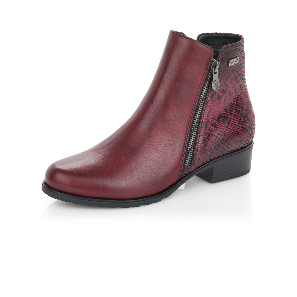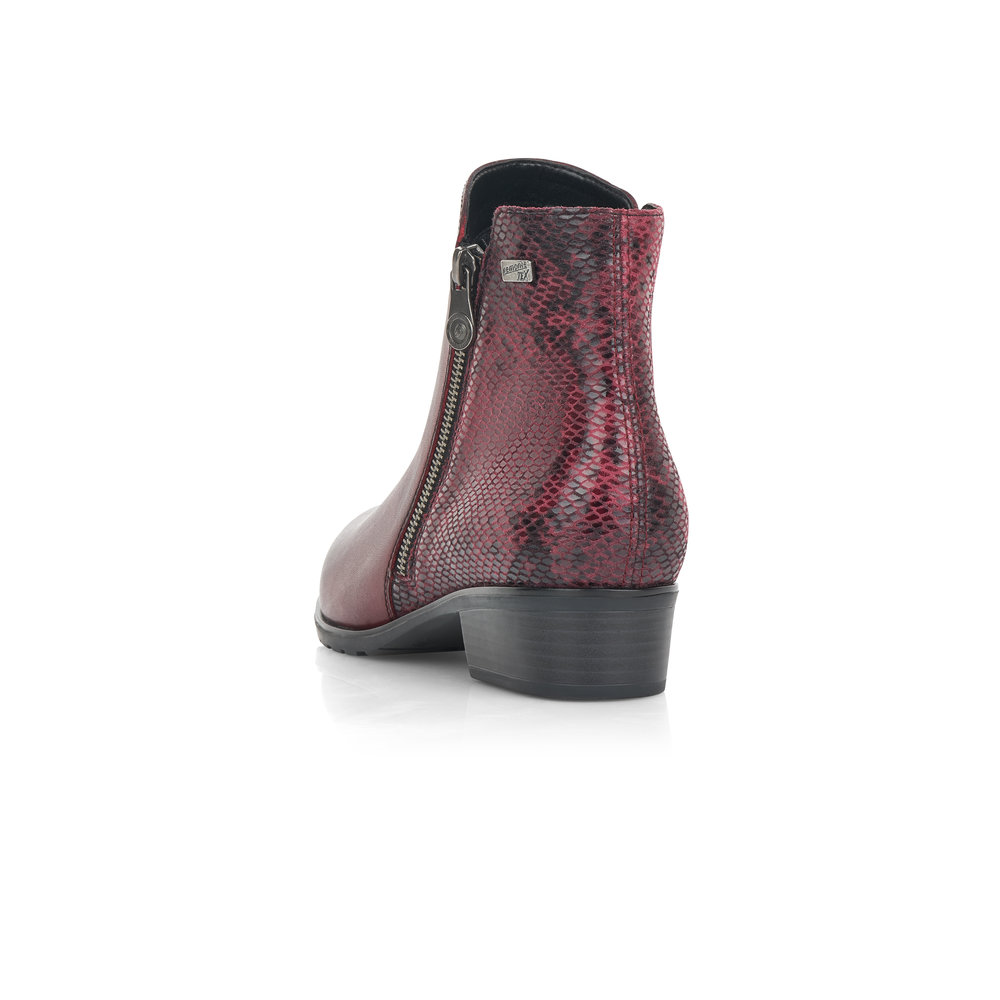 Dámská kotníková obuv na nízkém podpatku značky Remonte (jedná se o vyšší řadu značky RIEKER). Hadí vzor v patní části dodá obuvi šmrnc. Postranní zipy Vám pomohou s obutím a vyzutím. Měkká vyjímatelná stélka je příjemná pro celodenní nošení.