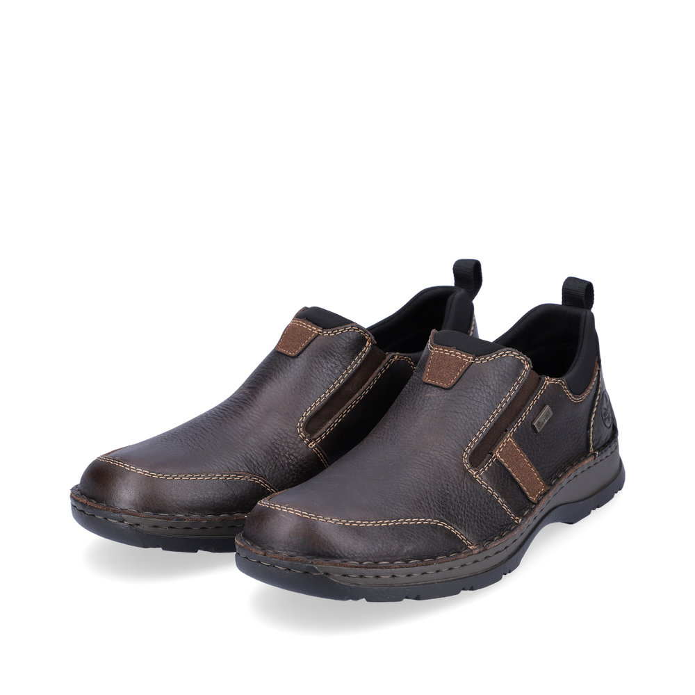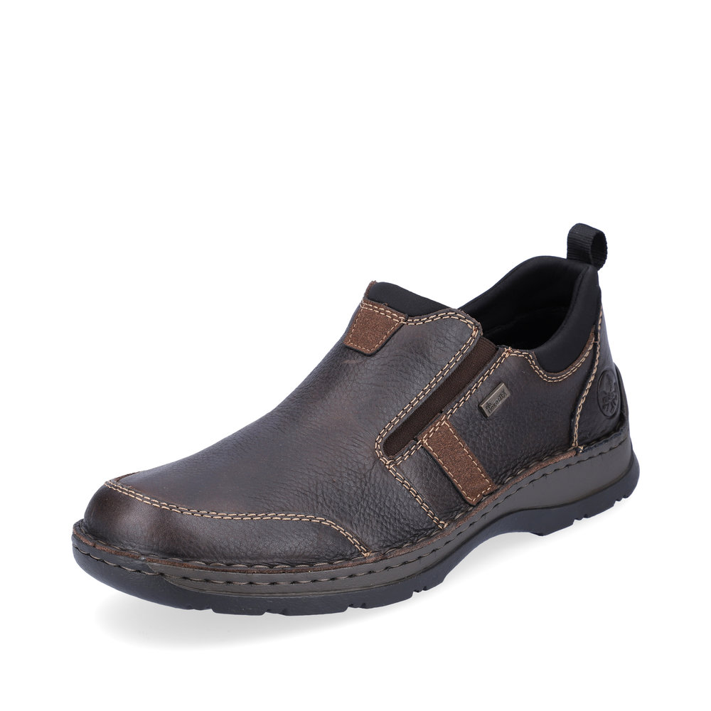 Pánské hnědé mokasíny značky Rieker. Svrchní materiál je kombinace kůže a syntetického materiálu. Po obou stranách je všitá guma, díky tomu se obuv dobře nazouvá. Podešev je díky technologii Antistress lehká a flexibilní. Měkká stélka z paměťové pěny zaručí maximální pohodlí i při dlouhodobé chůzi. Obuv je vhodná i pro širší chodidlo - extra width.