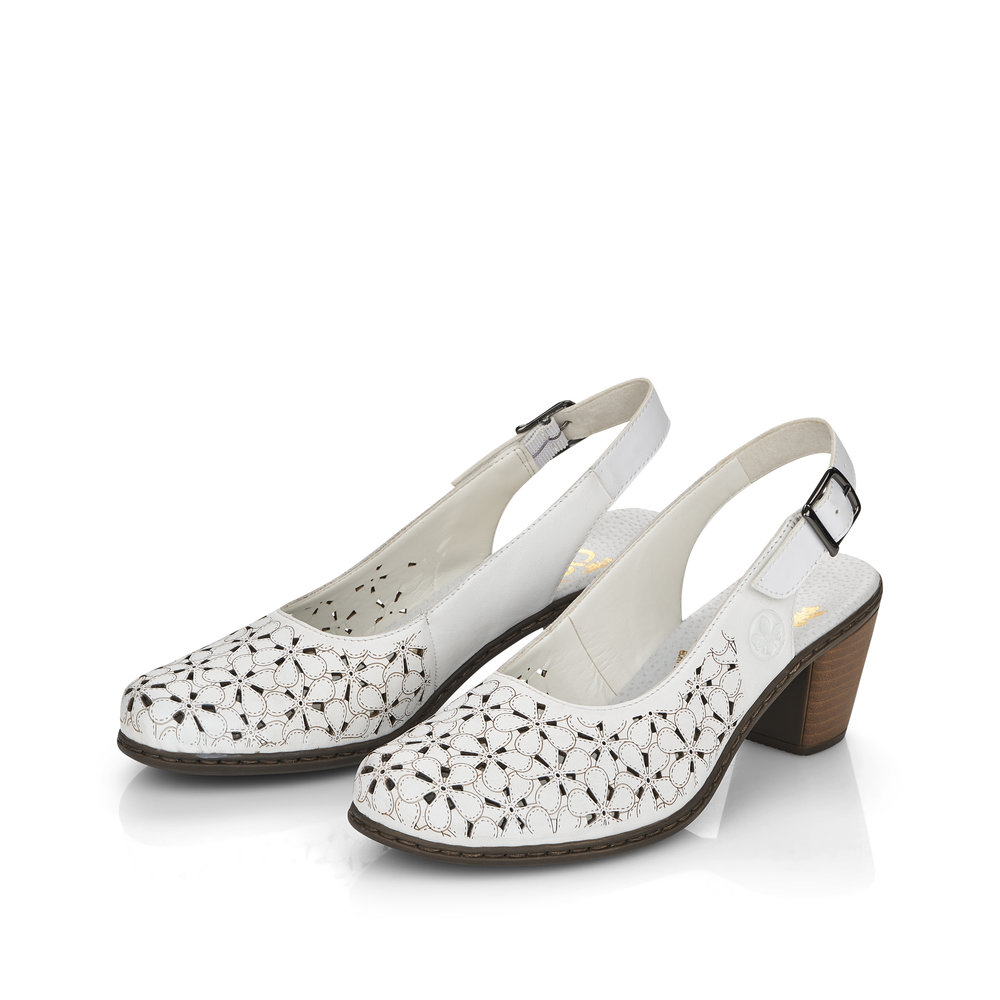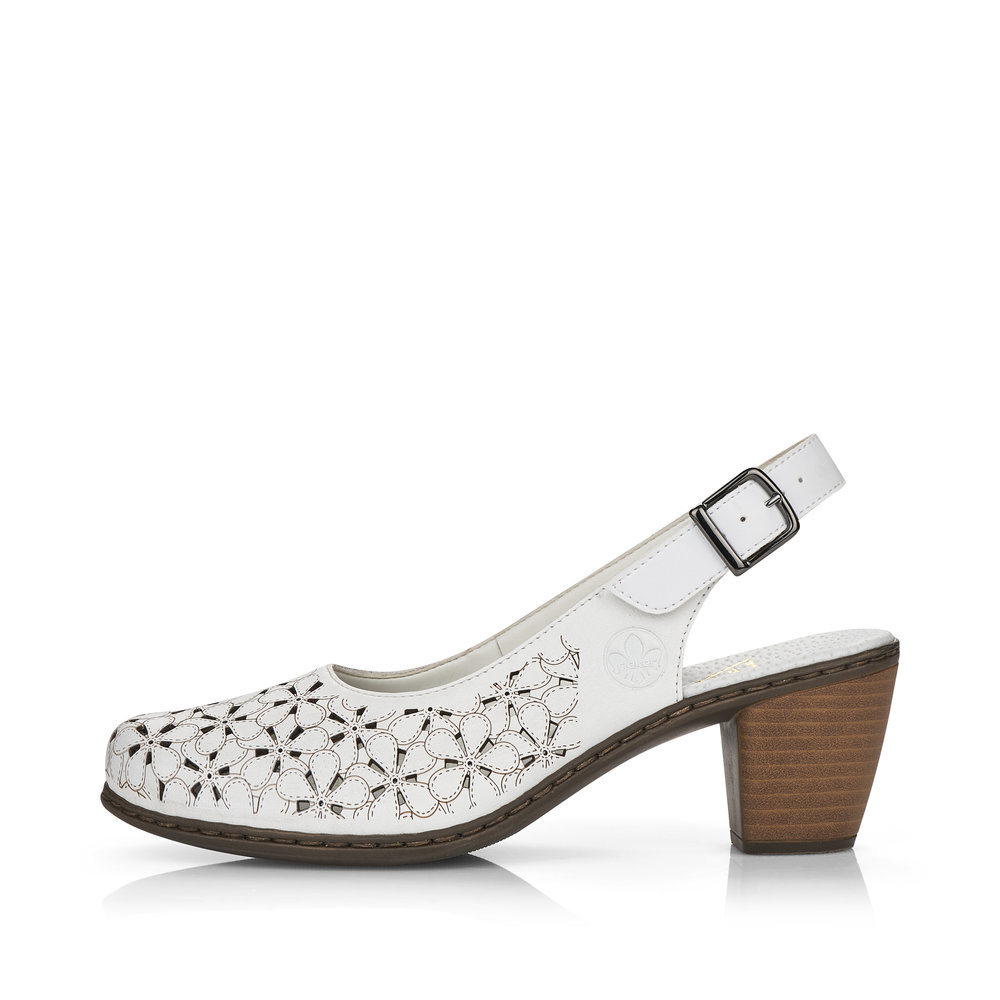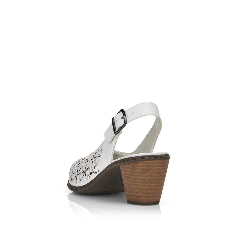 Dámské bílé sandály značky Rieker. Kožený svršek je zdobený designovou perforací, která zajistí prodyšnost obuvi. Pro snadné obutí slouží pásek s přezkou kolem kotníku. Měkká stélka zajistí pohodlnou chůzi.