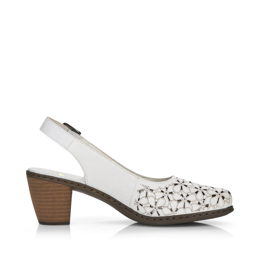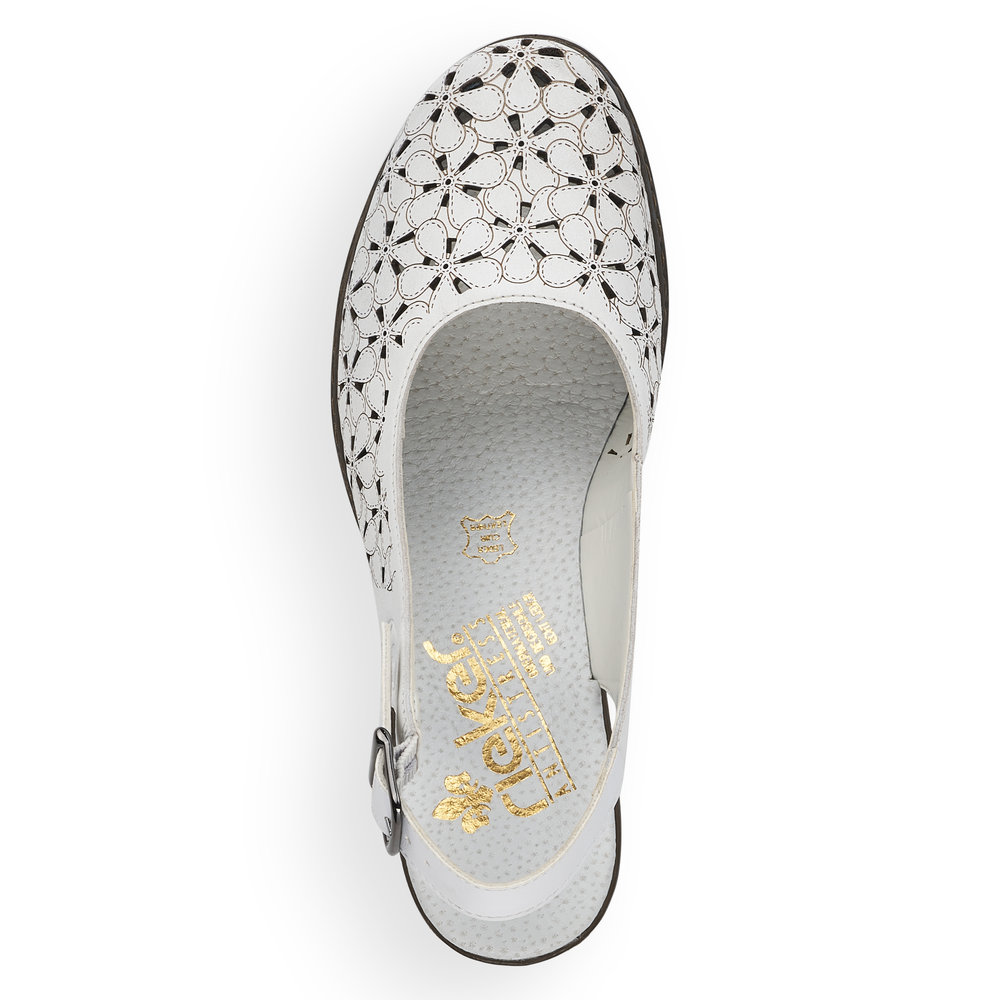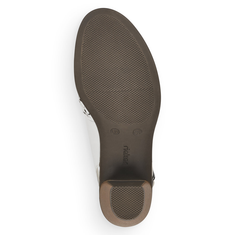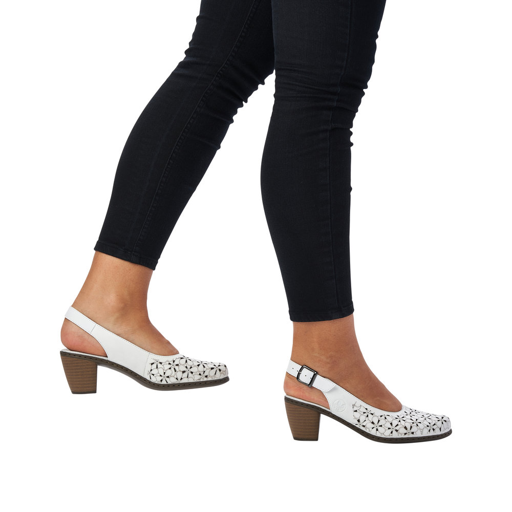 Dámské bílé sandály značky Rieker. Kožený svršek je zdobený designovou perforací, která zajistí prodyšnost obuvi. Pro snadné obutí slouží pásek s přezkou kolem kotníku. Měkká stélka zajistí pohodlnou chůzi.