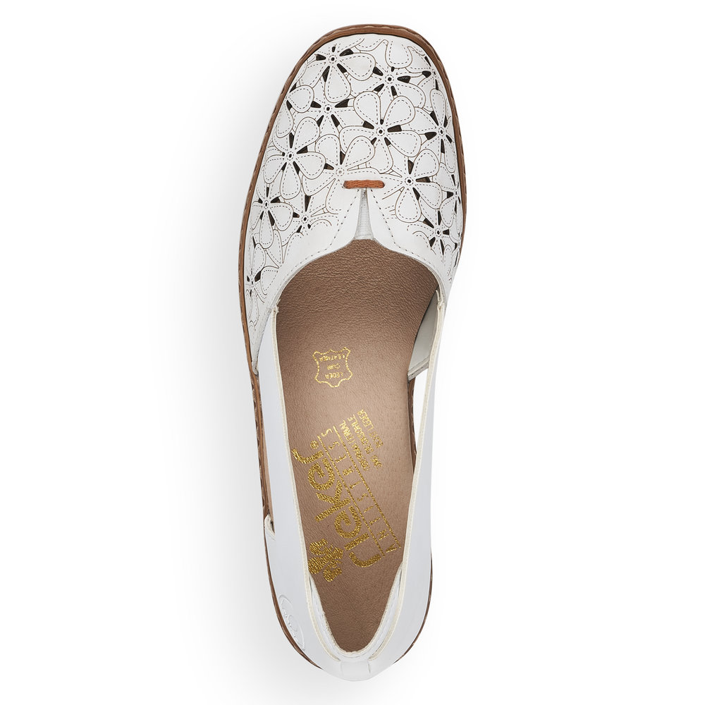 Dámské bílé polobotky na nízkém podpatku značky Rieker. Obuv je zdobená perforací, která zajistí prodyšnost obuvi. Pro snadné obutí a přizpůsobení se Vaší noze slouží pružné gumičky po stranách. Měkká stélka zajistí pohodlnou chůzi. Podešev je díky technologii Antistress lehká, flexibilní, absorbuje nárazy při došlapu a snadno se přizpůsobí každé noze.
