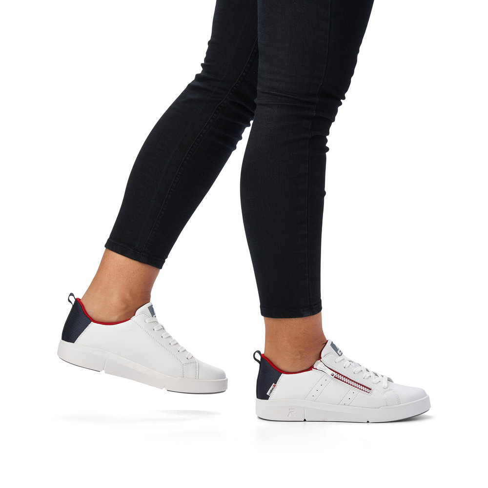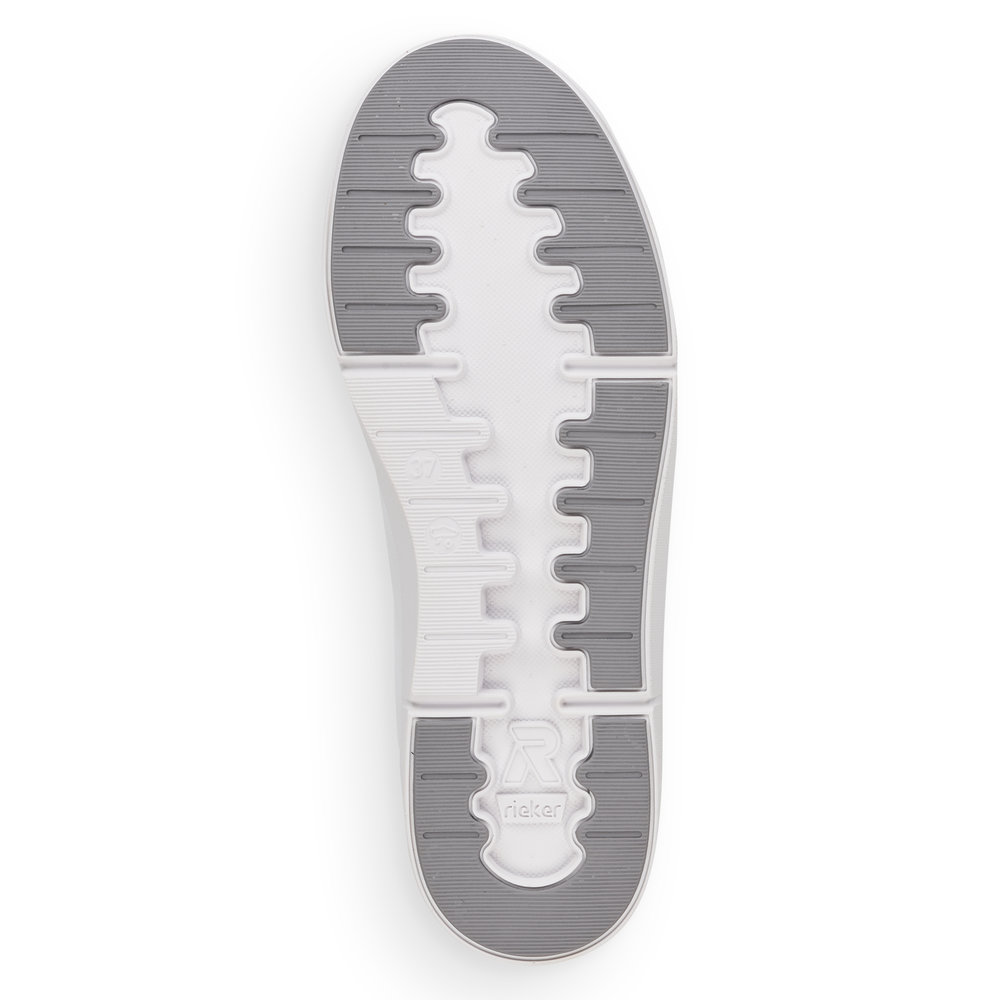 Dámské bílé šněrovací tenisky značky Rieker. Svršek je potahovaný kůží a je kombinován s textilním materiálem. Z boku zip pro snadnější obouvání. Šněrování je klasické pomocí tkaniček, díky kterým můžete botu dokonale přizpůsobit Vaší noze. Unikátní stélka z paměťové pěny změkčuje došlap, maximálně se přizpůsobí tvaru Vašeho chodidla a je vyjímatelná. Podešev je díky technologii Antistress lehká, flexibilní, absorbuje nárazy při došlapu a snadno se přizpůsobí každé noze. Rieker Revolution je nová řada moderní sportovní obuvi s obrovským důrazem na komfort a pohodlí i při celodenním nošení.