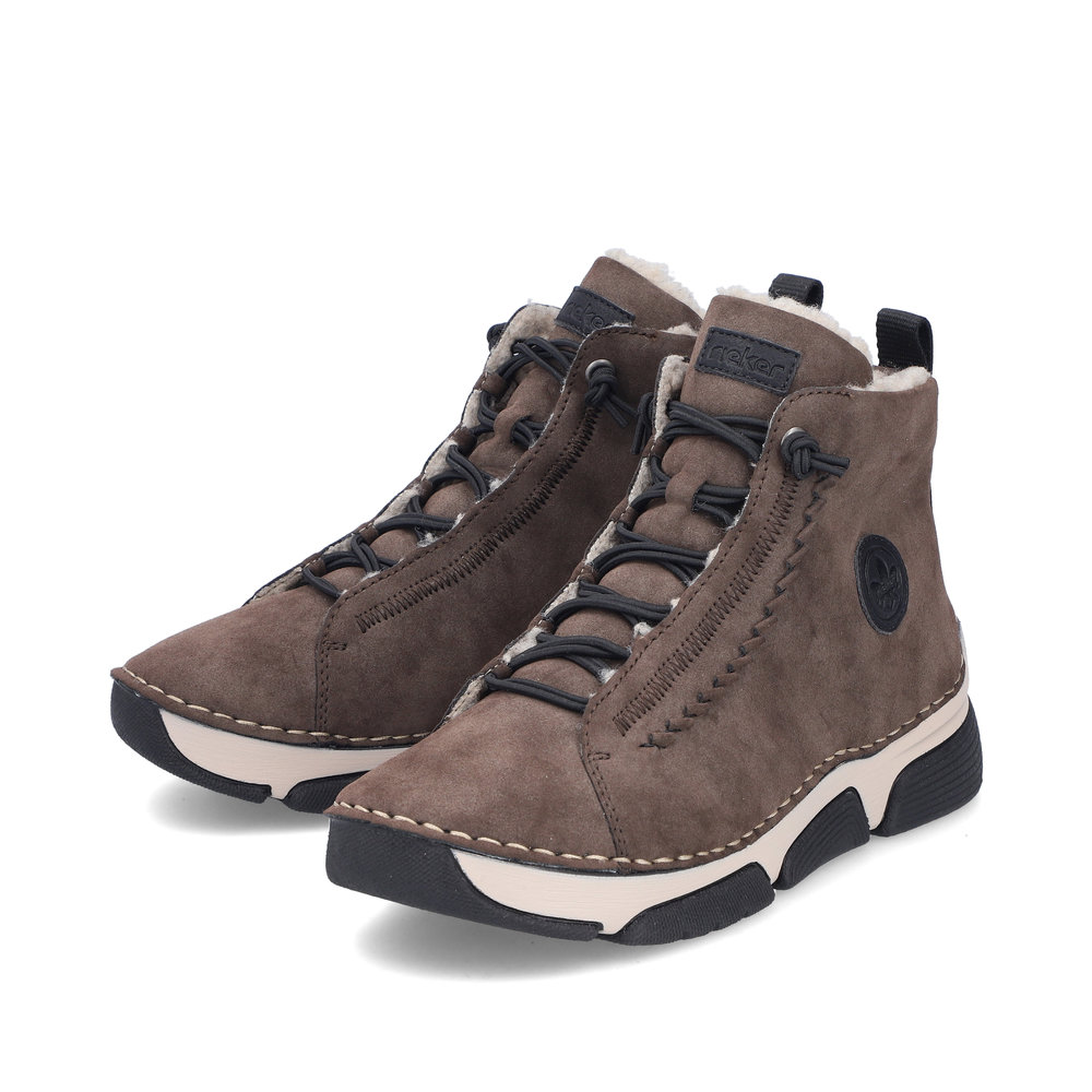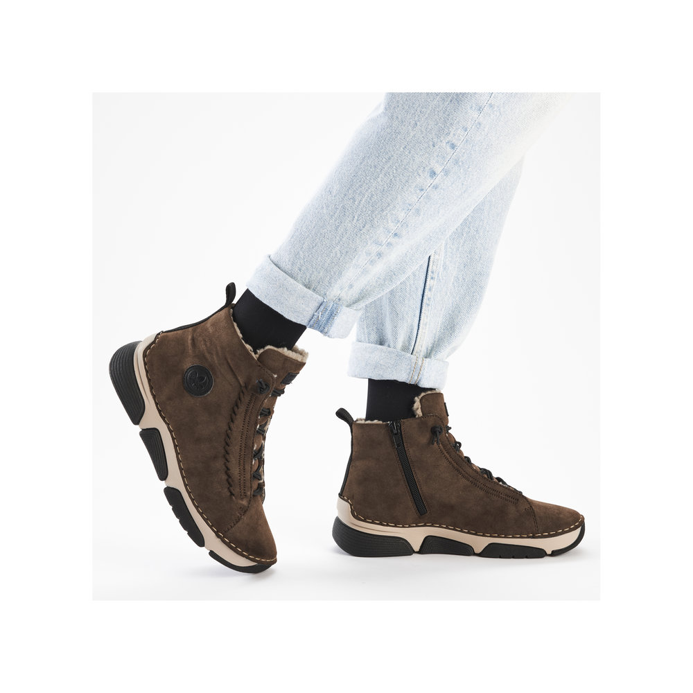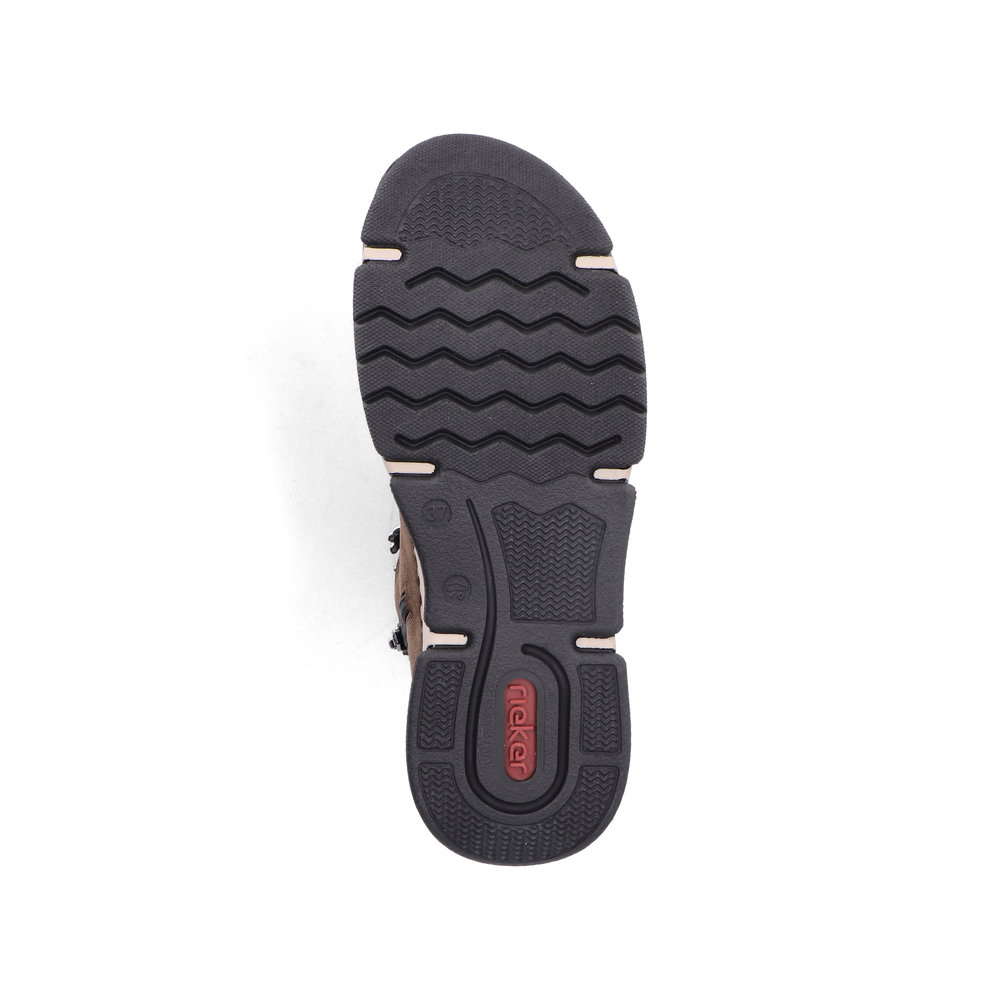 Dámská kotníková obuv v zajímavé hnědé barvě značky Rieker. Jednoduché nazutí zajistí zip z vnitřní části a gumička vsazená namísto šněrování. Design podešve s unikátní kombinací barev nejen esteticky vyniká, ale také poskytuje stabilitu a pohodlí během chůze svou technologií Antistress.