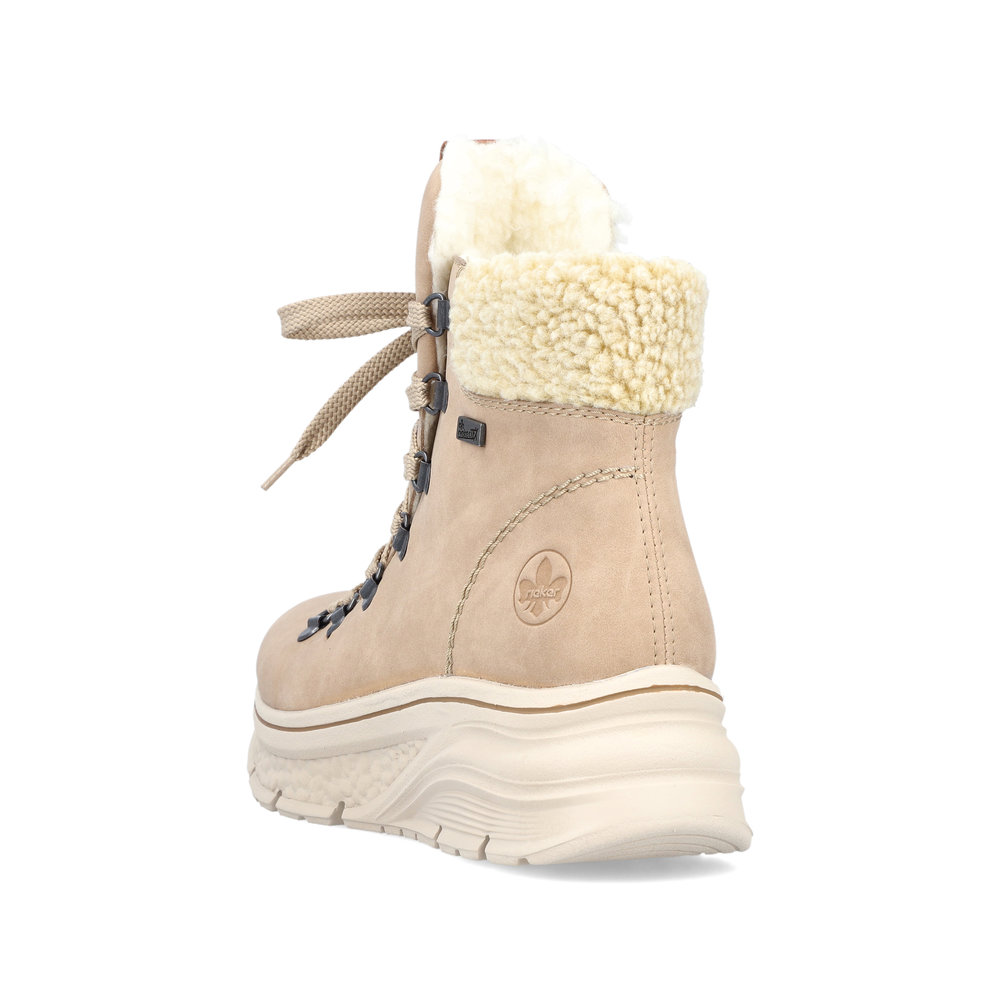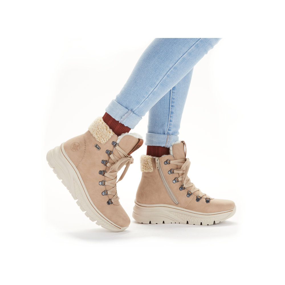Dámská kotníková obuv na šněrování v béžové barvě s bočním zipem na boku. Obuv je ozdobena jemným logem firmy Rieker a je zateplená hřejivým kožíškem. Paměťová stélka je příjemná pro celodenní nošení. Podešev je díky Antistress technologii lehká, flexibilní, absorbuje nárazy při došlapu a snadno se přizpůsobí každé noze. Díky technologii Rieker TEX je obuv nepromokavá a přesto prodyšná.