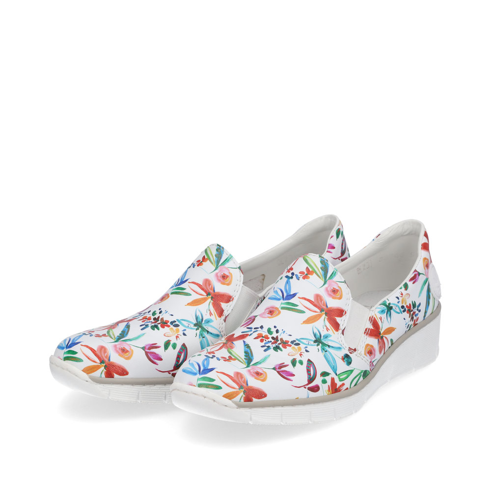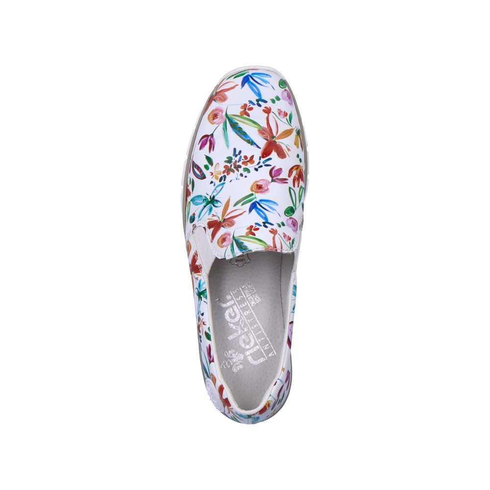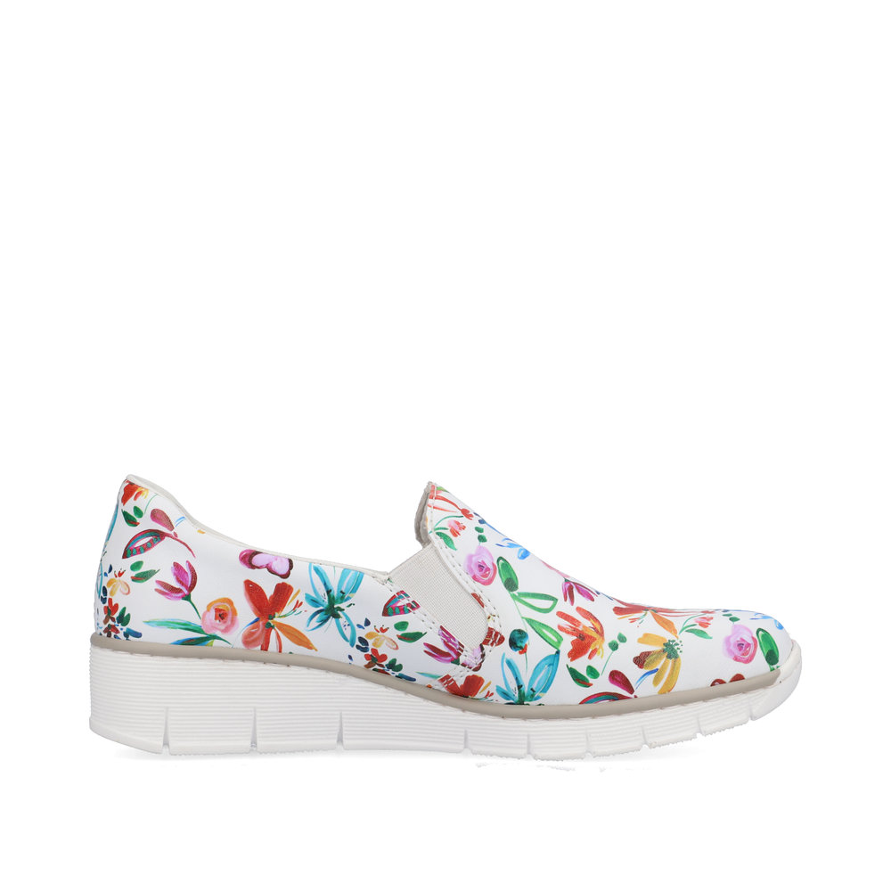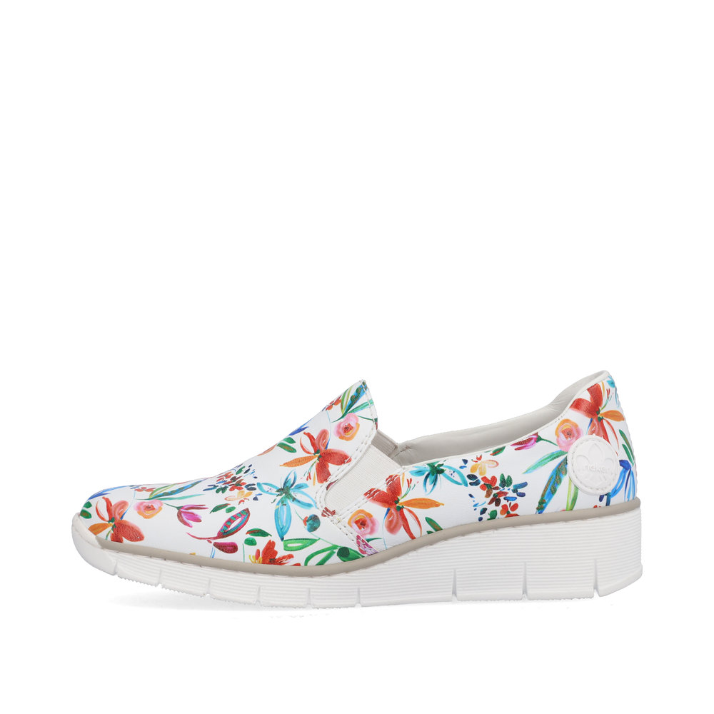 Elegantní dámské bílé mokasíny s květinovým vzorem značky Rieker. Podešev je vyrobena z kvalitního syntetického materiálu. Obuv je lehká, flexibilní, tlumí nárazy a otřesy při došlapu a přizpůsobí se každé noze. Díky vsazeným gumičkám po stranách se snadno obouvá.