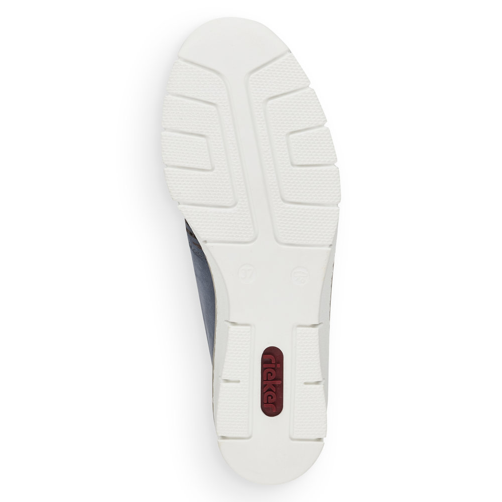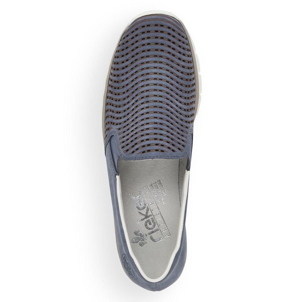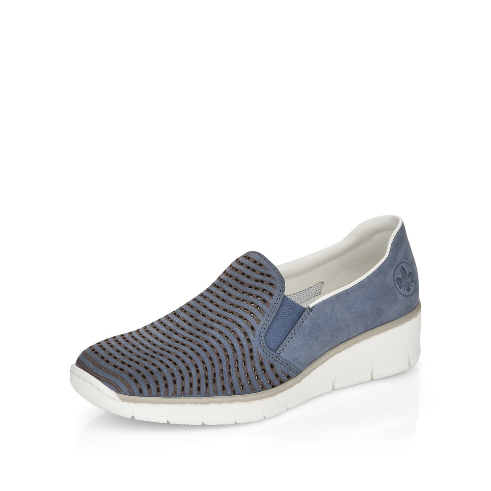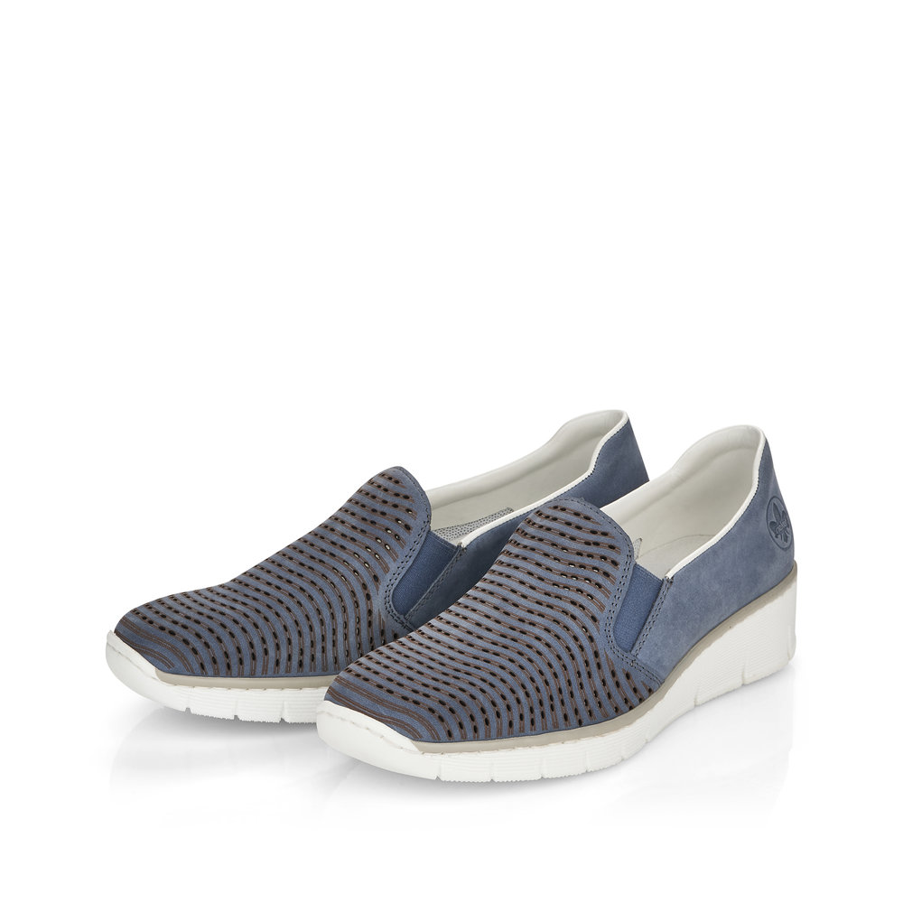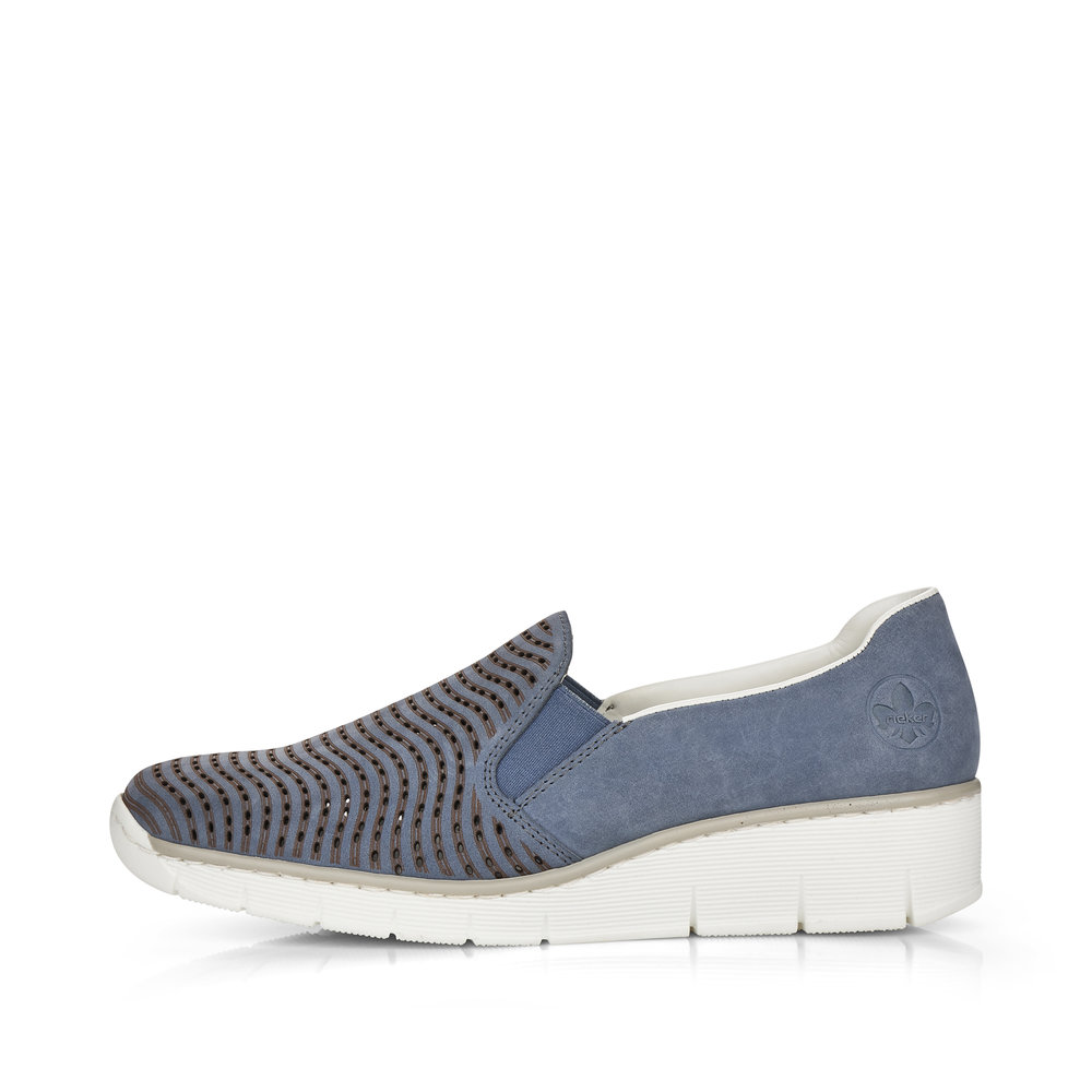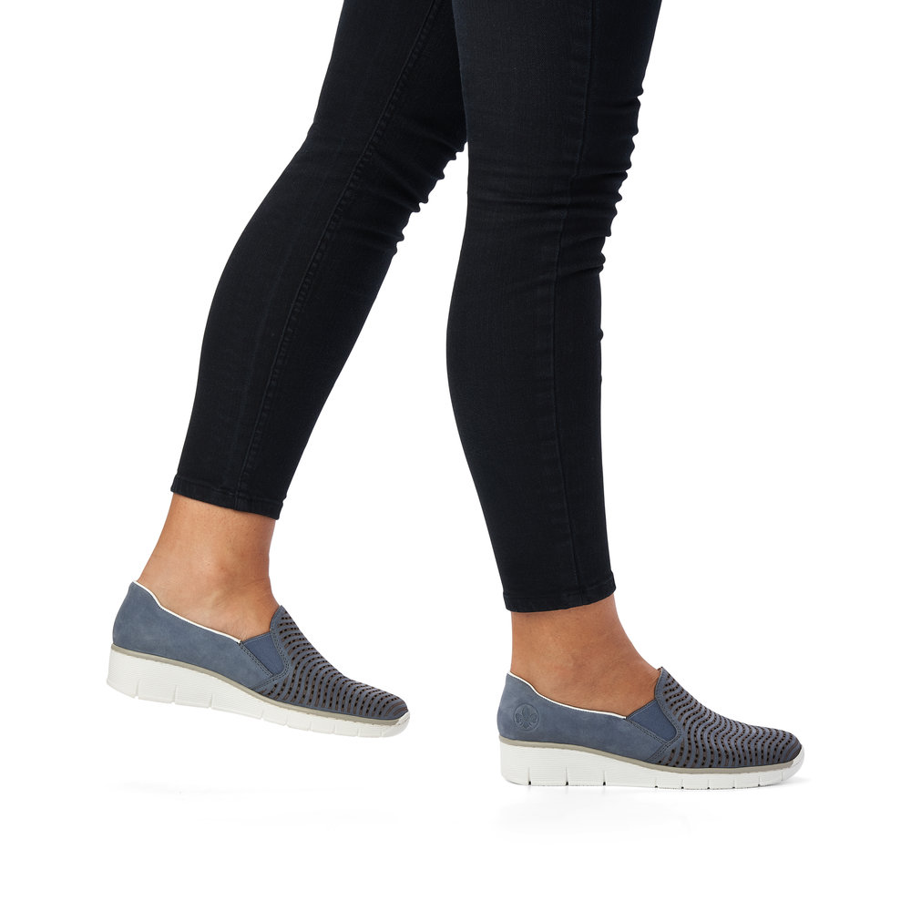 Dámské perforované mokasíny na klínku v modré barvě značky Rieker. Svršek je z koženého materiálu. Nazouvání Vám ulehčí vsazené gumičky v oblasti nártu. Podešev je díky technologii Antistress lehká, flexibilní, absorbuje nárazy při došlapu a snadno se přizpůsobí každé noze.