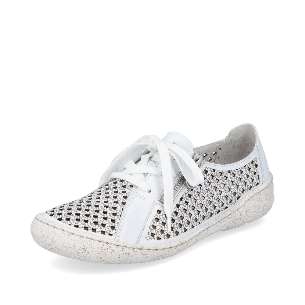 Dámské polobotky v bílé barvě značky Rieker. Svršek je zdoben zajímavým vzorem, který je doplněn perforováním. Z boku obuvi zip pro snadnější obouvání. Poddešev je díky technologii Antistess lehká, flexibilní, absorbuje nárazy při došlapu a snado se přizpůsobí každé noze.