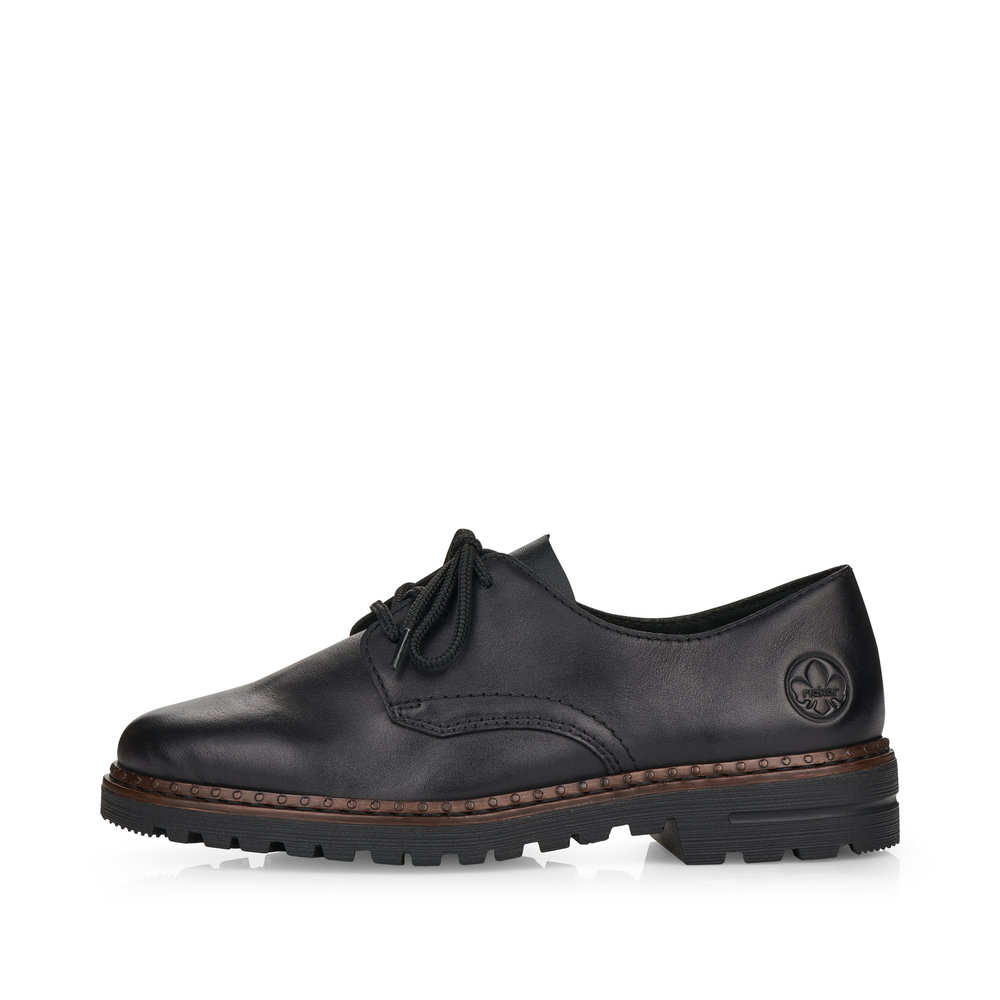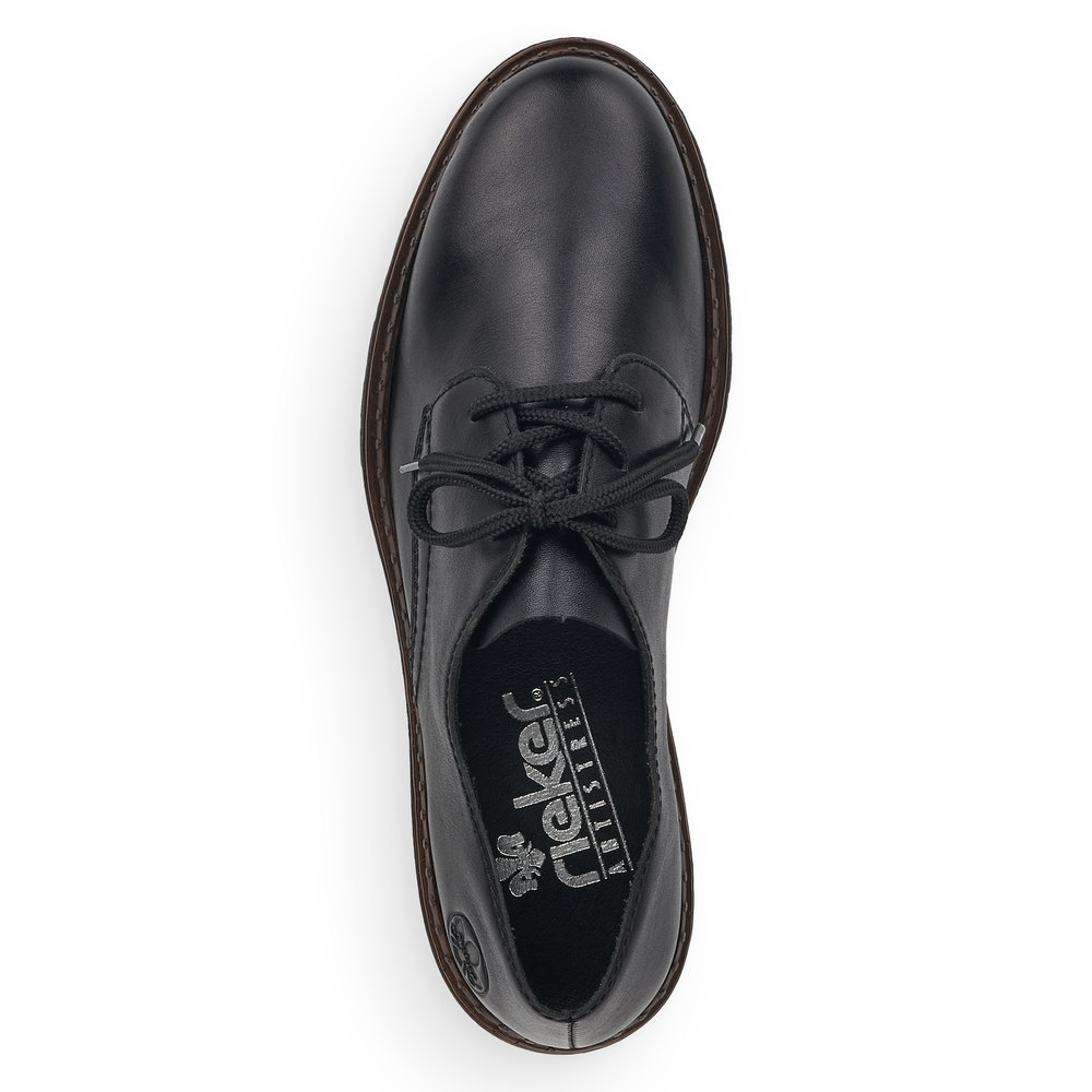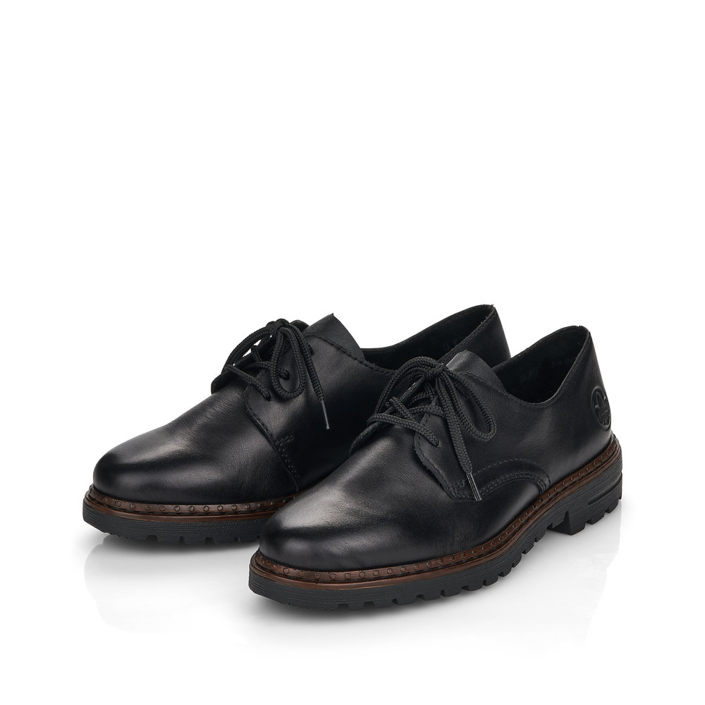 Dámské šněrovací polobotky v černé barvě značky Rieker. Svršek je vyroben z kvalitní kůže. Vnitřní stélka je kožená. Podešev je díky technologii Antistress lehká, flexibilní, absorbuje nárazy při došlapu a snadno se přizpůsobí každé noze.
