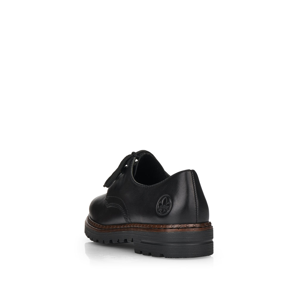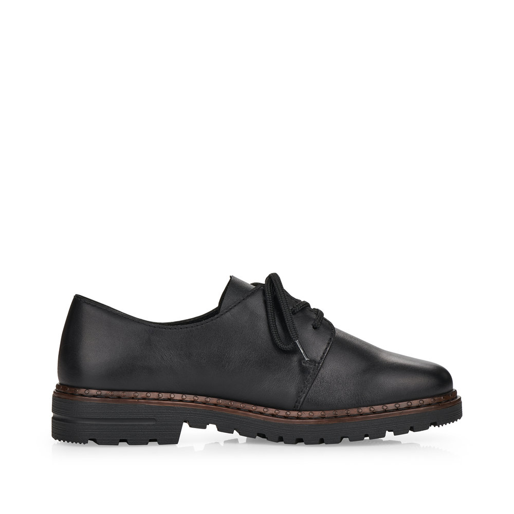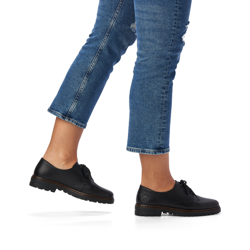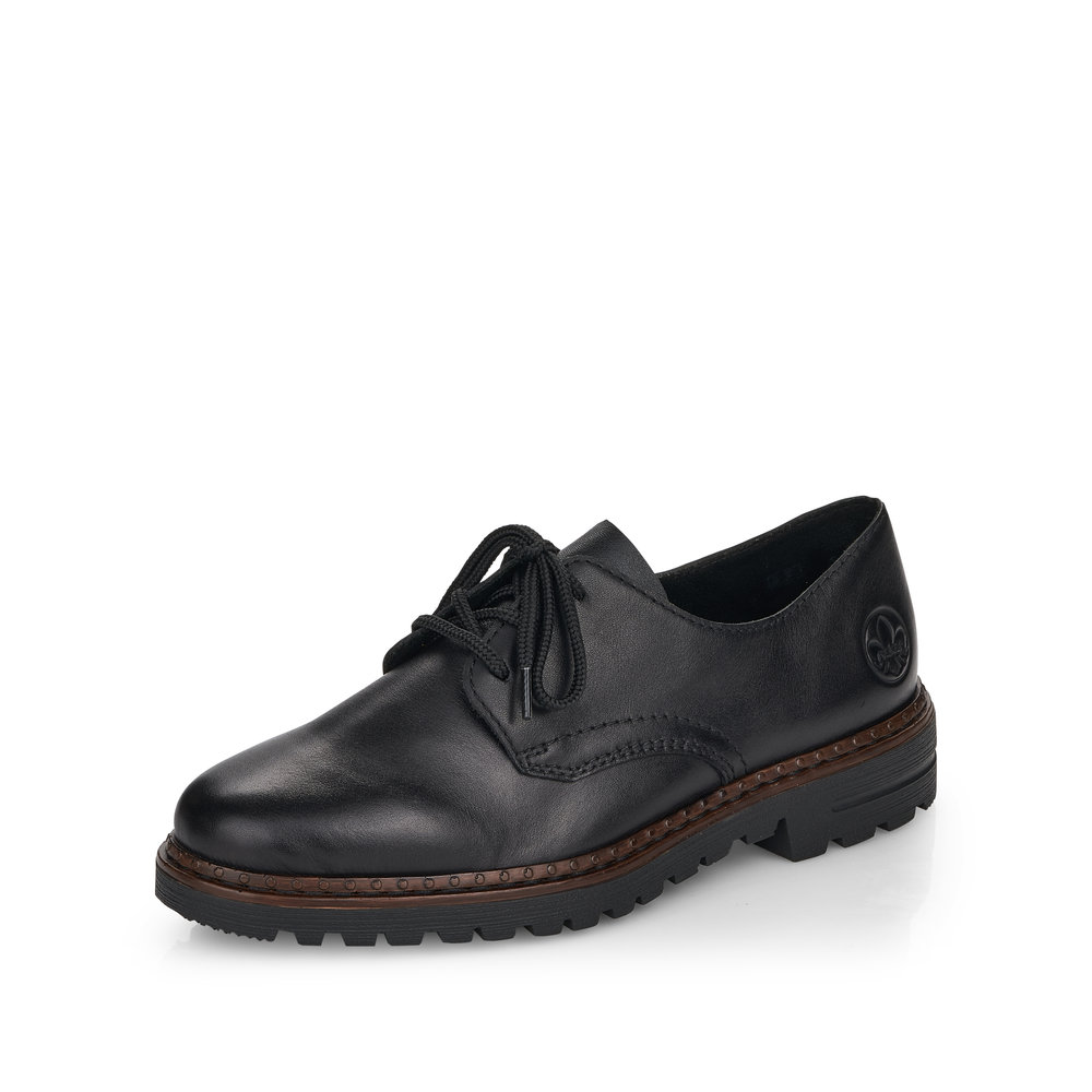 Dámské šněrovací polobotky v černé barvě značky Rieker. Svršek je vyroben z kvalitní kůže. Vnitřní stélka je kožená. Podešev je díky technologii Antistress lehká, flexibilní, absorbuje nárazy při došlapu a snadno se přizpůsobí každé noze.