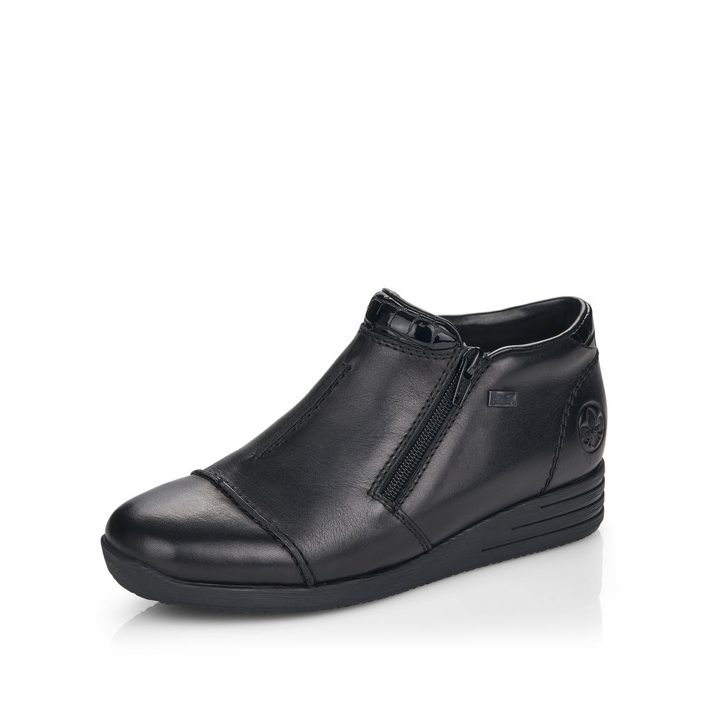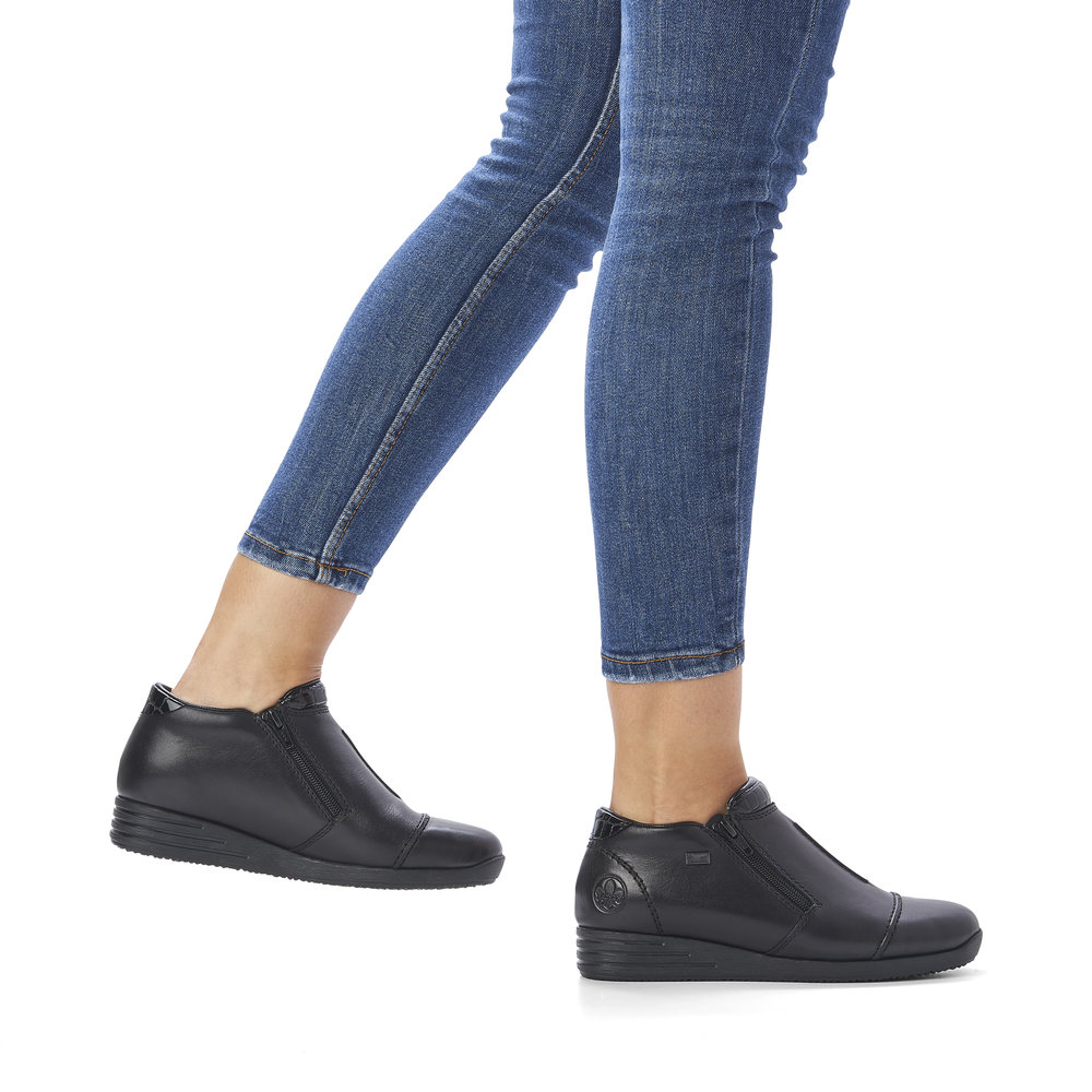 Dámská nízká kotníková obuv v černé barvě značky Rieker. Obuv si snadno nazujete díky funkčním zipům po stranách obuvi. Pocit pohodlí i v chladných dnech Vám zajistí zateplená podšívka. Díky technologii Rieker TEX je bota nepromokavá a přesto prodyšná. Podešev je lehká, flexibilní, absorbuje nárazy při došlapu a snadno se přizpůsobí každé noze.
