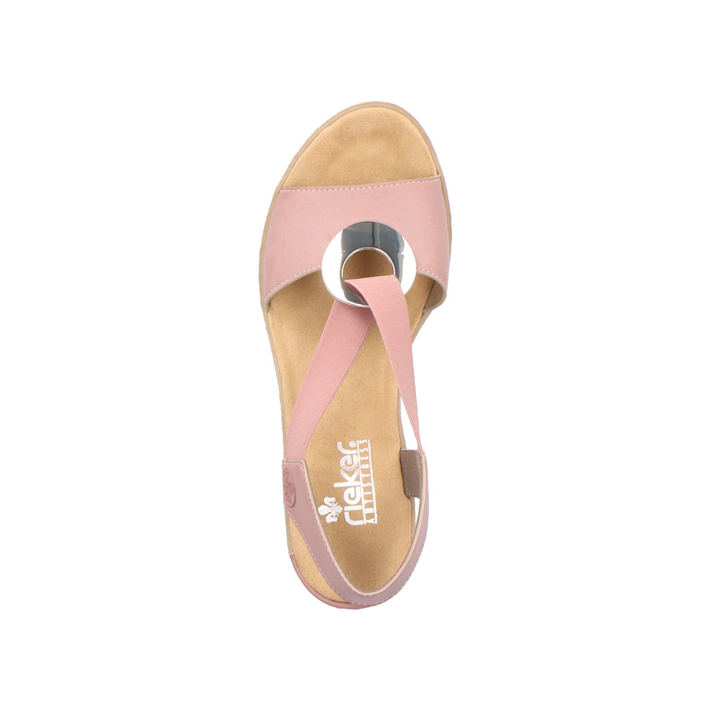Dámské růžové sandály na klínku značky Rieker. Ozdobná kovová aplikace je spojena s pružnou gumičkou, která Vám zaručí snadné a rychlé obouvání. Měkká a pohodlná stélka Vám zajistí, že se budete cítit skvěle po celý den.