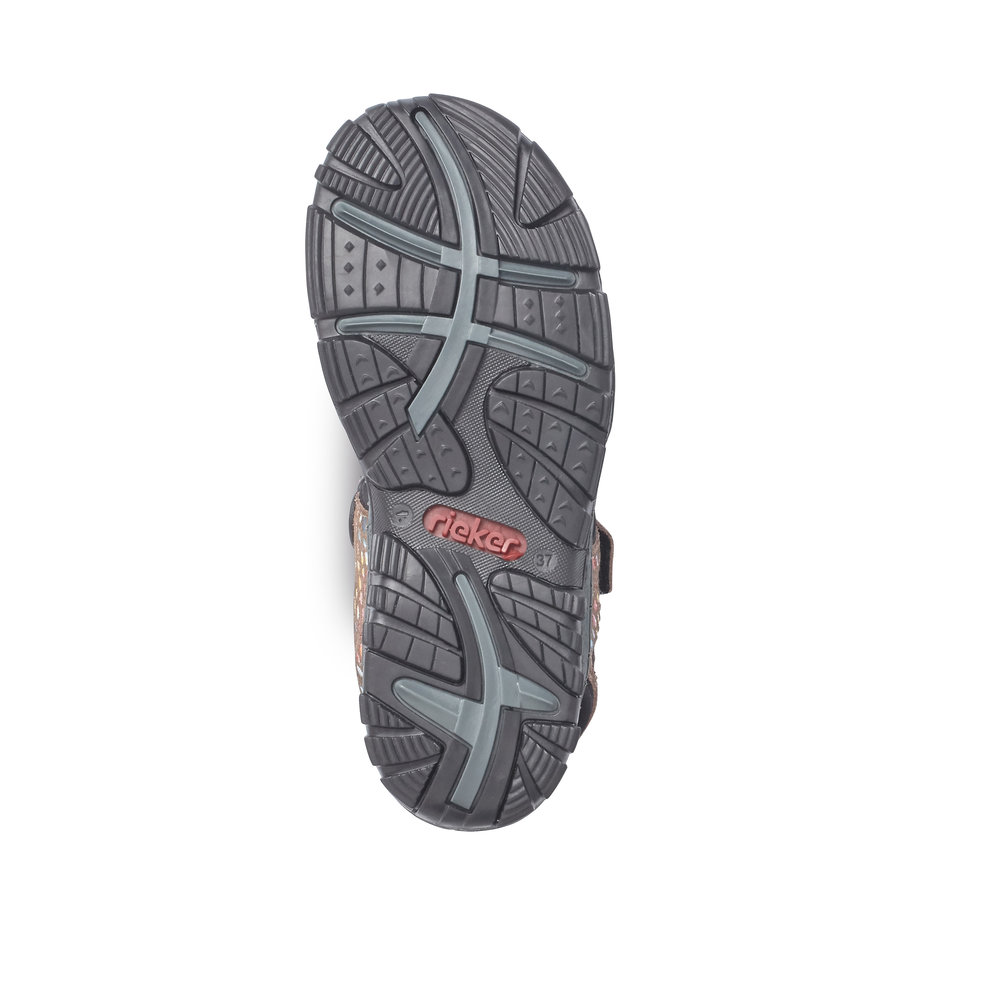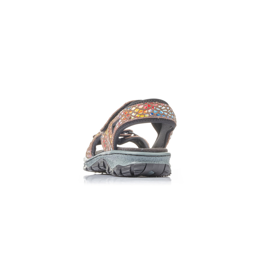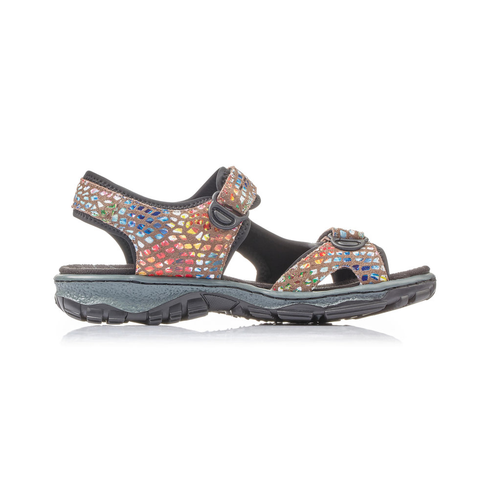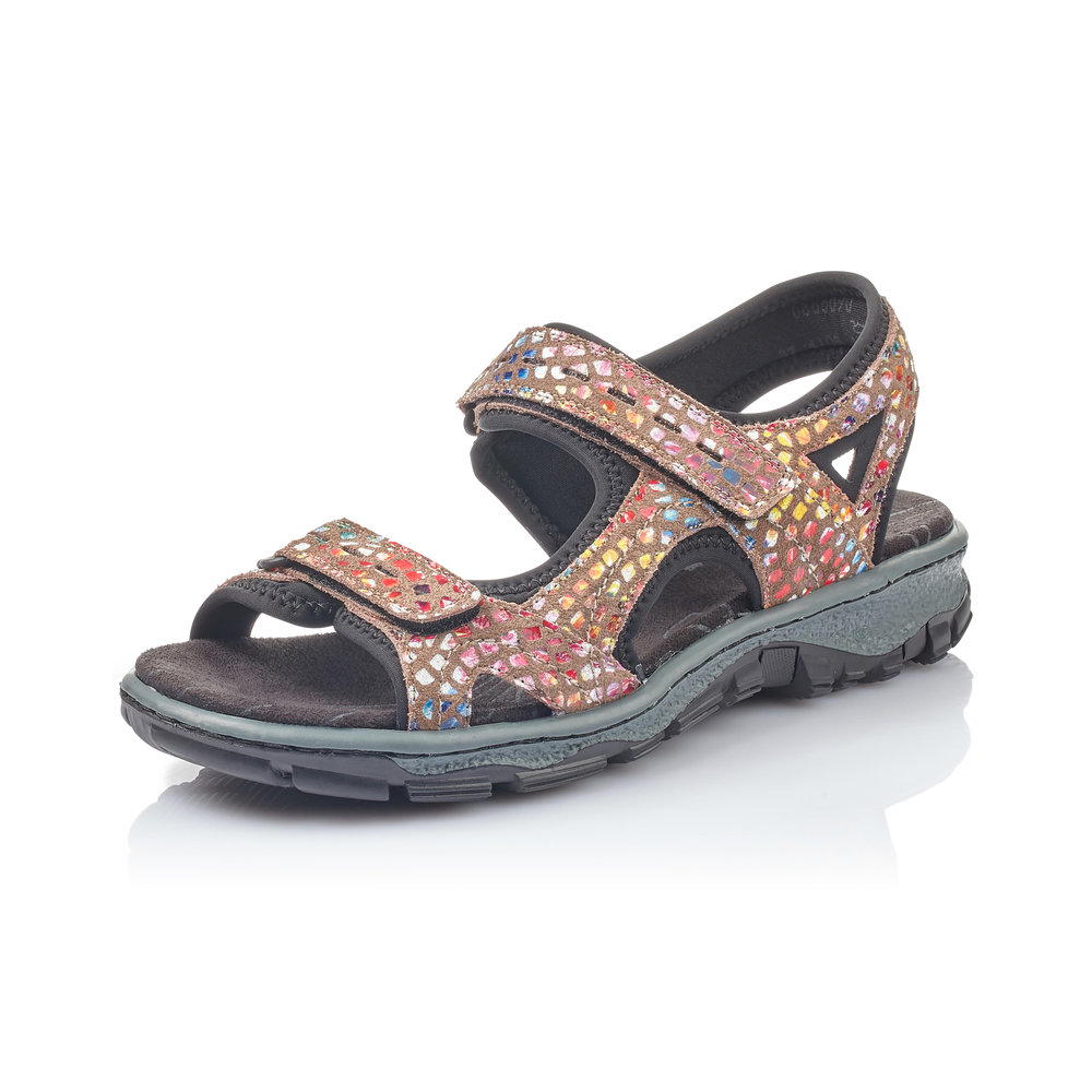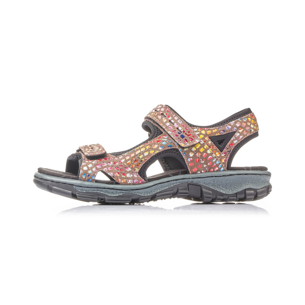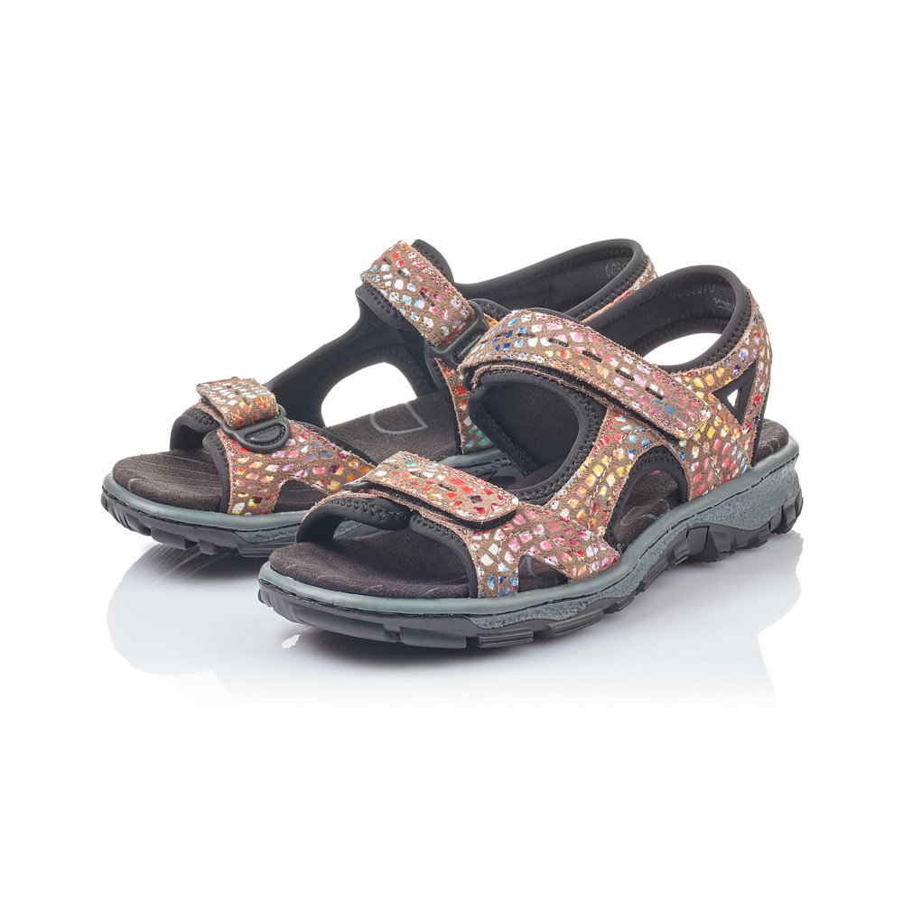 Dámské sportovní sandály, v barevném provedení, s hnědým podkladem, jsou vyrobeny z kůže a syntetiky. Díky praktickým páskům na suchý zip si můžete obuv přizpůsobit vlastní noze. Měkká stélka a lehká flexibilní podešev zajistí pohodlí při chůzi. Obuv absorbuje nárazy a otřesy při došlapu a přizpůsobí se každé noze.